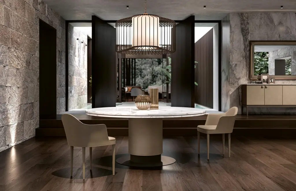 A round dining table with a marble top, featuring a saddle leather-wrapped structure and a metal base. The table's elegant marble surface gives it a sophisticated, timeless look, while the saddle leather-covered frame adds warmth and texture. The metal base provides sturdy support and a modern touch, enhancing the overall esign with a sleek, contemporary feel. Perfect for both formal and casual dining spaces, this table blends luxury and durability seamlessly.