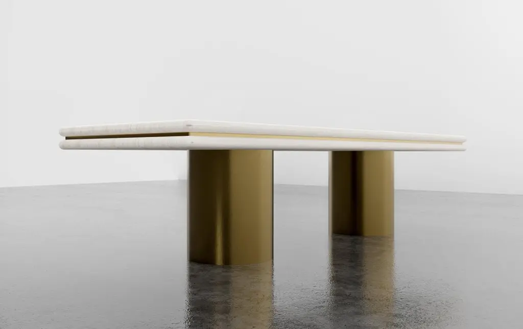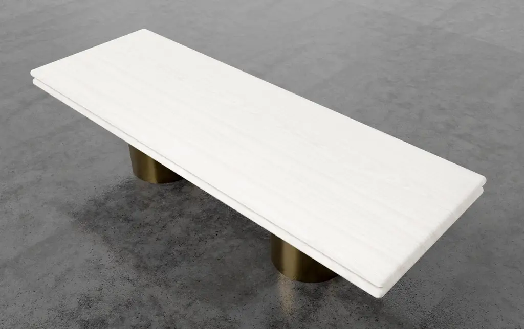 STACKED DINING TABLE - Modern Wooden Dining Table with Metal Inlay and BasesThe Stacked Dining Table is a modern piece of furniture that draws inspiration from the 1970s vernacular. The sleek and minimal design of the table is complemented by a bleached white oak finish and dark bronze metal inlay, creating a striking contrast that adds visual interest to the piece. The metal bases add a touch of sophistication and ensure stability while you dine.Each Stacked Dining Table is fully custom and made to order in California, ensuring that you receive a one-of-a-kind piece of furniture that is built to last. The table is available starting at $18,020, making it an affordable luxury addition to your home or office. The Table, as shown, is $21,370 list.The Stacked Dining Table is designed to be both functional and stylish, with a spacious tabletop that can comfortably seat your family and guests. The table is perfect for hosting dinner parties, family gatherings, or just enjoying a casual meal with loved ones.Whether you're looking for a statement piece for your dining room or a functional and stylish table for your office, the Stacked Dining Table is the perfect choice. With its stunning design and impeccable craftsmanship, it is sure to be a timeless addition to your home or office décor.