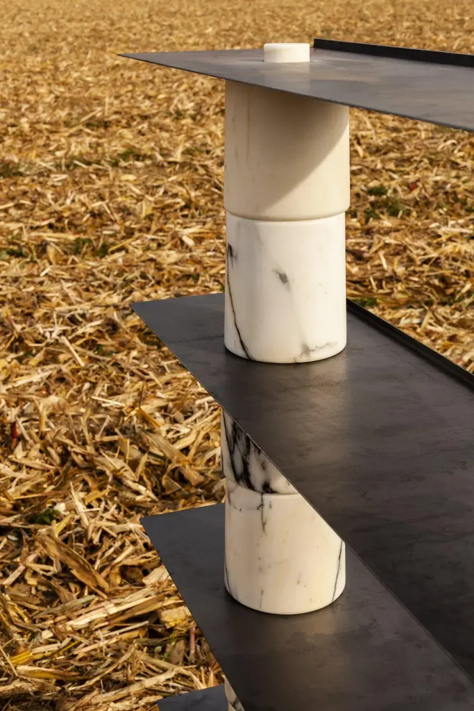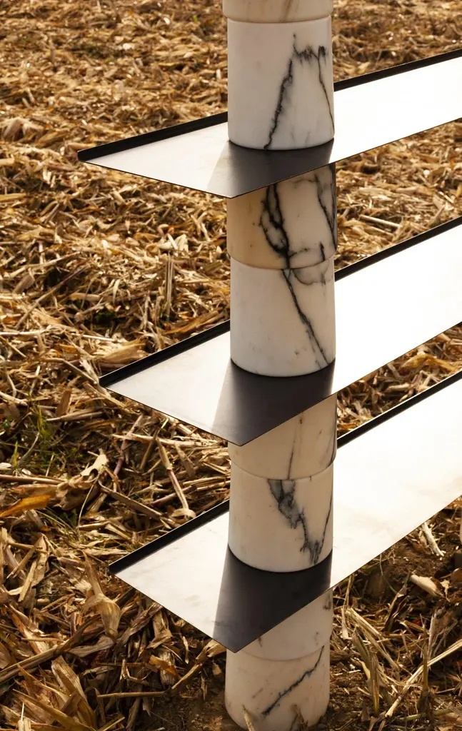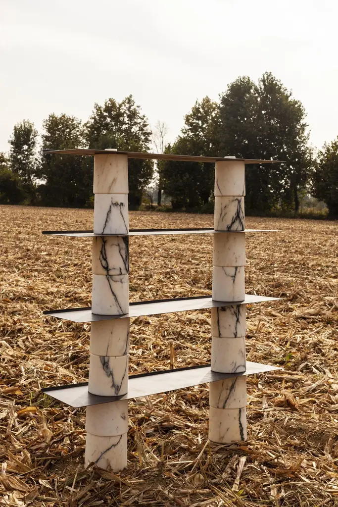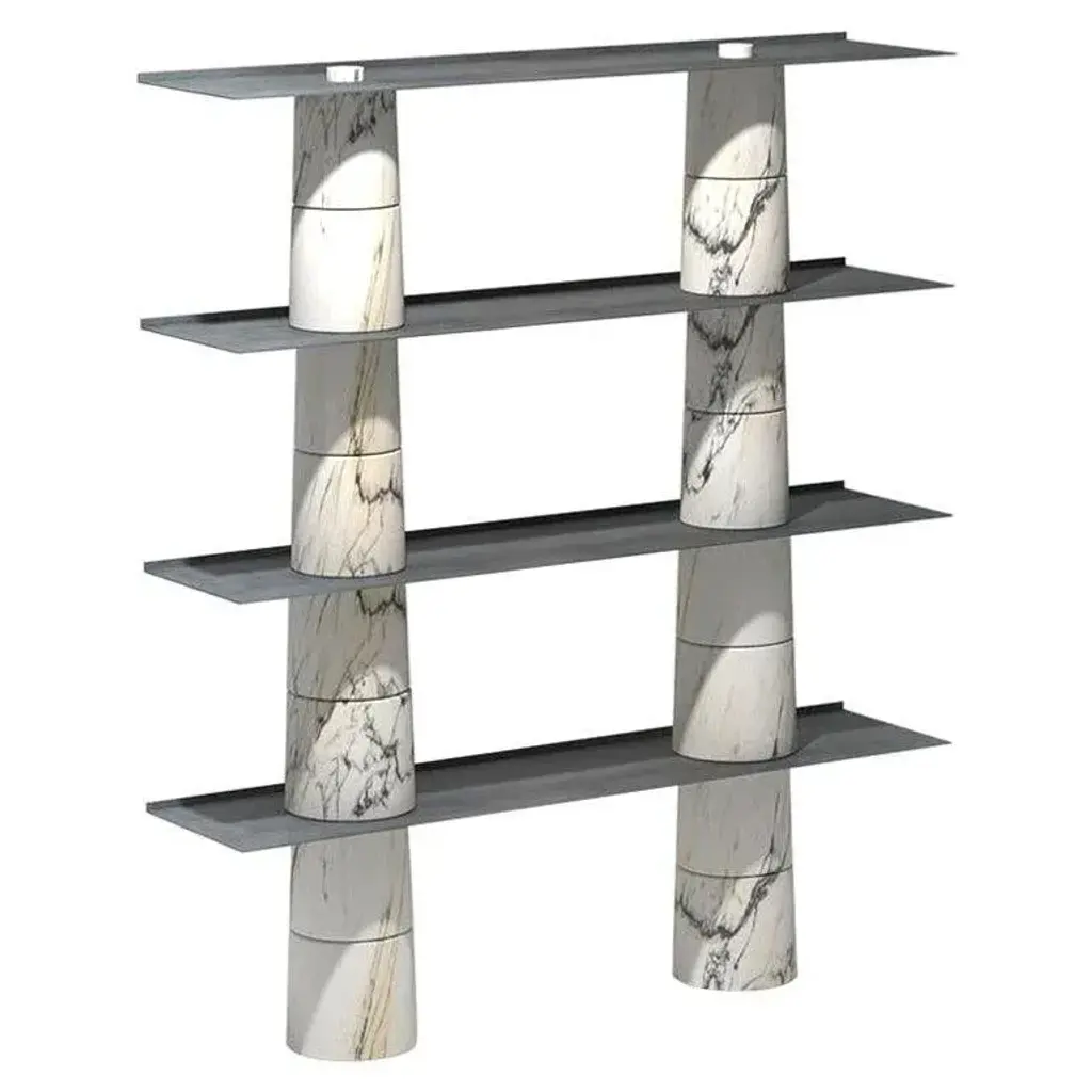 Stacked marble console by Samuele Brianza Dimensions: 130 x 30 x 130 cm Materials: - Paonazzo Marble 16 blocks - Raw waxed steel rectangular top Primo is a modular system made of load-bearing marble elements and shelves that fit together within a simple "male-female" joint. The volumes are tapered solids that can be set up in multiple arrangements which, in combination with stone, metal and glass surfaces, gives form to different furnishing elements with varied silhouettes and heights. The name, easy to pronounce both in Italian and in English, means “first" and draws reference to an early 1990s construction blocks game but especially to the inaugural limited edition collection by Samuele Brianza. The marble blocks are in Paonazzo, a uniquely distinctive Carrara with grey-blue veins on warm white veiled in pink and olive green. Each section is cut from a single marble block and lathed individually by hand. Primo is a console, a coffee-table, a nightstand, a dining table or simply a sculpture handcrafted and made in Italy.
