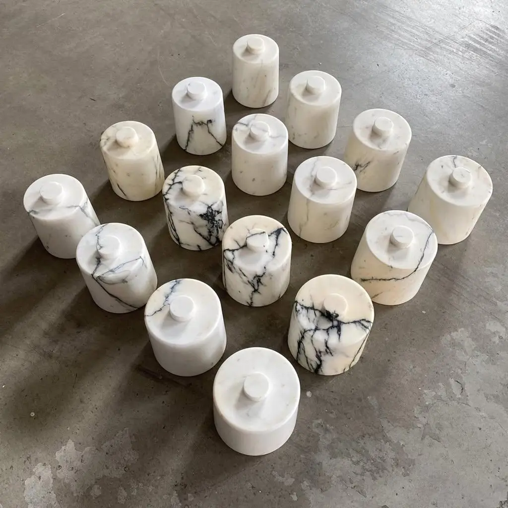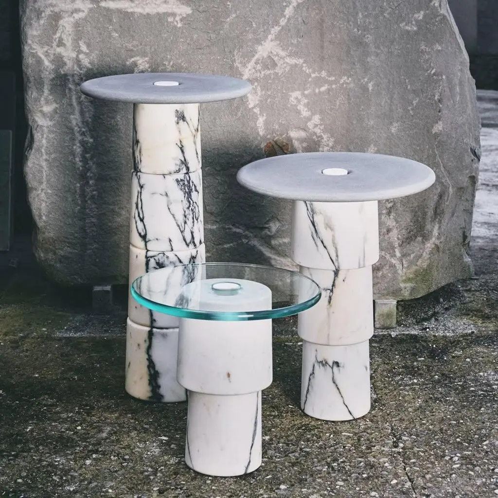 Stacked marble console by Samuele BrianzaDimensions: 130 x 30 x 130 cmMaterials: - Paonazzo Marble 16 blocks- Raw waxed steel rectangular topPrimo is a modular system made of load-bearing marble elements and shelves that fit together within a simple "male-female" joint. The volumes are tapered solids that can be set up in multiple arrangements which, in combination with stone, metal and glass surfaces, gives form to different furnishing elements with varied silhouettes and heights. The name, easy to pronounce both in Italian and in English, means “first" and draws reference to an early 1990s construction blocks game but especially to the inaugural limited edition collection by Samuele Brianza. The marble blocks are in Paonazzo, a uniquely distinctive Carrara with grey-blue veins on warm white veiled in pink and olive green. Each section is cut from a single marble block and lathed individually by hand. Primo is a console, a coffee-table, a nightstand, a dining table or simply a sculpture handcrafted and made in Italy. Samuele Brianza is an Italian born New York and Milano based architect and interior designer with 15+ years combined experience in residential, retail, and event production design and management. For over 12 years, he focused his career in retail working for three different major companies delivering over 1,500 points of sale worldwide with a clear and proven ability to translate aesthetic and brand essence into store environments. He has been responsible for the store concept research, design, development, implementation and value engineering for seven different fashion labels. He has a strong commercial acumen to finalize spaces that generate traffic and maximize commercial objectives, focusing on the customer space experience and brand heritage. For the past three years Samuele is freelancing as architect, interior decorator and set designer both for residential and commercial spaces working for private clients and cooperating with major brands such as Bulgari Louis Vuitton, Diane Von Furstenberg to mention some. In Fall 2020 Samuele launched his first product design limited collection named PRIMO a marble, stone, metal and glass modular system made of load-bearing elements and shelves that gives form to different furnishing elements with varied silhouettes and heights.