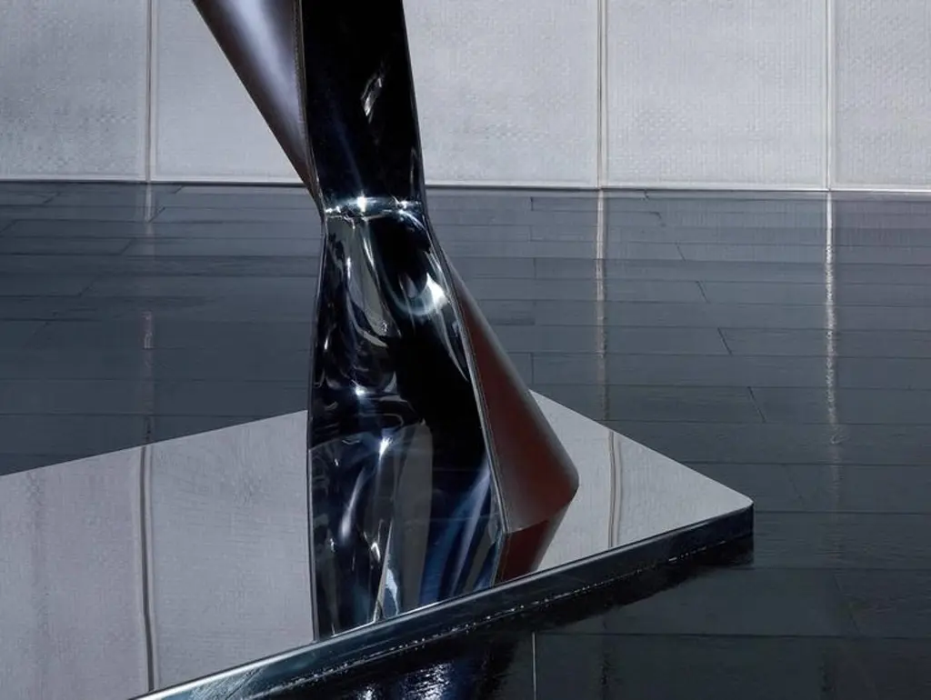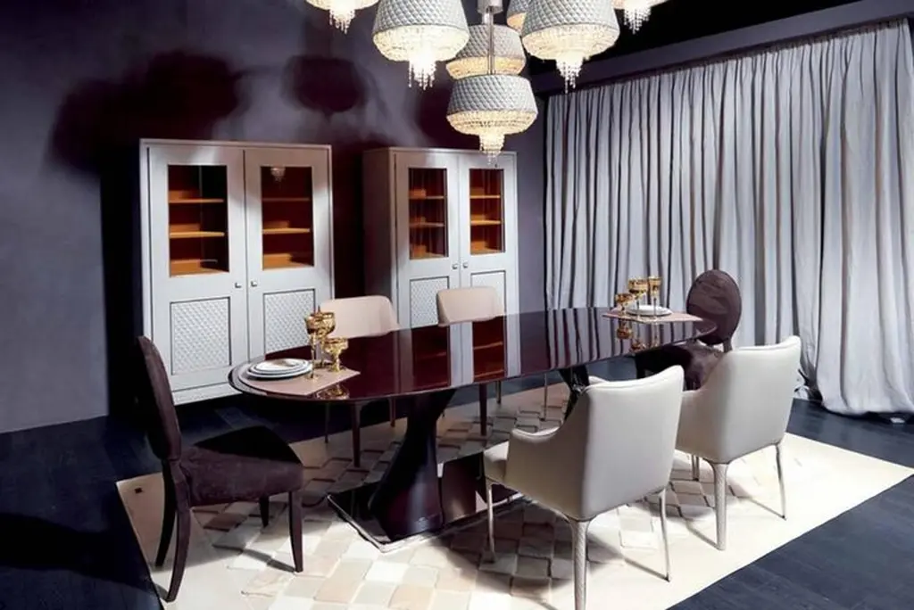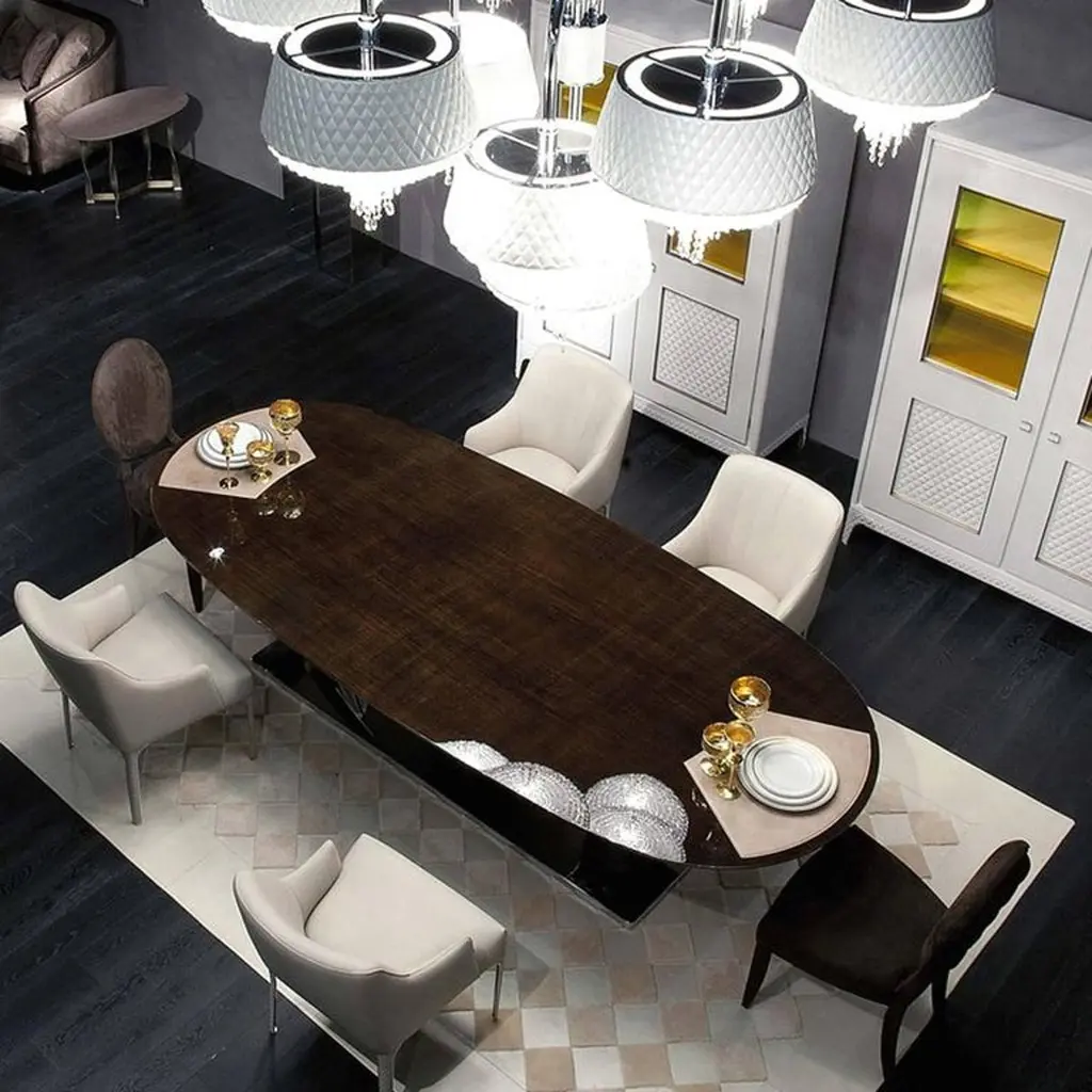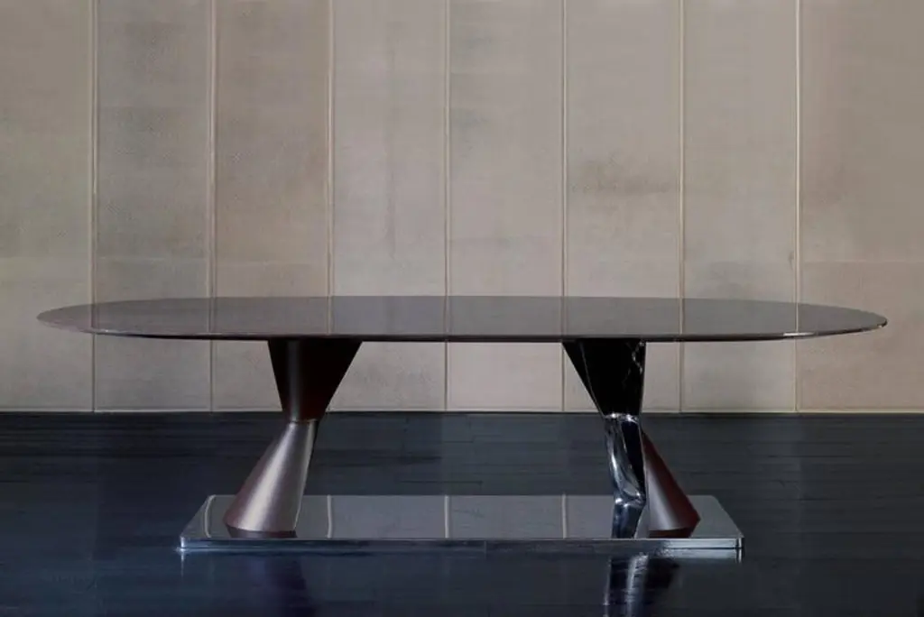 Dining table stars with lacquered solid wood topand bronze base with stainless steel inside.