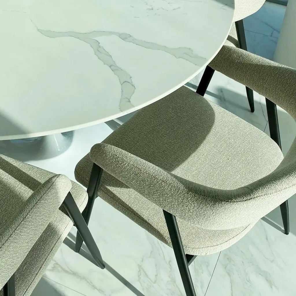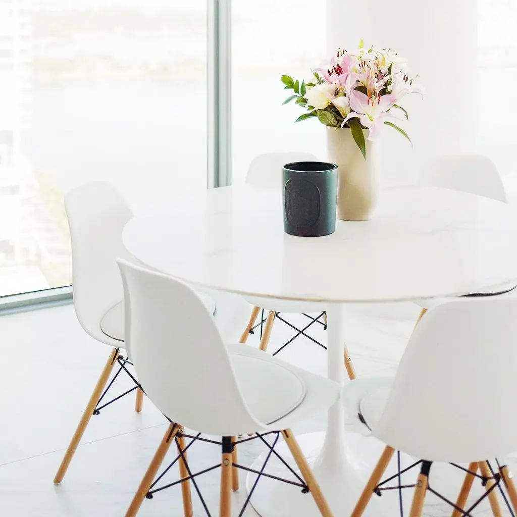 Exclusive to Tulip Table & Eternity Modern! We have a stunning selection of 3 marbleized quartz table tops. Our creative production design team have curated the cleanest, purist style contrasted with soft, yet elegant grey veining designs. The quartz tulip table is truly an exquisite statement piece and an opulent addition to any dining room. Our Calacatta Quartz table tops are made from natural ground quartz with resin and ribbons of pigment resulting in an exquisite marbleized surface. It is highly durable, resistant to cracks, stains and chips with a beautiful gloss finish. And with the stone being non-porous, sealing or waxing is not required! Since Calacatta Quartz is an engineered stone, we are able to control the consistency of the background and veining details, hence also resulting in less material waste!