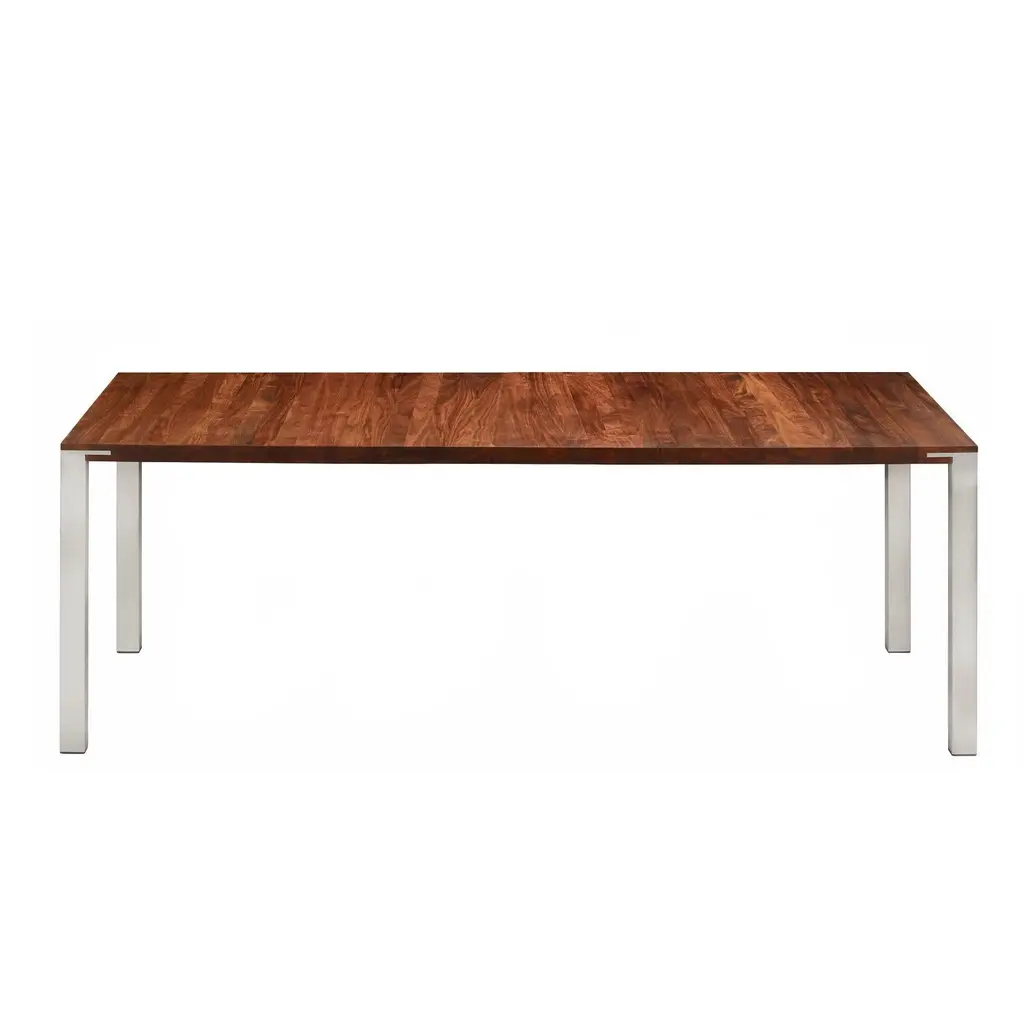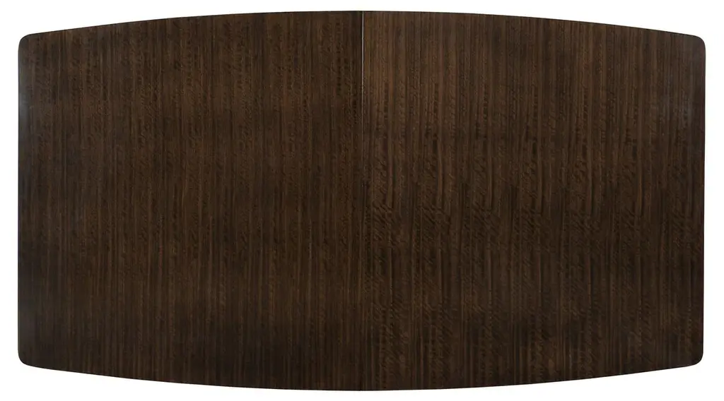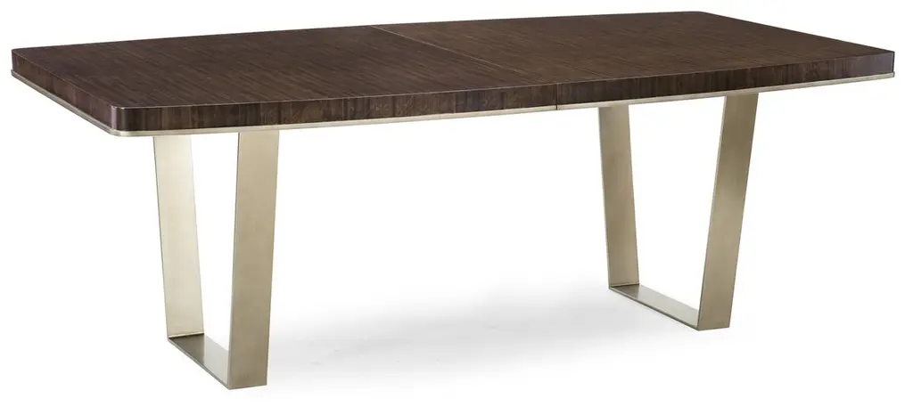 Two angled, smoked bronze metal braces provide sturdy support for this modern design, featuring a rounded-edge rectangular top crafted of fumed, figured eucalyptus veneers with a high-sheen, aged bourbon finish and smoked bronze band along the edge. Seats up to ten guests.