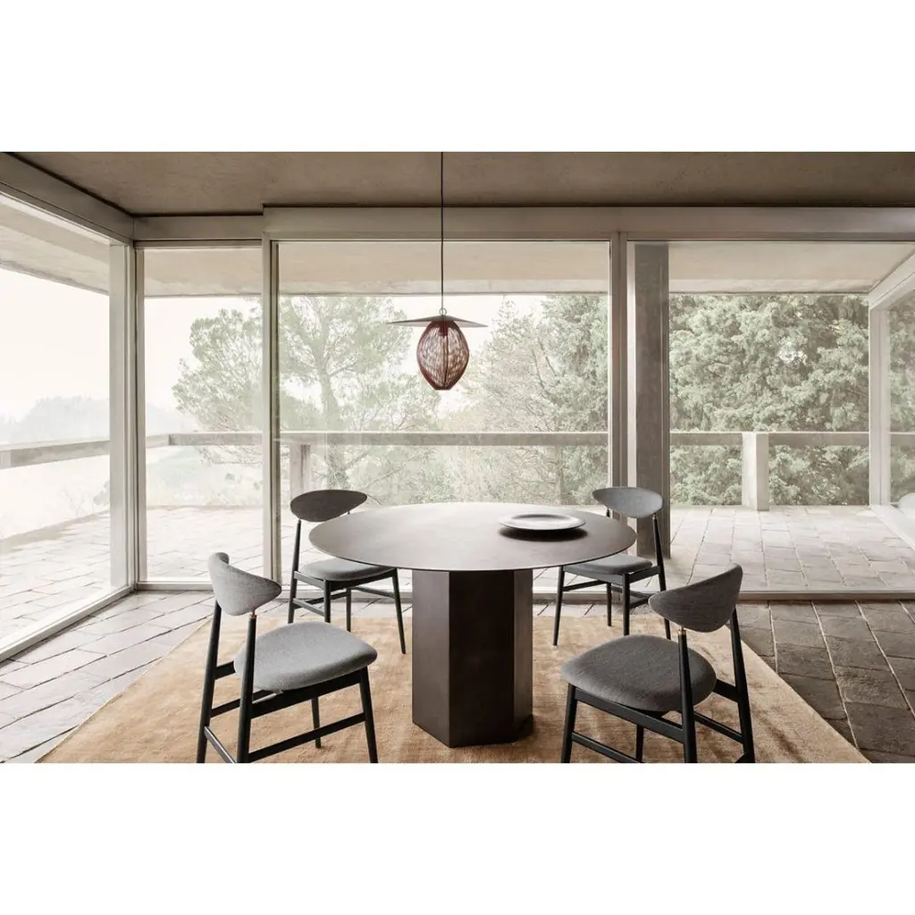 Steel epic dining table by GamFratesi for Gubi in midnight black.Named after the epic poems of ancient times, GamFratesi’s Epic Table for GUBI is a sculptural piece of furniture inspired by Greek columns and Roman architecture. With versions made in Italy from travertine stone, the table's steel variant marks the first time GamFratesi has worked with steel plates, which are galvanized, lacquered, and then treated with a series of hand-finishing processes to create a unique surface expression for each table.The table’s monolithic form remains, now with an industrial expression, in which a new detail can be discovered with every use. The collection brings personality to private settings and an intriguing sense of weight and tactility to public and hospitality spaces, where its resilient surfaces offer exceptional levels of durability.The varying heights and diameters and finishes within the Epic Table Collection mean a single monochromatic table can stand alone or be combined in dynamic clusters of varying material, height and color.Price per item. Available in unlimited quantities.In stock lead times 12-16 weeks. Out of stock lead times can add additional 12-16 weeks. Availability subject to change without notice. For time-sensitive orders, kindly inquire prior to purchasing.Please note that these pieces must ship directly from GUBI's order fulfillment warehouse, so 1stDibs shipping, white glove delivery, or local pickup is not an option. Shipping cost quoted is per item and cannot be combined.Made to order. All sales final.