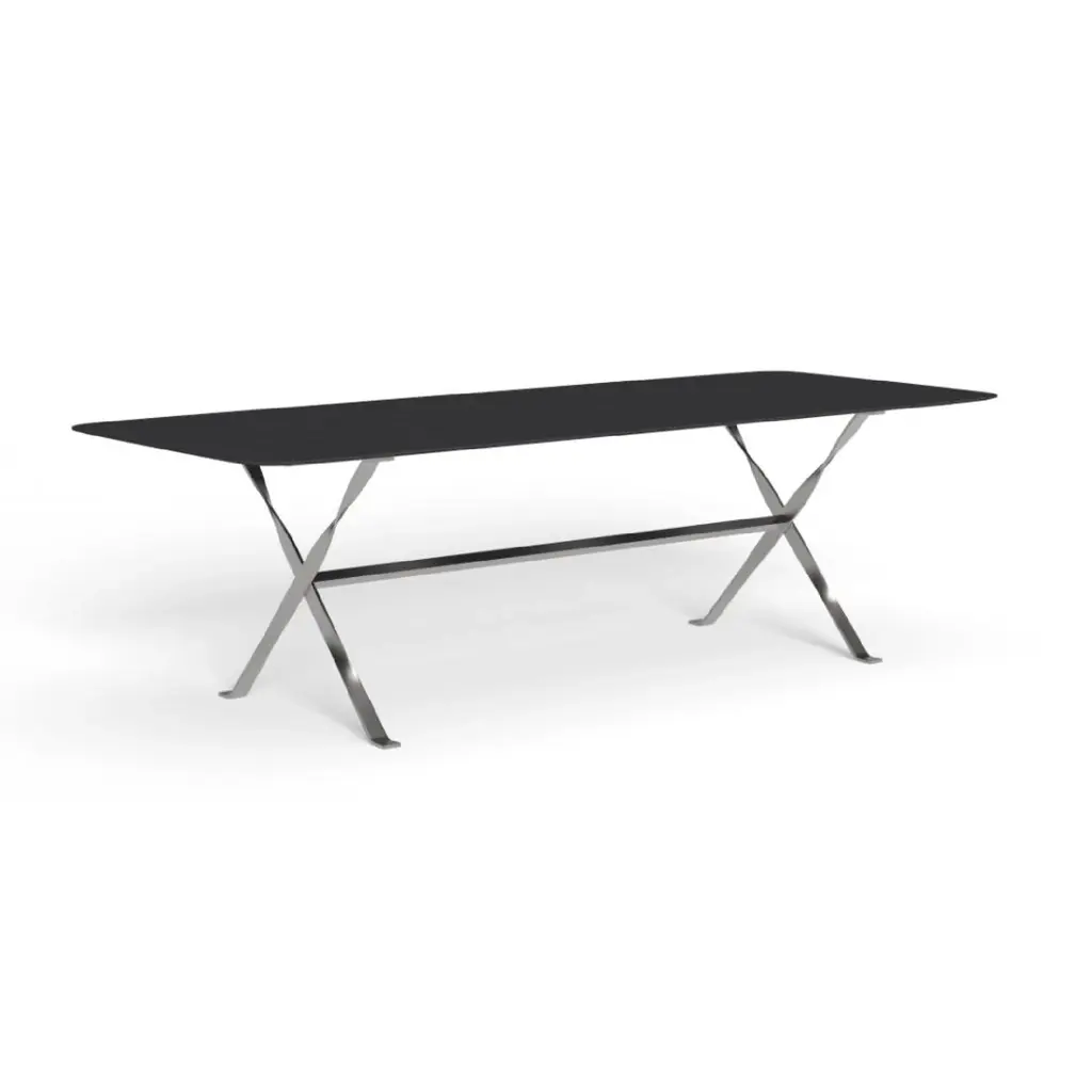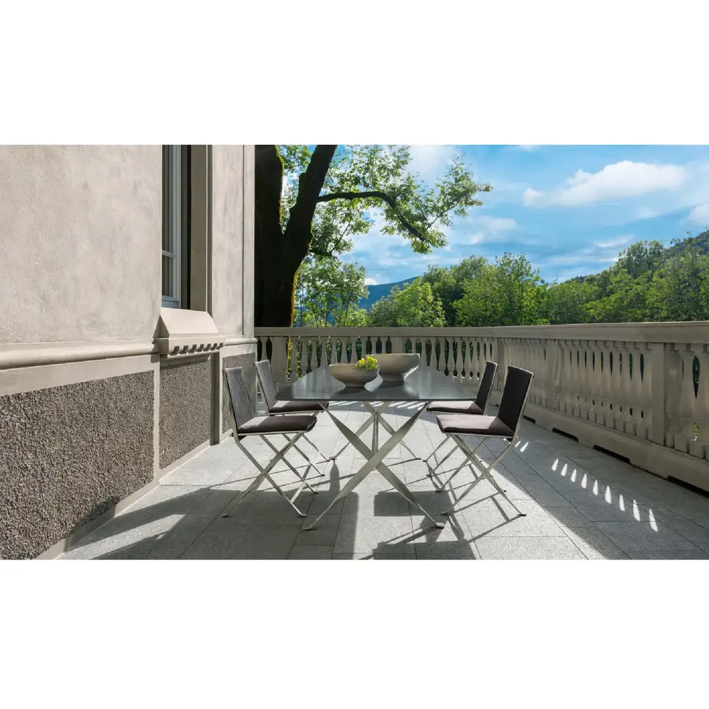 The meticulous attention to the choice of raw materials to produce the George dining table makes it perfect for a valuable outdoor living space. The square top, in accoya wood or lava stone availabe in different colors, is supported by a stainless steel structure.