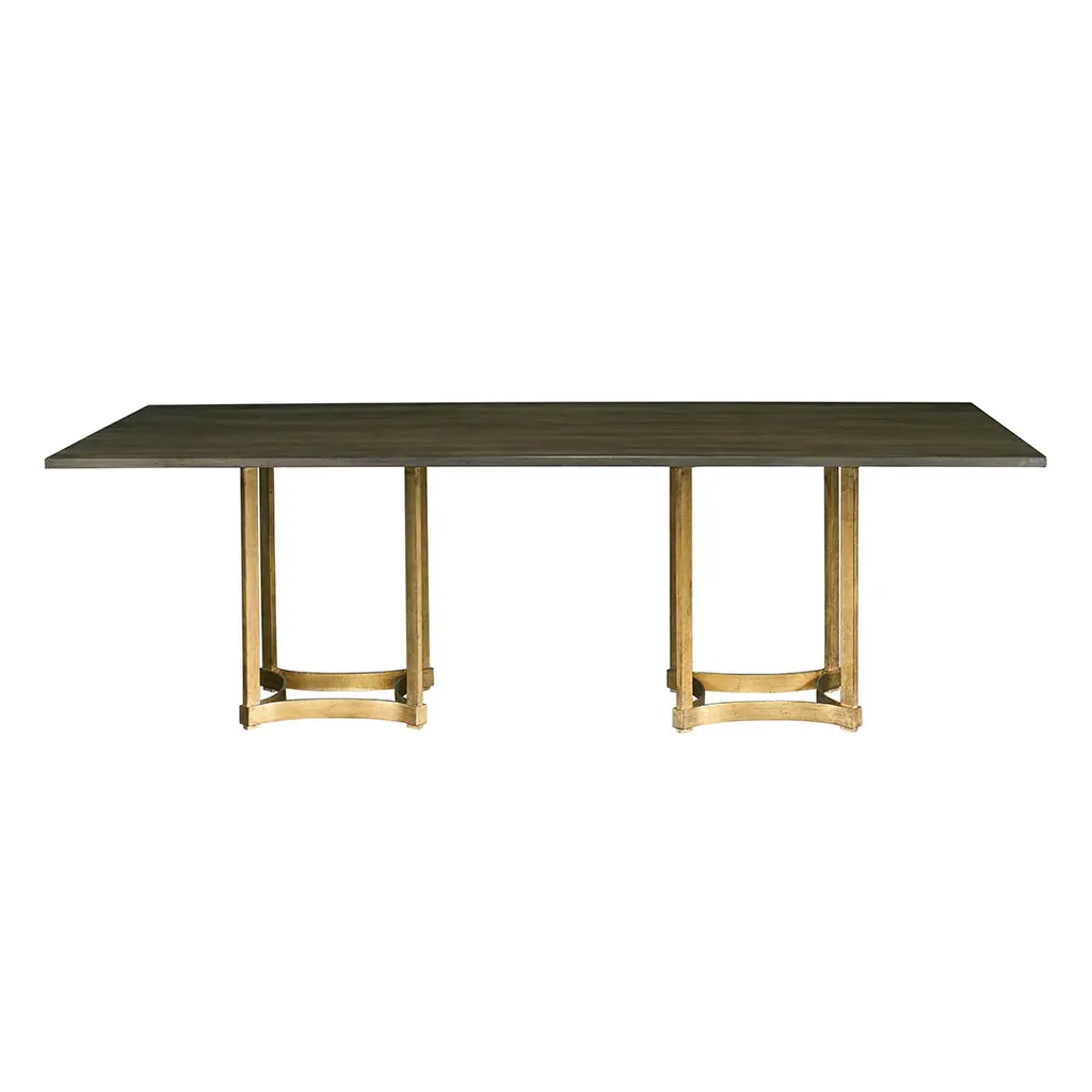 Solid metal pedestal base designed for its functionality as a single base to an elegant entry table or round or square dining table. Used in multiples the base can support a very large top. All metal in a handsome brushed gold finish. Ships In 10-12 Weeks Wood top Transitional Brushed Gold metal base As Shown Finish: Modern Elm This image is for illustrative purposes only. The colors shown are accurate within the constraints of lighting, photography, and the color accuracy of your screen.