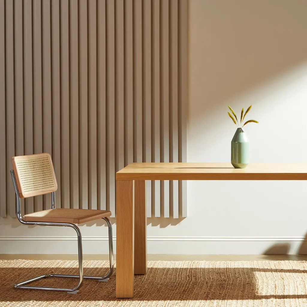 A complement to modern homes and a serene statement in maximalist spaces, the Stenhouse dining table charms with a sleek silhouette. Available in timeless finishes and multiple sizes to seat up to six or eight loved ones, the clutter-free construction is complete with metal rods inside the legs for extra durability. Pared back with purpose, we imagine this handsome dining room furniture topped with ambient candles and linens.