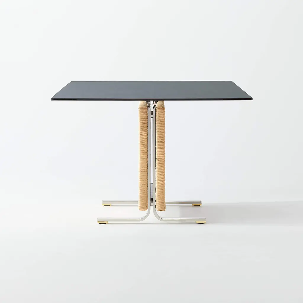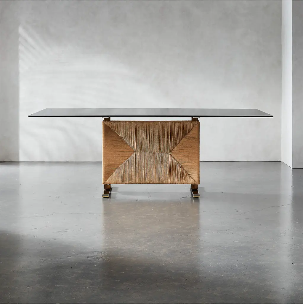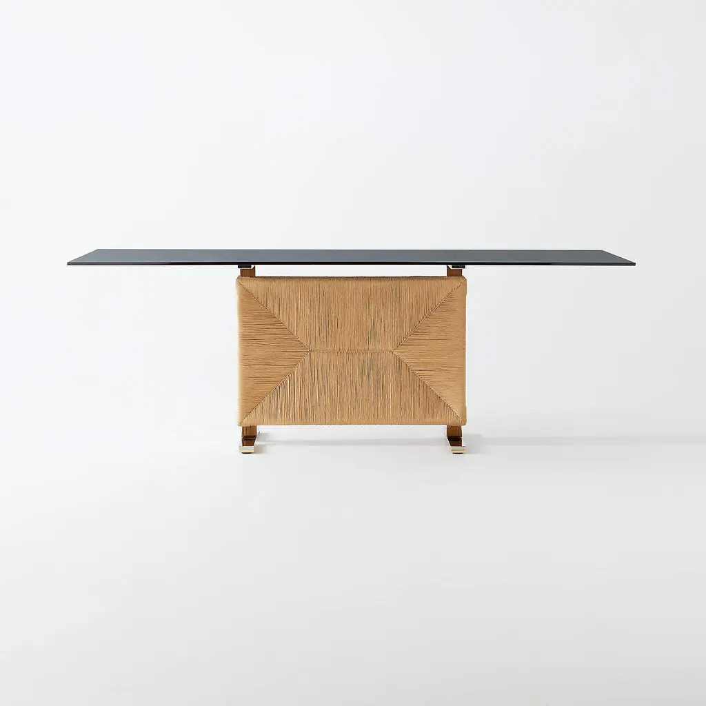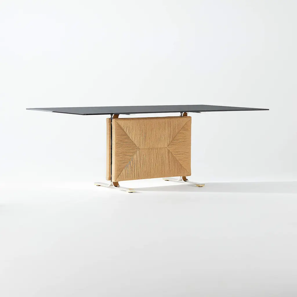 A creative combination of Danish midcentury and '70s modern, Kravitz Design dining table mixes materials to elegant effect. Smokey glass top with smooth radius corners sits atop a ruched base wrapped in Danish paper cord, a traditional Scandinavian material used for weaving seats and seat backs. Polished nickel feet complete the look. CB2 exclusive.