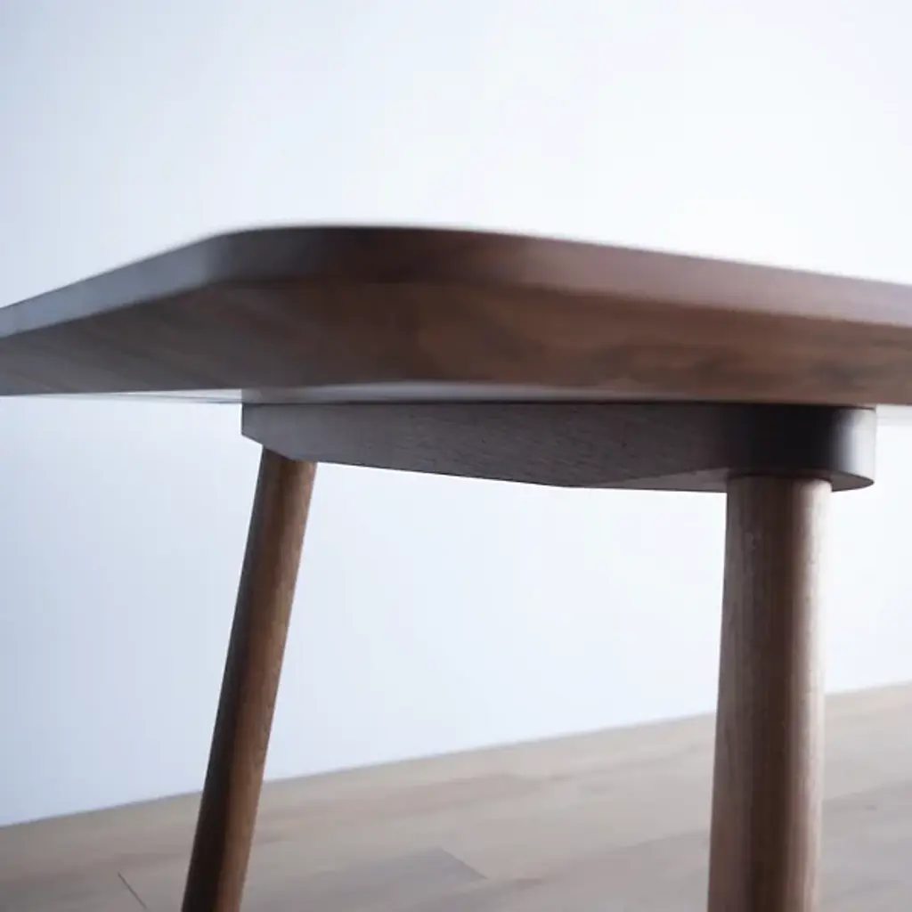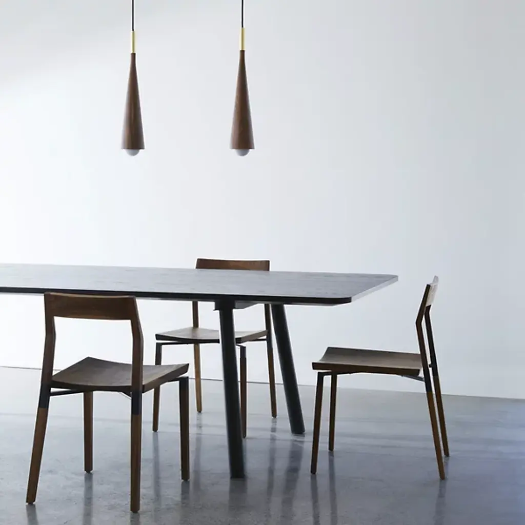 The Sterling Dining Table from hollis+morris offers strength and style in a straightforward contemporary package. The open design lets you show off artistic items in hollis+morris studio spaces and provides plenty of surface area for group gatherings. Developed after an announcement by the Museum of Contemporary Art, it nods at classic design with a hardwood construction that contrasts the angles of its bevel-edged top with outward-reaching legs. The angled legs provide a steady platform for the tabletop, while the woodgrain pattern on display adds a subtle natural note to the otherwise clean surface.
