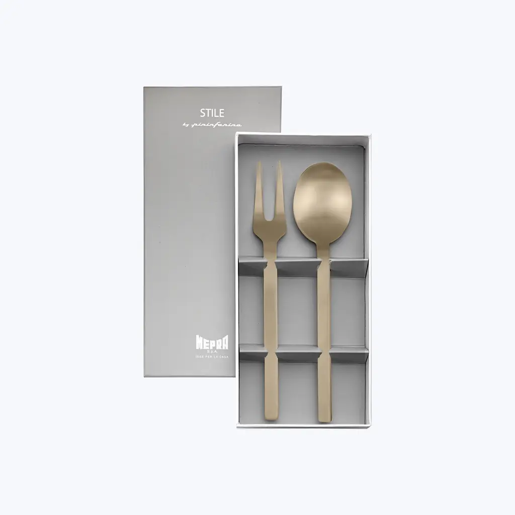 Stile Serveware is made of the highest quality 18/10 steel, 4 mm thick, very durable, and incredibly ergonomic for dinner parties and everyday use. The perfect balance between style ad function, this high-quality Italian serveware brings elegance to the table without sacrificing functionality. Dishwasher and food safe. Created in 1947, Mepra is a family-owned and operated company with a worldwide presence in flatware, cookware, and stainless-steel products. Today, Mepra flatware and kitchenware appear on the tables of the most prestigious hotels, award-winning restaurants, and artisanal-centered homes. Bring the magic of three generations worth of Italian traditions, designs, and lifestyles into your kitchen and dining room today. Stainless Steel plating features a special vintage process that gives it a rustic, warm, and elegant appearance while still being durable and inoxidizable coating. Winners of the 2020 Good Design Award, the Oro and Ice Oro Collections are perfect for the most refined and stylish homes with their pure lines and harmoniously light forms. Ice Bronze and Ice are coated with a PVD Titanium Coating that is tested and guaranteed for more than 3000 washes in a commercial dishwasher. The special Titanium Plating was originally developed by NASA, resulting in a durable and inoxidizable coating like non-other. 7 Piece Full Serving Set includes (1) Serving Fork, (1) Serving Spoon, (1) Salad Serving Fork, (1) Salad Serving Spoon, (1) Soup Ladle, (1) Gravy Ladle, and (1) Cake Server