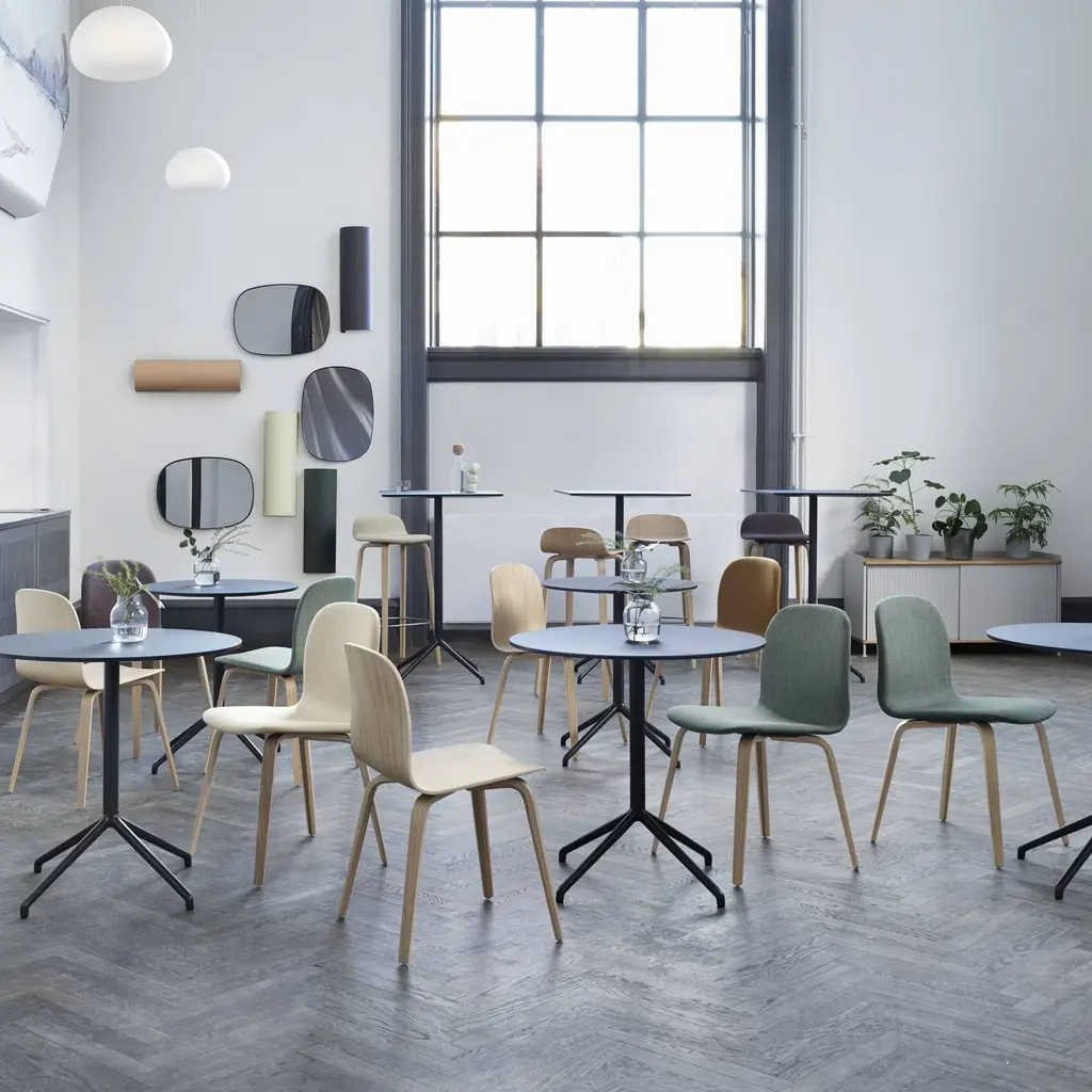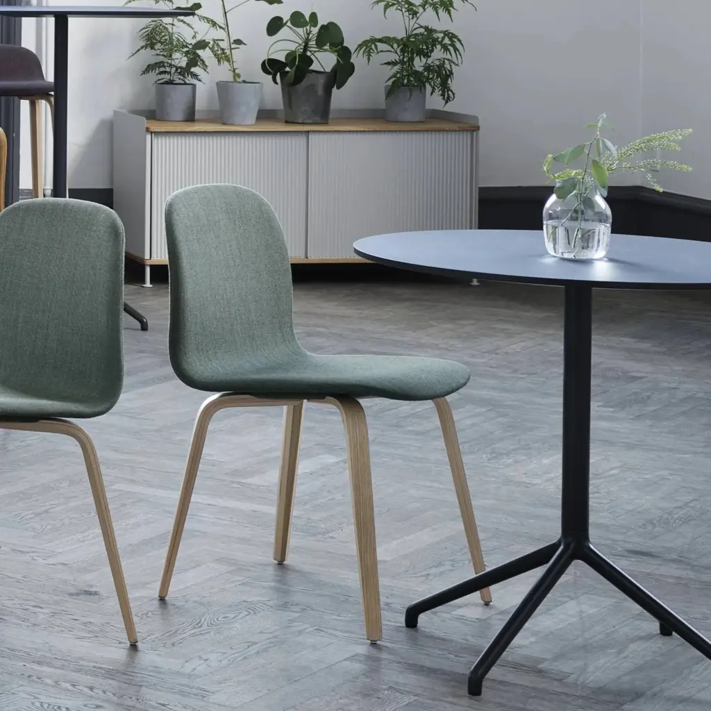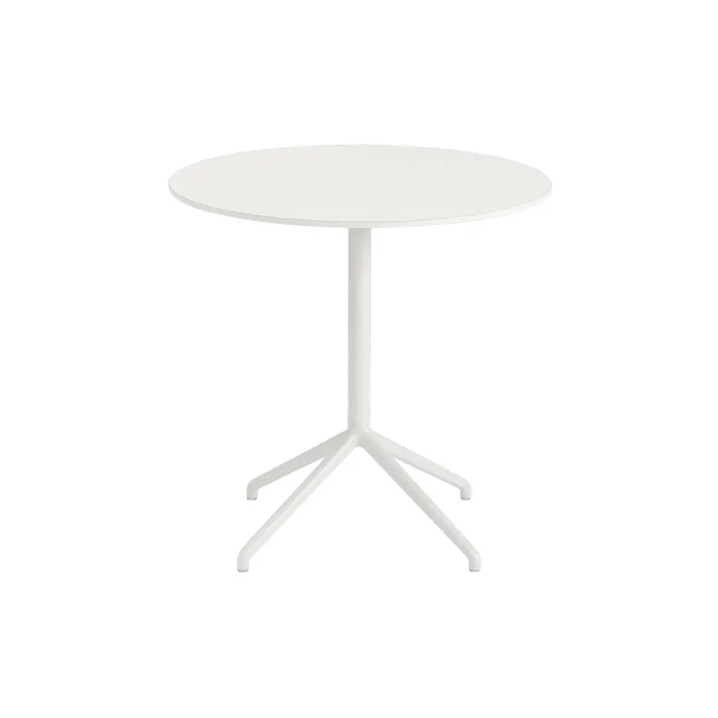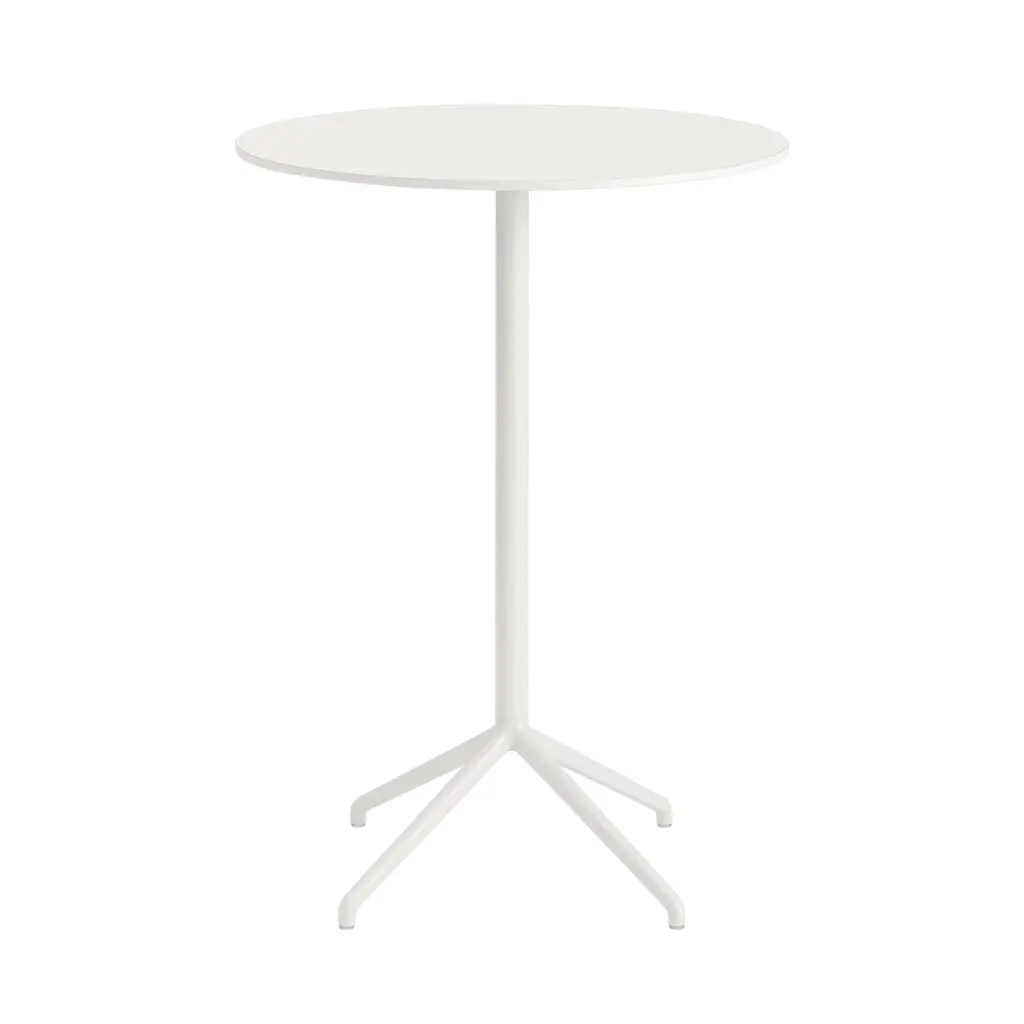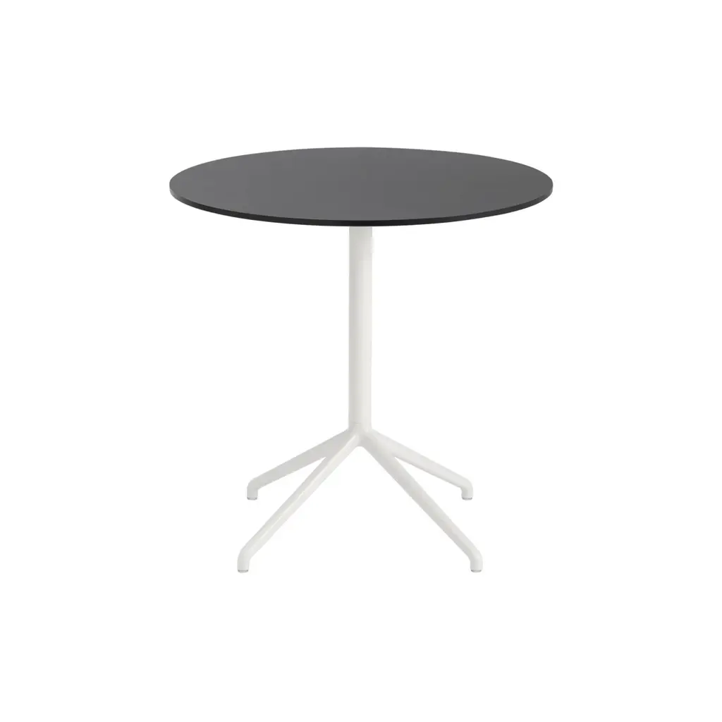 In standard, bar and counter versions, Copenhagen-based designers Iskos-Berlin add a round-tabletop version to their Still series. A crisp graphic silhouette in black defines this superbly functional and unassumingly handsome table with a tubular center column and a 4-legged base in powder-coated steel. The rounded tabletop is available in either nanolaminate or linoleum surface with the refined detailing of angled edges. Still serves a variety of roles in both the home and contract environs—as a kitchen dining spot, in a restaurant or bar, or as an option for a meeting room or the office.