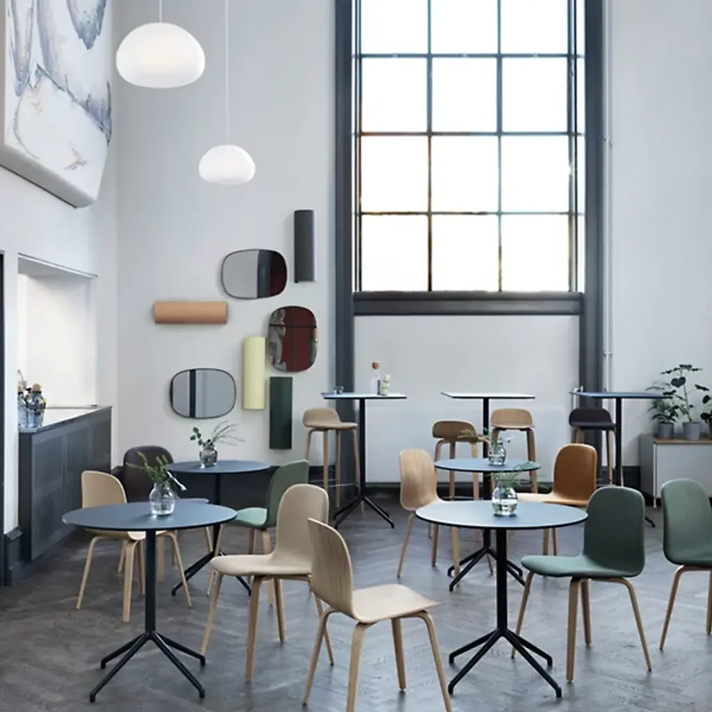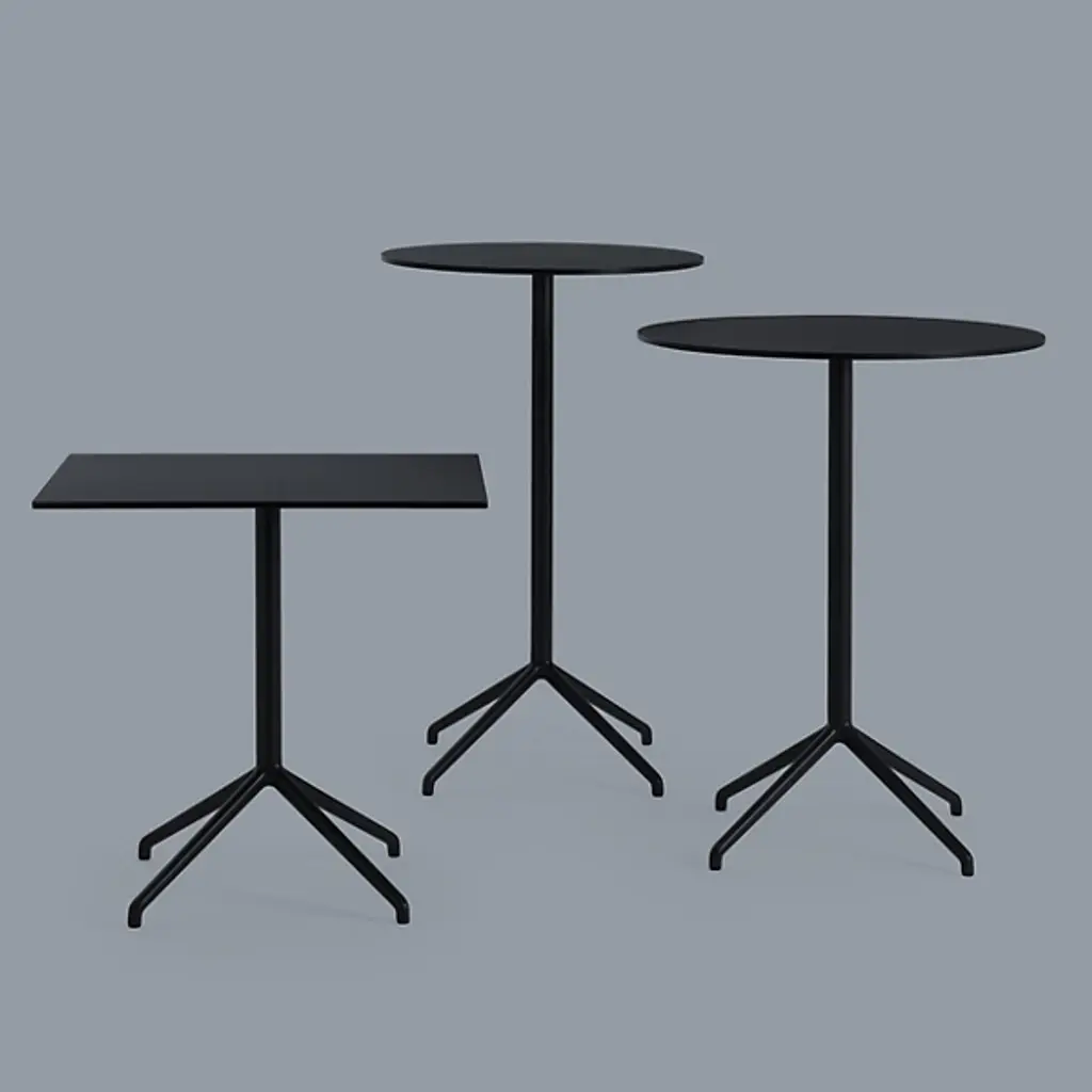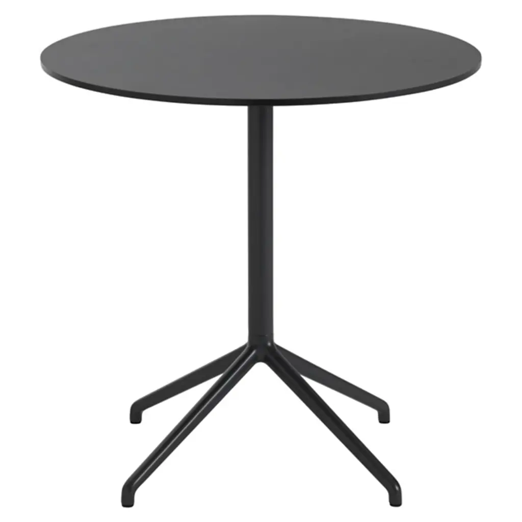 Reliable, expressive, and refined. The Still Round Cafe Table from Muuto offers a sleek, soothing surface suitable for waiting rooms, café corners, or residential dining alike. Starting with a slender, four-legged base made from die-cast aluminum, it extends a central stem of powder-coated steel up to a subdued mounting plate. This juxtaposes a rounded MDF top with painted edges with the slim, though not spindly metal base and body while offering plenty of space for seating to be pushed under it.