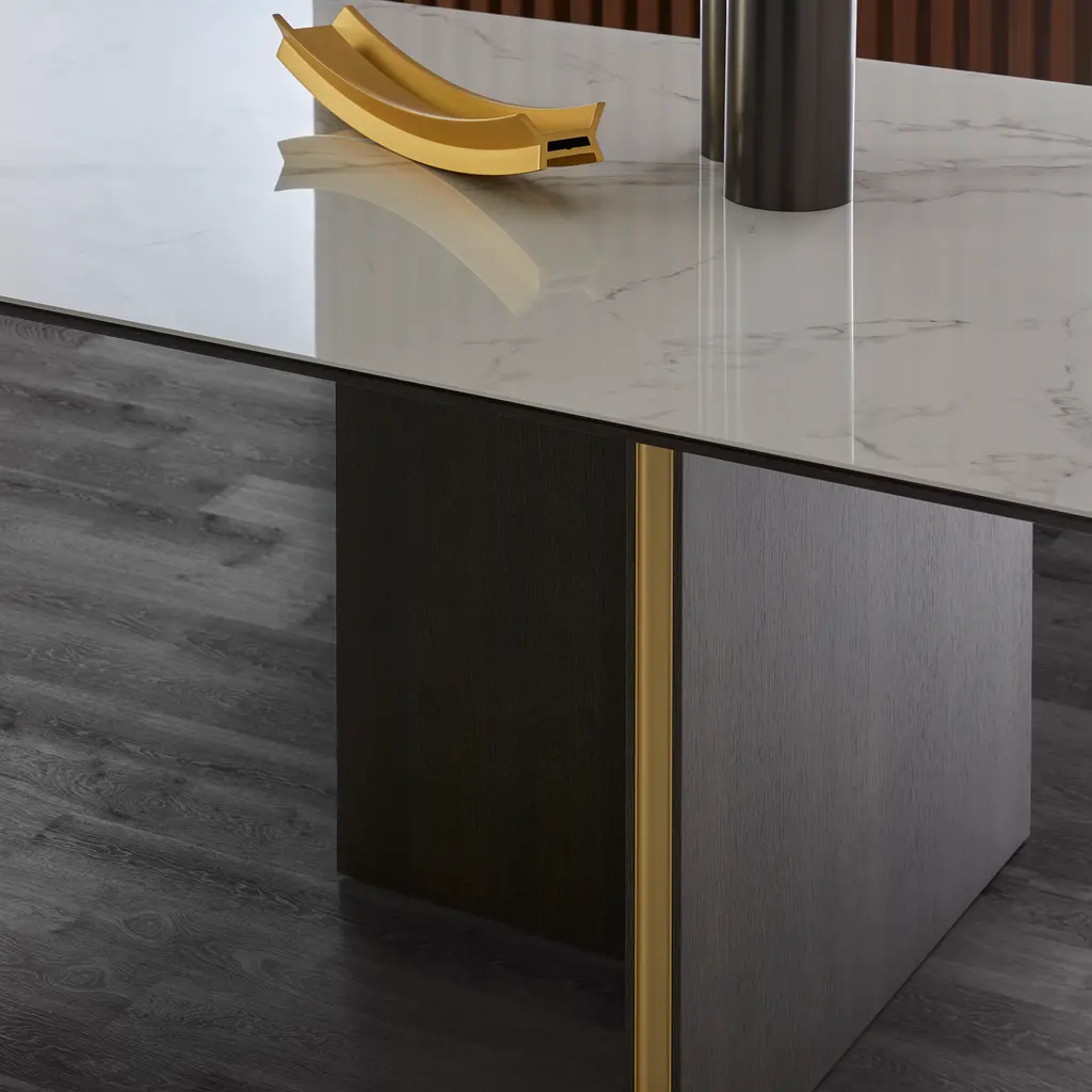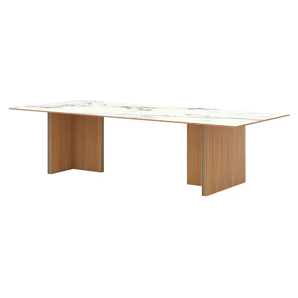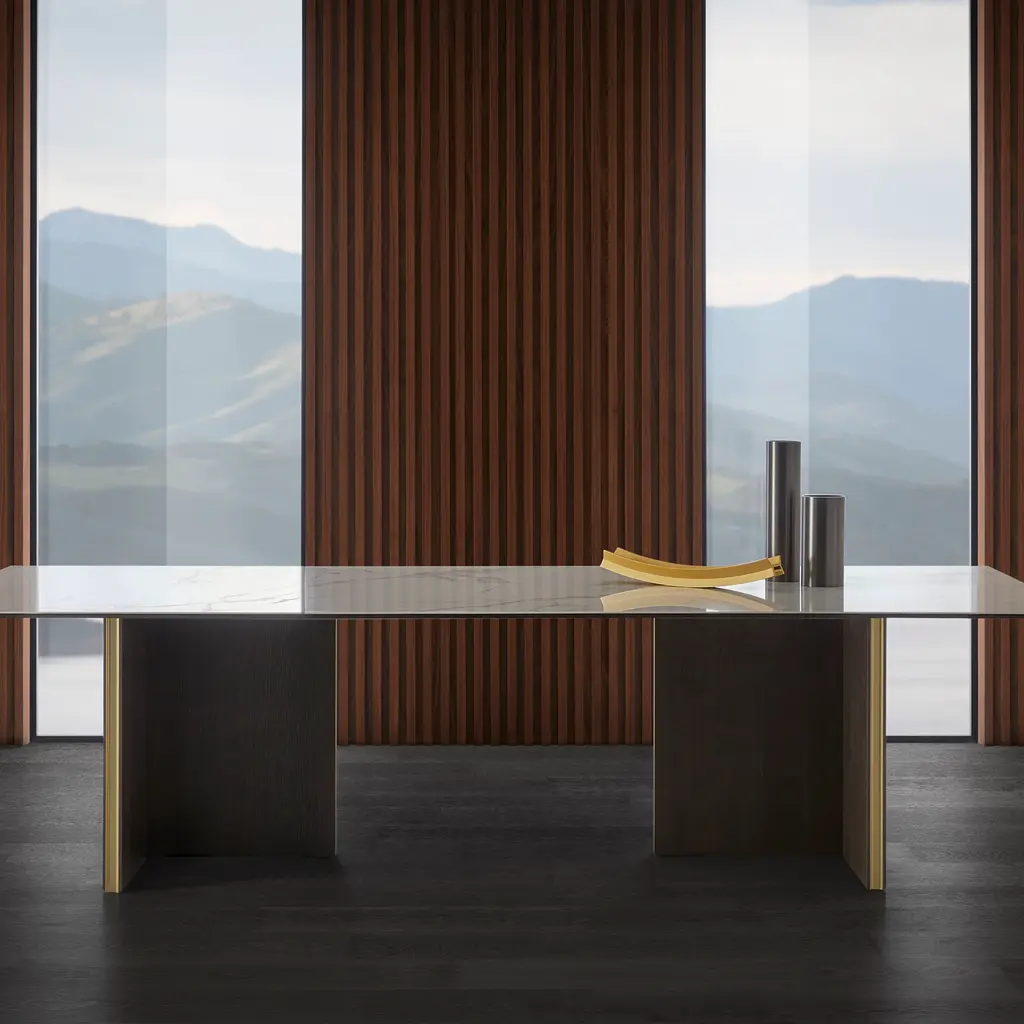 Grandly proportioned, Punt’s largest Stockholm Table makes for a luxurious focal point in a dining setting with its statement top in a splendid marbleized ceramic composite, Dekton. From designer Mario Ruiz, the signature intersecting base panels are fashioned in rich oak or walnut veneer of varied finishes and glossed with metallic accent banding.