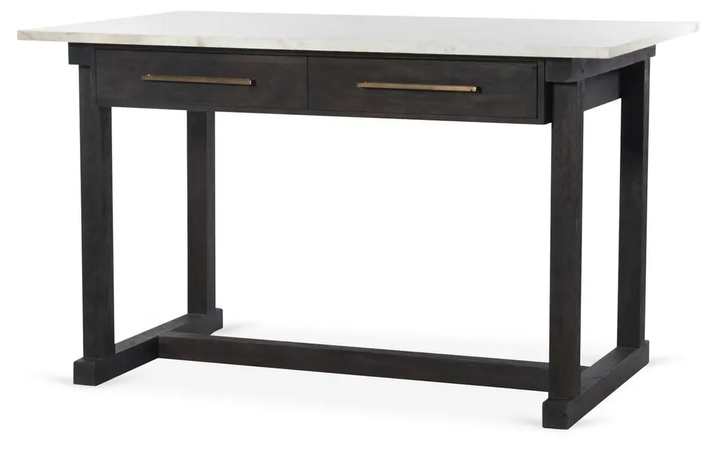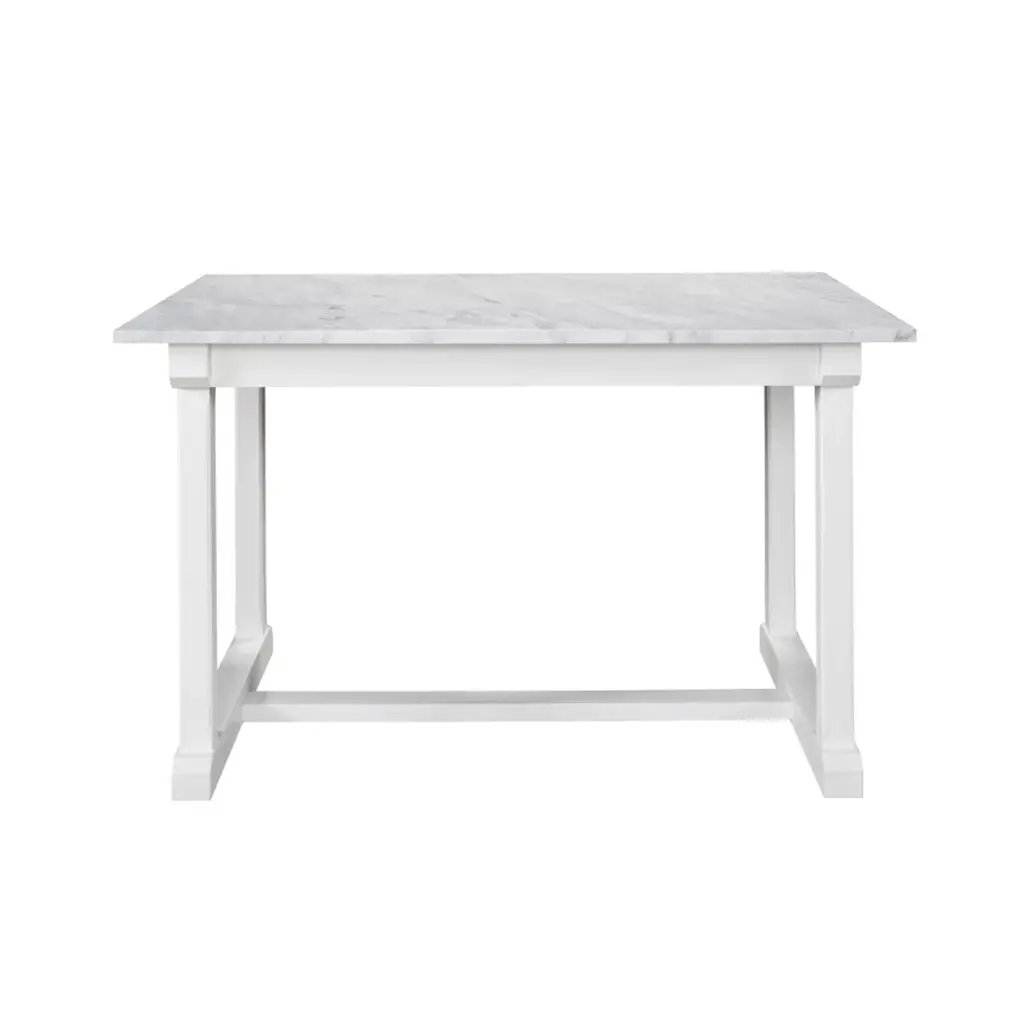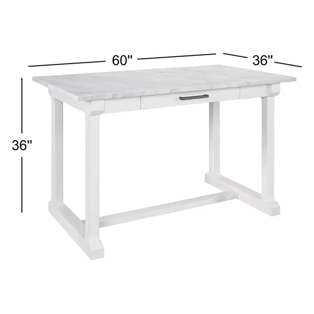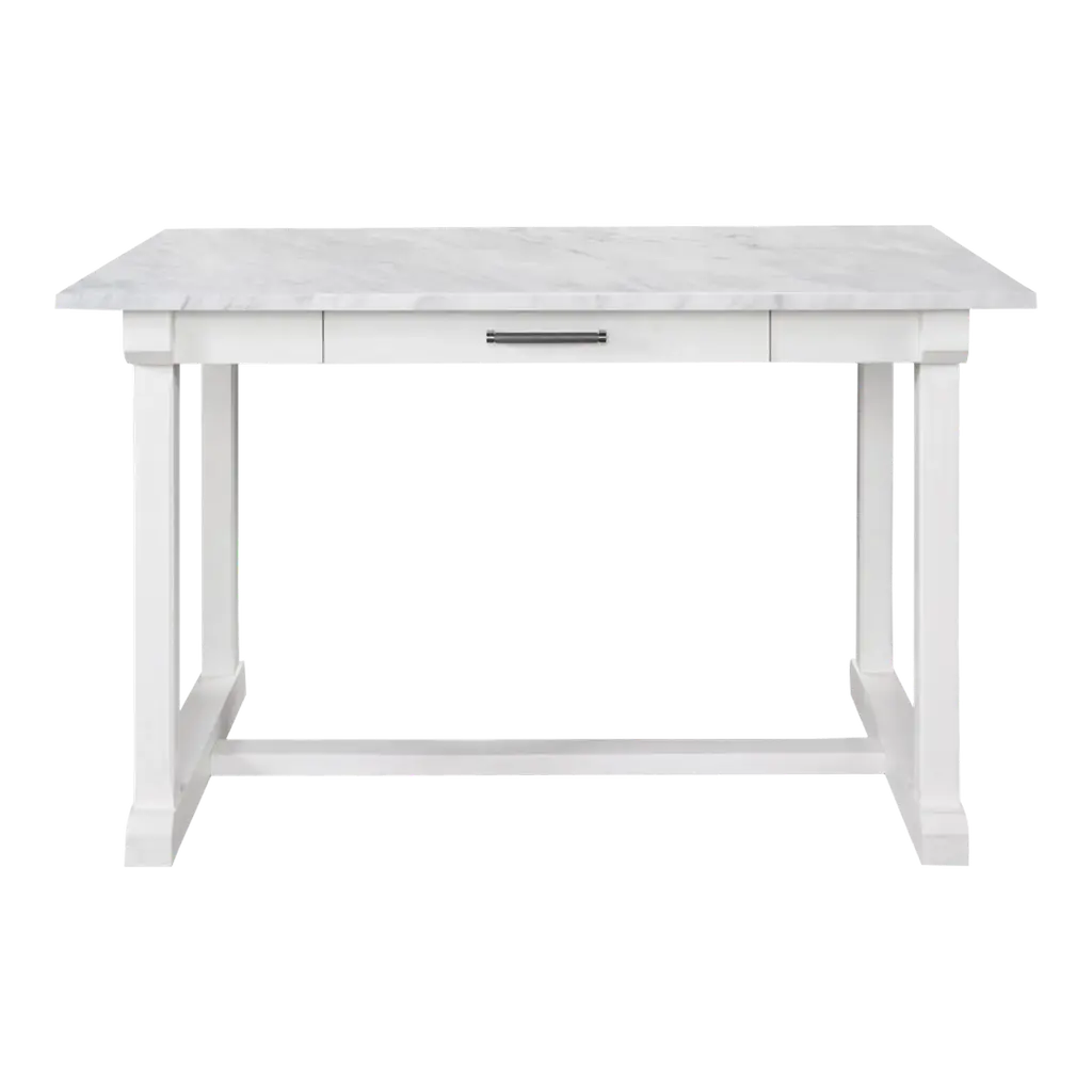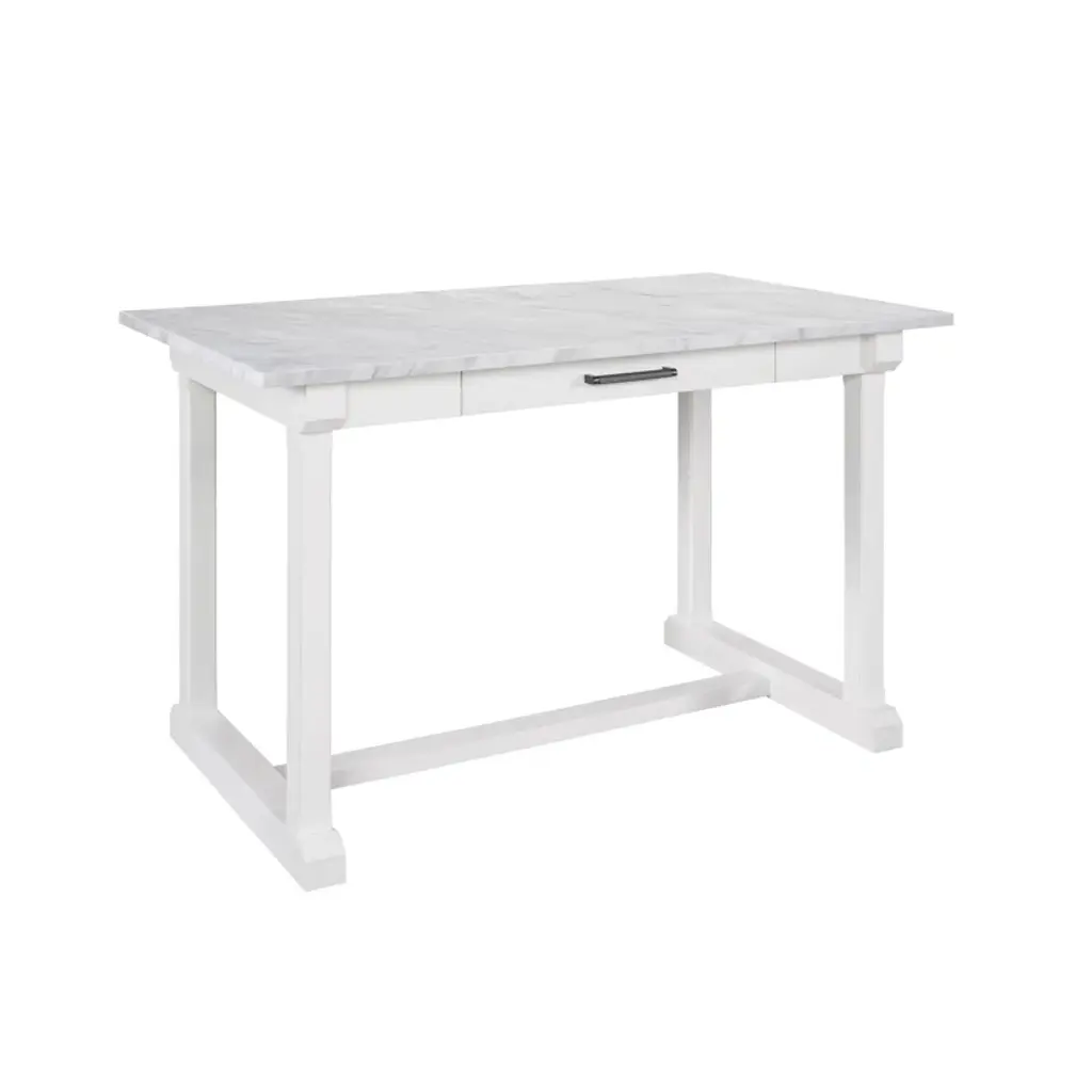 The Bilbrook counter Table is a delightfully modern furnishing, built with a smooth stone top paired with a convenient storage drawer and a fresh white finish.