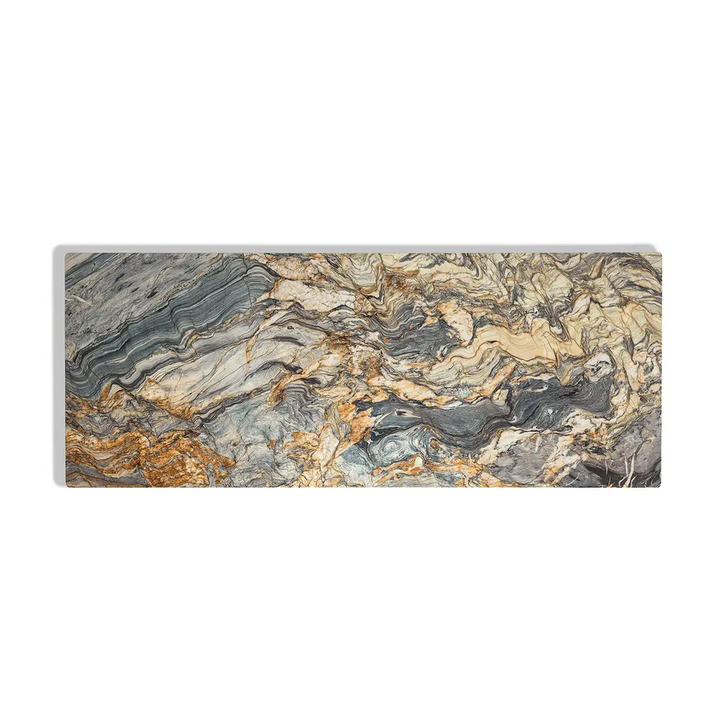 The Stone rectangular dining table features a boxed marble design with a stunning stone fusion pattern. The top and legs are crafted from boxed marble, with the top and side strips meticulously worked to maintain vein continuity. The support structure consists of a lattice metal frame with four legs. The internal legs and undertop are clad in polished stainless steel foil, while the metal components are finished in shiny gold steel, adding a luxurious touch.