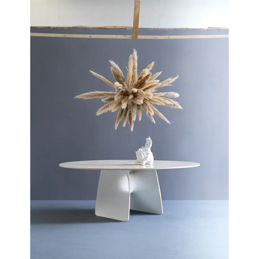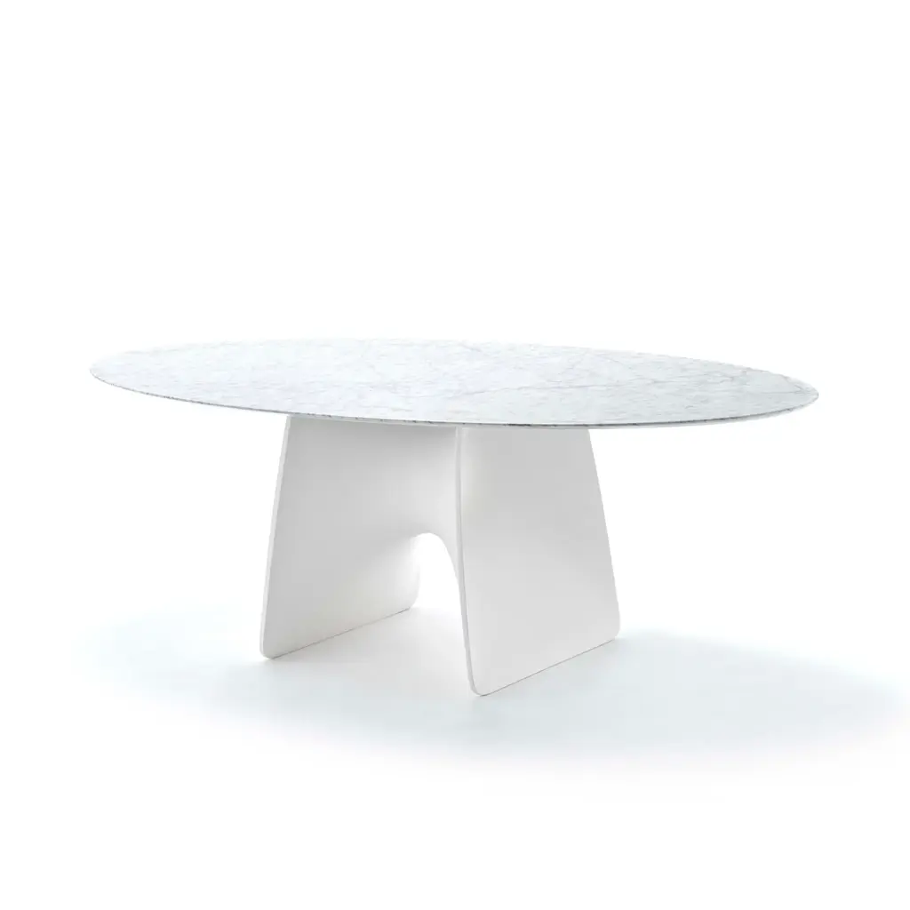 Lux is a round dining table featuring a base made of white Ekotek® and a top in natural stone or Carrara marble. This innovative table utilizes Ekotek®, composed of highly selected resins and loaded with pigments and natural minerals, resulting in a velvety surface that is easy to clean and non-toxic.