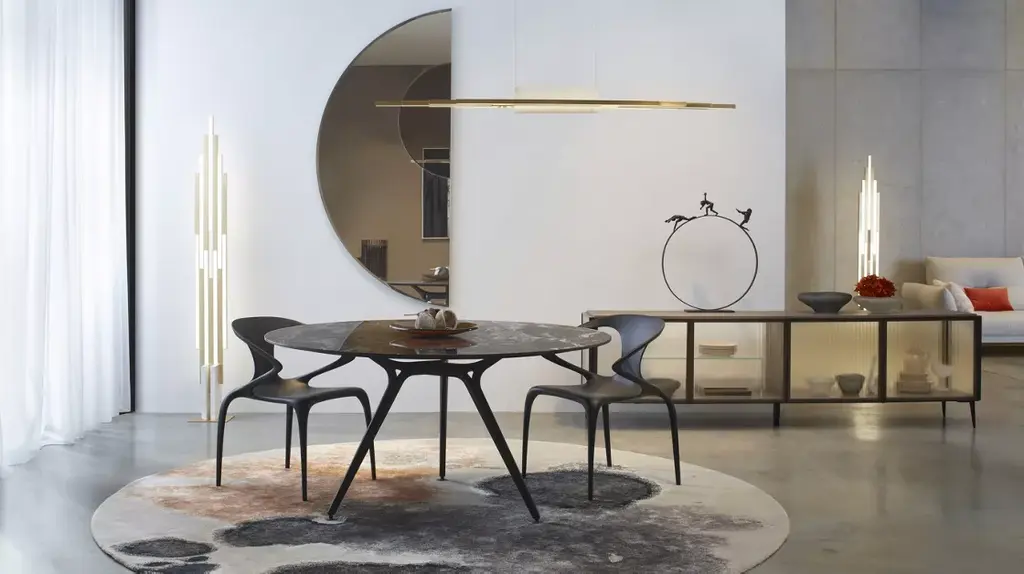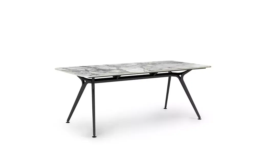 The Stonehenge collection features thick 12 mm fibered ceramic tops. Allowing for rectangular or round formats, elegant cast aluminum legs thus highlight the superb collection of stone and marble patterns inspired from around the world.