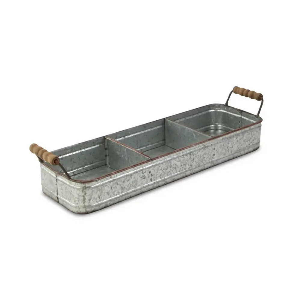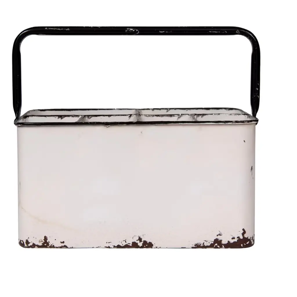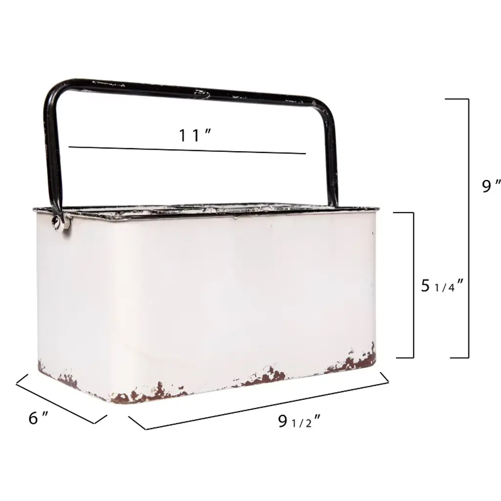 Organize any space with style and flair with this distressed white and black metal caddy with six compartments and handles. This rustic and charming metal caddy features six rectangular compartments holding various items, such as utensils, napkins, condiments, craft supplies, or plants. The caddy also has a sturdy metal handle that makes it easy to carry and move around. The metal caddy has a distressed white and black enamel finish that gives it an aged and worn look. This piece is perfect for a style of farmhouse, country, or vintage home décor. This caddy can be placed on the kitchen counter, dining table, desk, or shelf for a touch of personality and organization. The caddy measures 11 inches long, 6.25 inches wide, and 9 inches high. Order this today and enjoy a stylish and practical addition to any home.