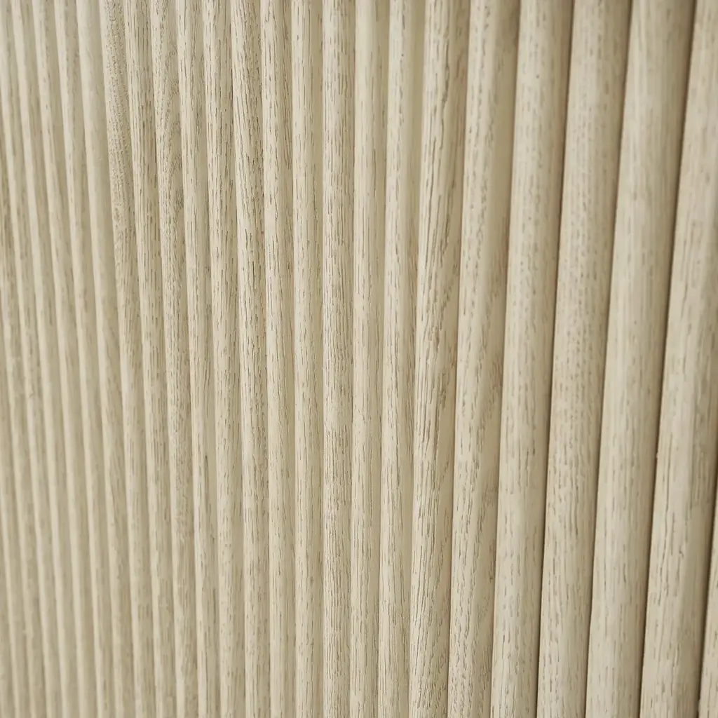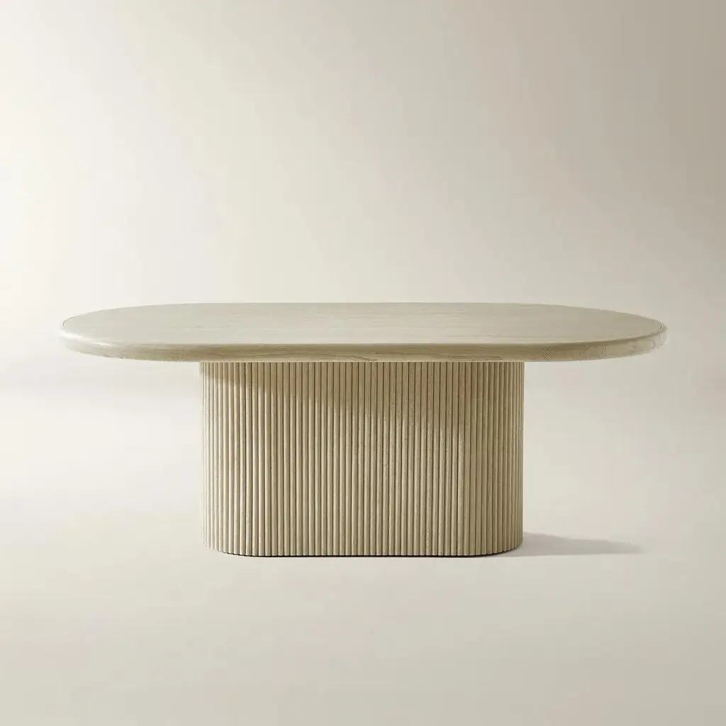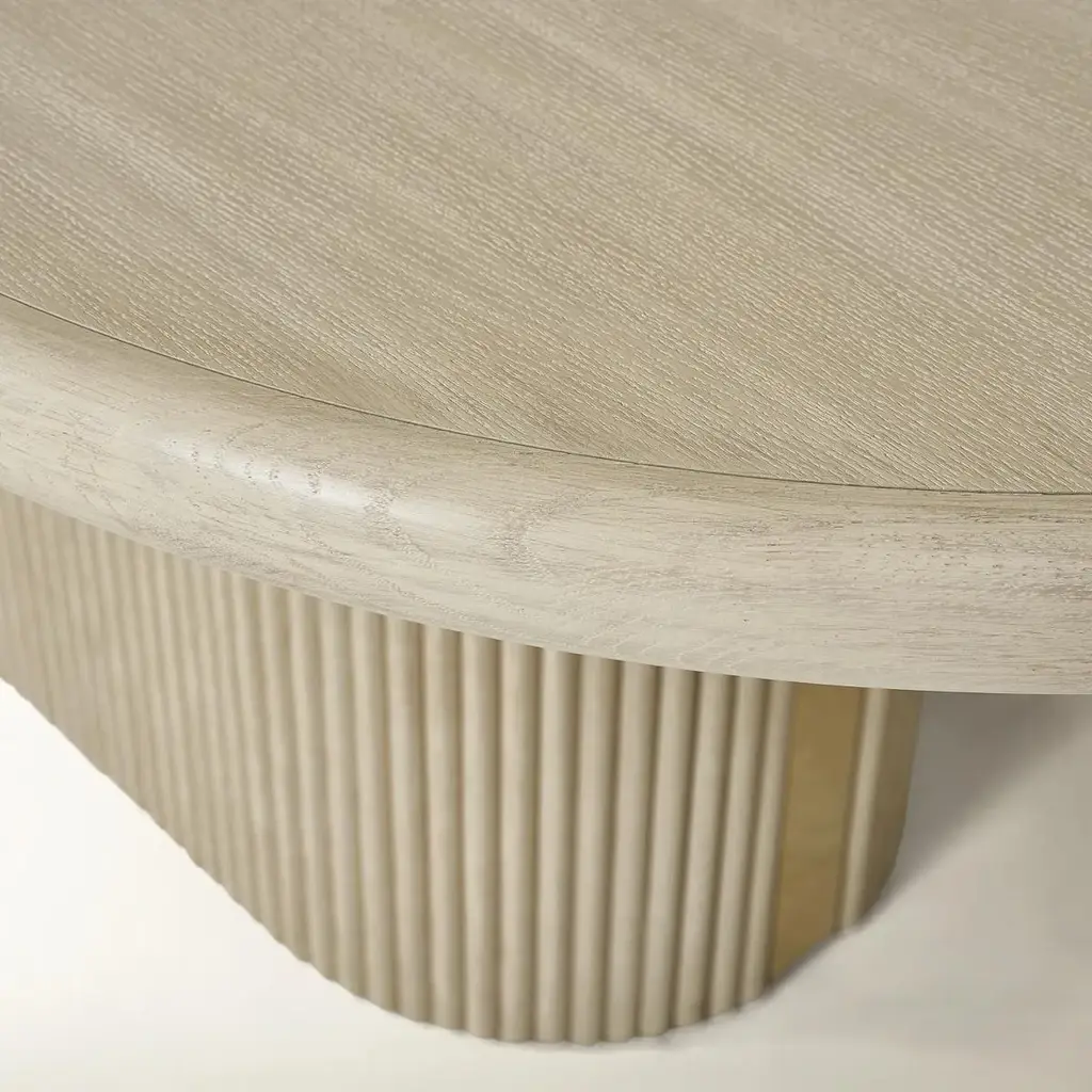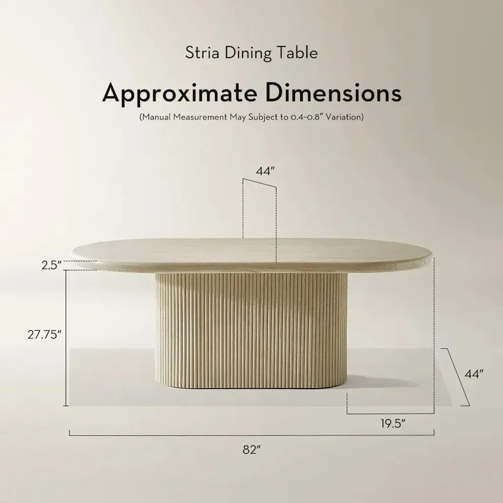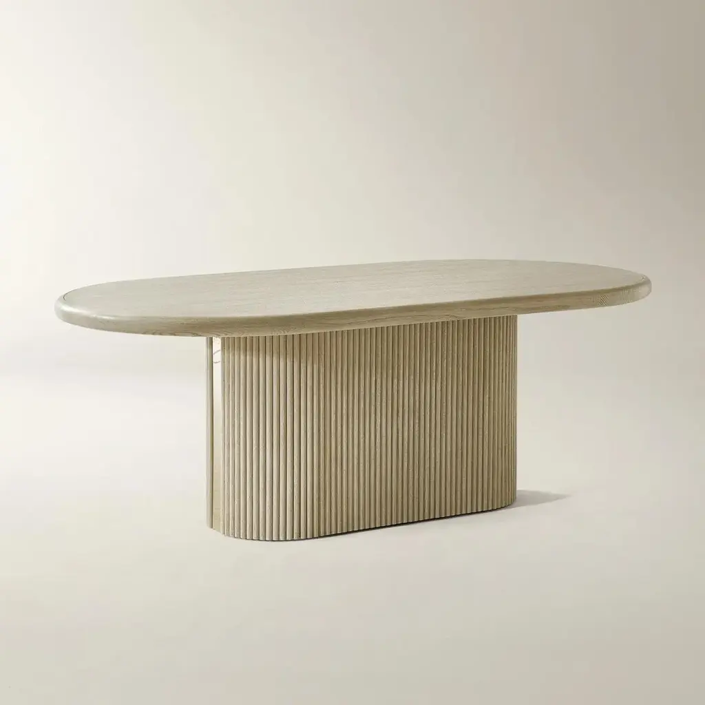 The Stria Dining Table brings sculptural elegance and thoughtful design to the heart of the home. A reeded solid oak pedestal anchors the piece with texture and warmth, while mirror-polished stainless steel end caps in a plated gold finish catch the light like functional jewelry. The trim protects the edges and adds a luminous contrast that reflects the room’s energy and expands the sense of space. The oval tabletop seats six to eight comfortably and fits beautifully in areas where rectangular tables might restrict movement. The single pedestal base opens up legroom and promotes easy conversation, making this reeded oak dining table both visually impactful and remarkably livable. Crafted from oak solids and veneers, the Stria is a modern wood and gold dining table designed to balance everyday function with lasting style.ZG Exclusive