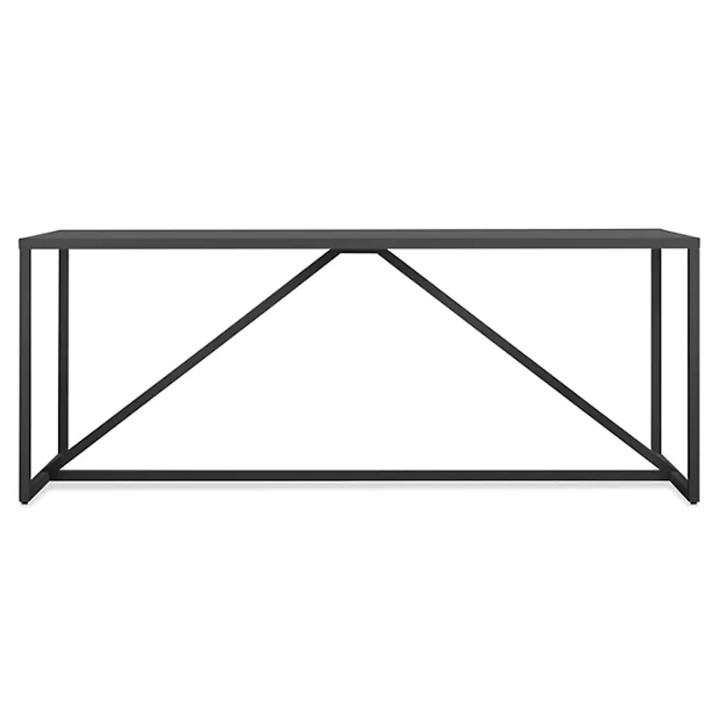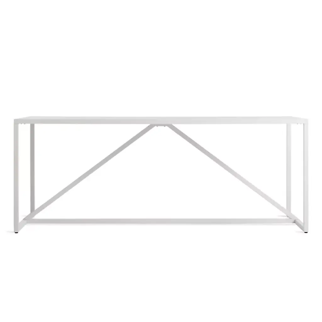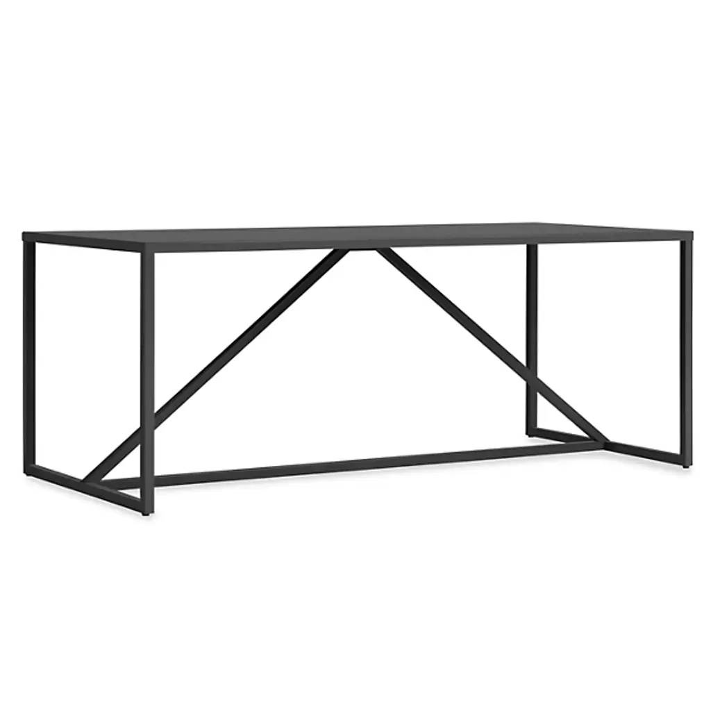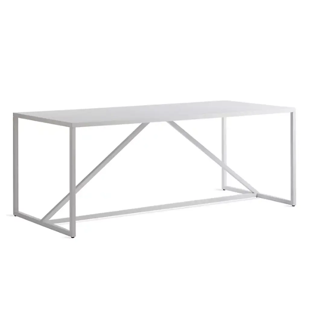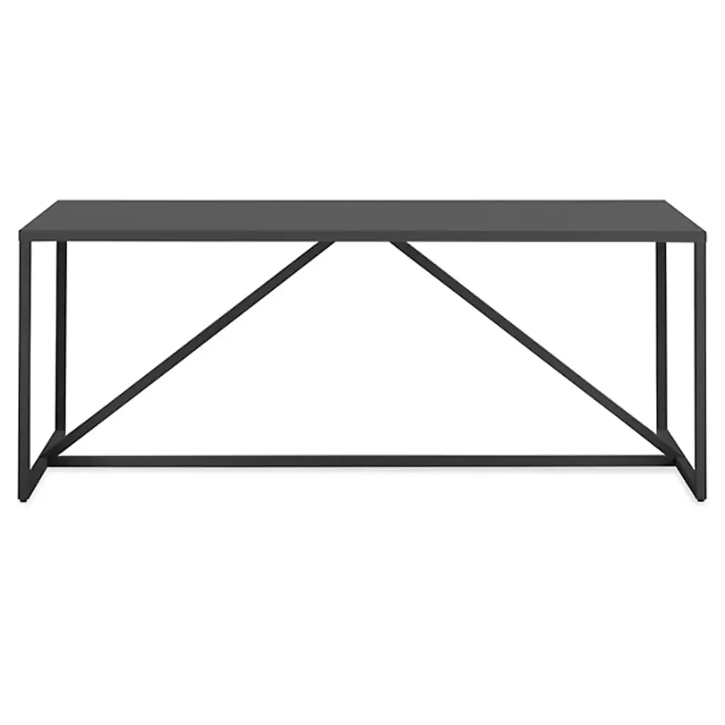 Sleek and spacious. Satisfy your patio's need for comfort and aesthetics with the Strut Outdoor Dining Table from Blu Dot. It's a piece finding the right balance between form and function. Pull up a chair, or six, and watch as they tuck underneath with leg space to spare. The strut support at the center keeps the table solid, gives it an open feel, and serves as an eye-catching triangle silhouette. Its powder-coated steel construction highlights its sleek character. The rectangular tabletop offers a wide surface area for a helping of delectable dishes. When dinner is wrapped up, the polyurethane MDF tabletop disappears spills and stains with a soapy wipe down.