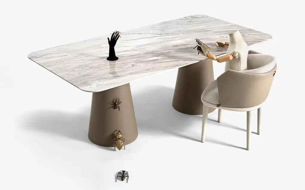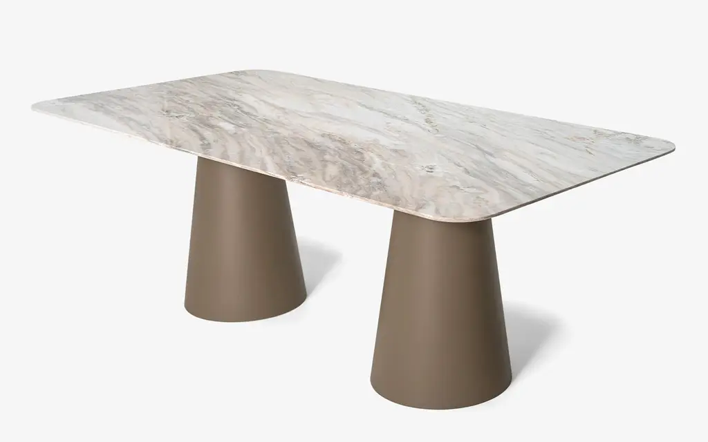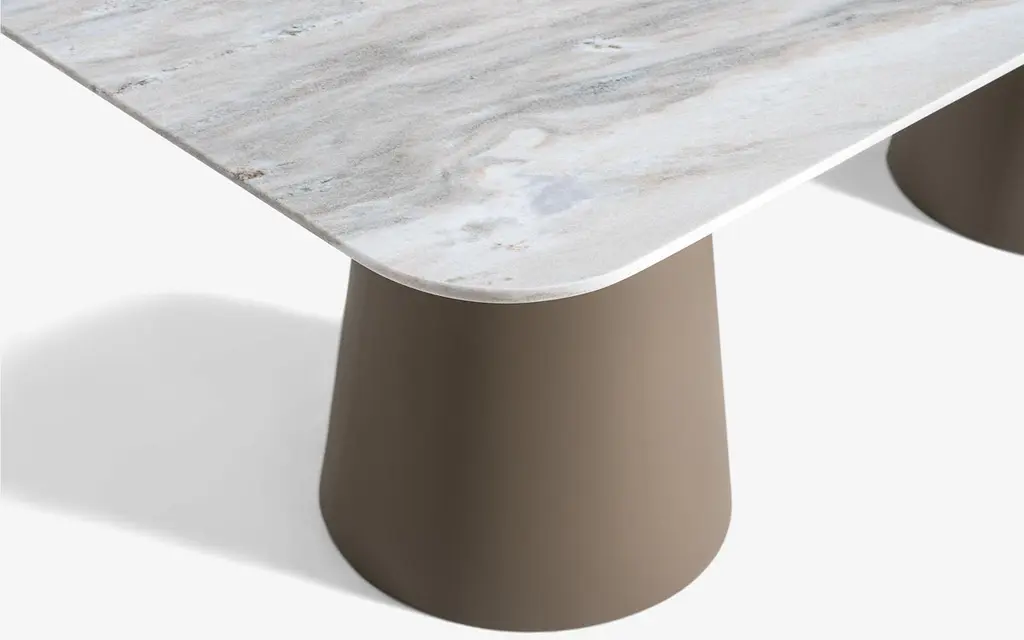 Sui Eight-Person Dining Table adds a modern touch to your living spaces with its aesthetic and balanced design inspired by its conical form.It provides a comfortable and spacious use with its structure that offers a wide seating area for eight people. The strong stance of the two metal conical legs provides a perfect harmony with the natural texture of the marble table. Bringing elegance and functionality together, this table reflects a design concept that has been meticulously considered in every detail.While its durable metal legs offer long years of use with its sturdy structure, its wide-surface marble table offers a comfortable dining experience. Thanks to its seating arrangement for eight people, it can be easily preferred both in daily use and at crowded tables. Sui, which adapts to different decoration styles thanks to its timeless design, can easily adapt to both classic and modern spaces.Width: 210 cm (82.68 inches)Depth: 105 cm (41.34 inches)Height: 75.3 cm (29.65 inches)Materials:Static Painted Metal LegMarble Table Top