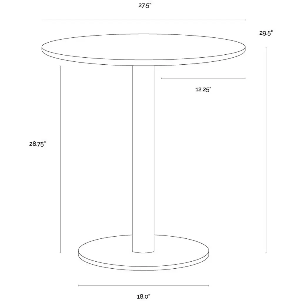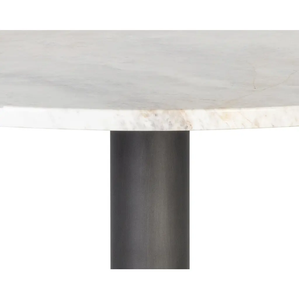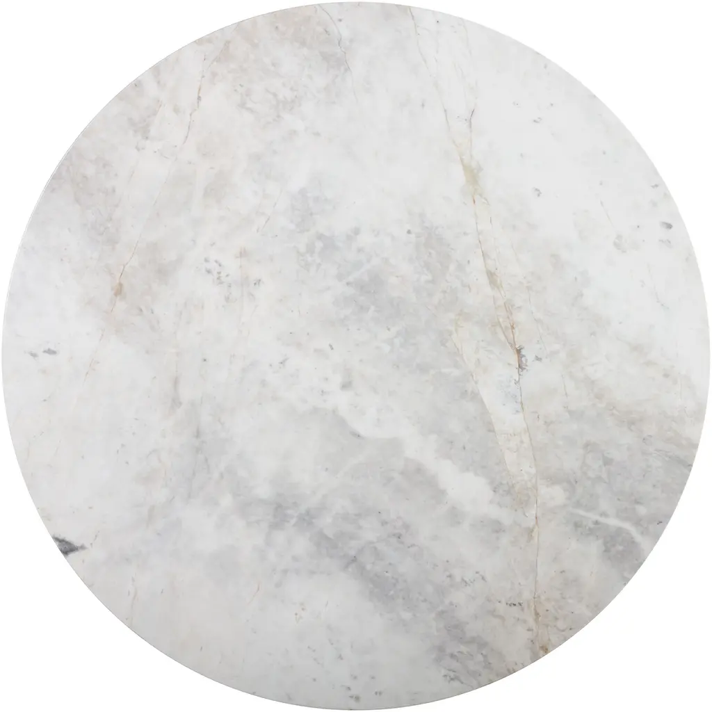 An Art Deco inspired 27.5" round bistro table featuring a white marble top with a pewter finished steel base. Perfect for restaurants and smaller dining spaces. As marble is a natural material, unique veining, pitting, fissures, micro-cracks and colour variations are all characteristics that add to the uniqueness and beauty of each piece.