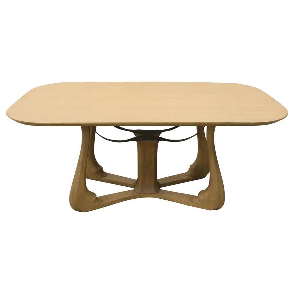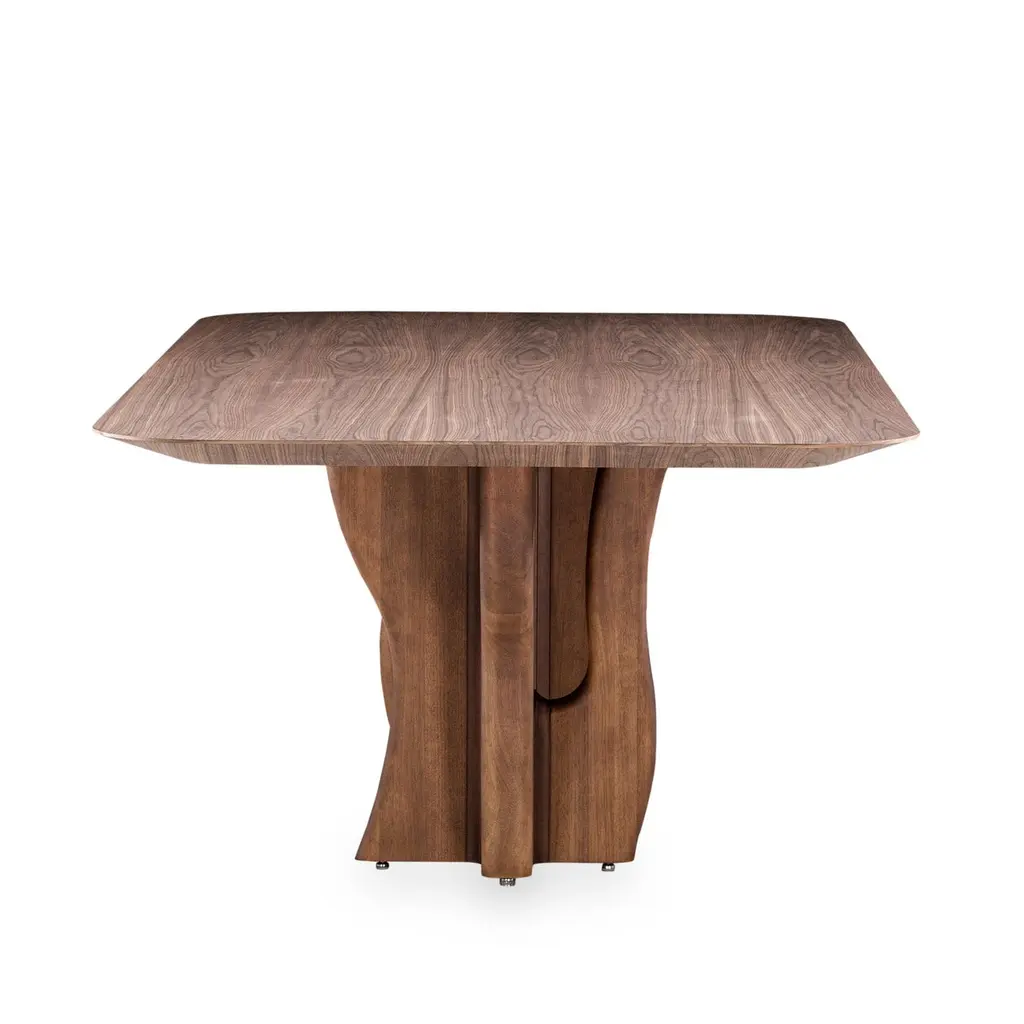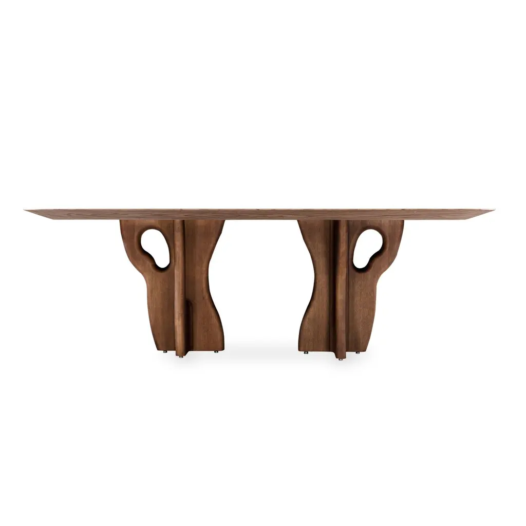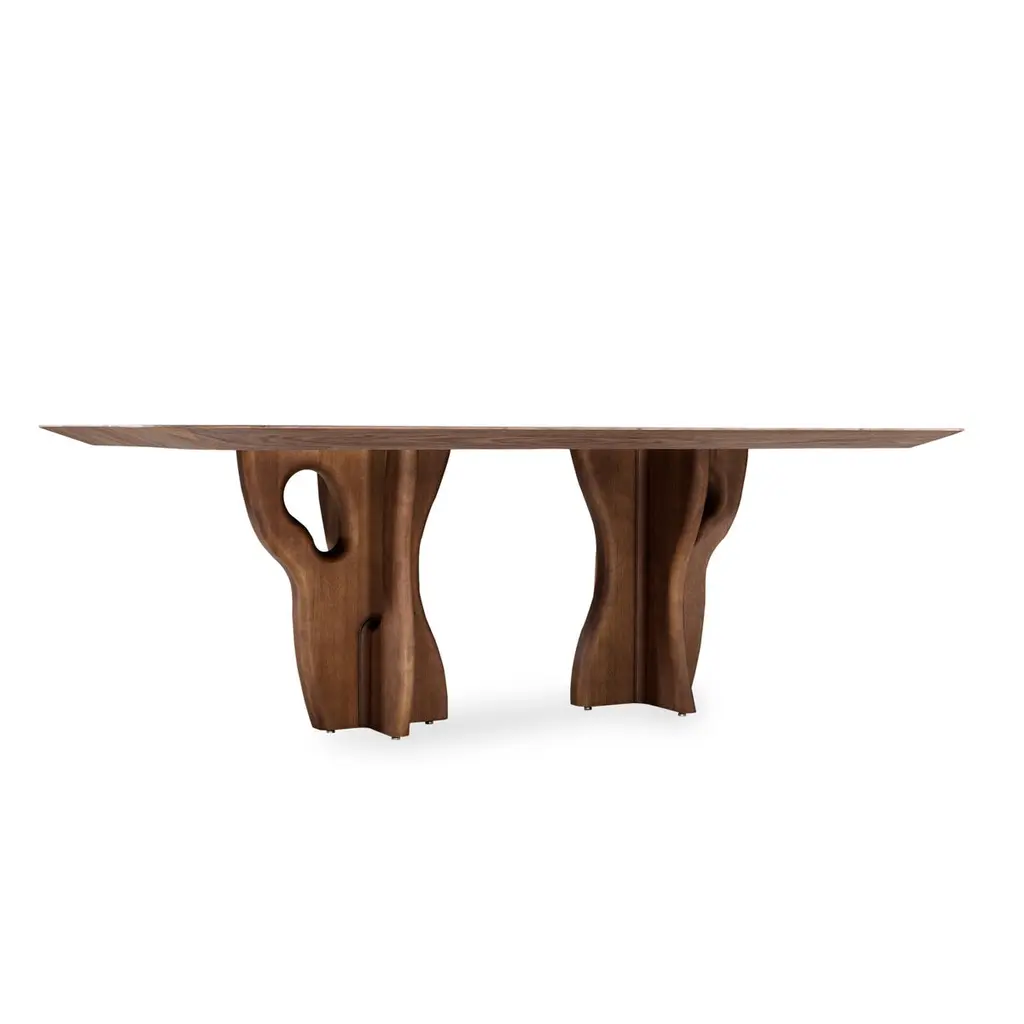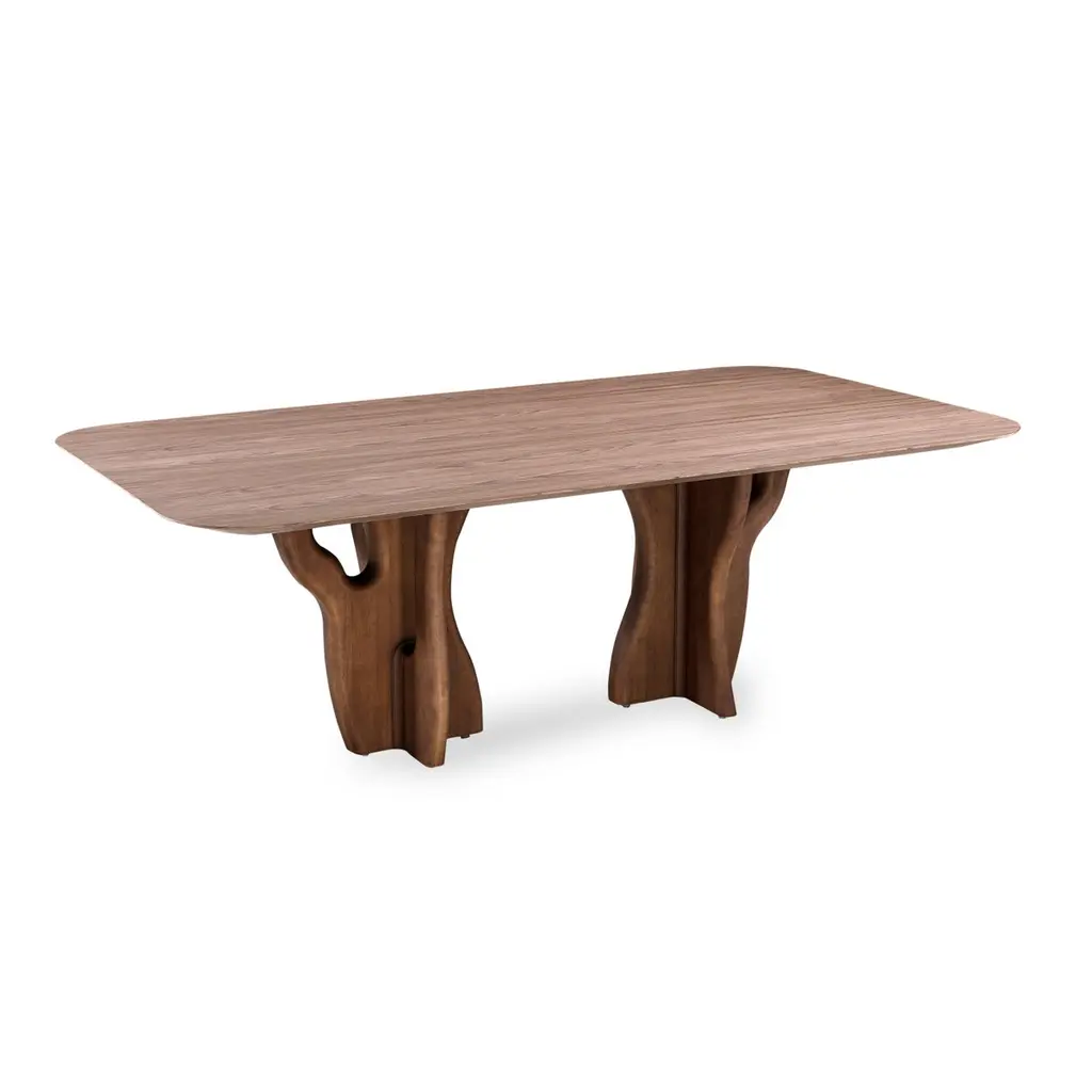 The Suma dining room table by Uultis with 86-inch walnut veneered top and Amazon tree inspired base. Introducing the Suma dining table by Uultis, a stunning fusion of nature-inspired design and contemporary elegance. Measuring 86 inches long, this exquisite dining table features a walnut veneered top with beveled edges on the underside, creating a sleek profile that enhances its sophisticated appearance. The organic solid wood base, finished in walnut, draws inspiration from the majestic Sumaúma tree, one of the towering giants of the Amazon rainforest. The base mirrors the entangled roots of this impressive tree, capturing the essence of the Amazon's rich flora and the strength of nature, bringing a touch of organic beauty to your dining space.The Suma dining table is crafted not only to serve as a gathering place for meals but also as a statement piece that effortlessly complements modern and contemporary decor styles. Its sculptural base, with its intricate, root-like design, infuses the dining room with character and elegance, making it a centerpiece that commands attention. This table is an ideal choice for those who seek to create a dining environment that reflects both sophistication and a deep appreciation for nature’s artistry.Designed by the talented Uultis team, the Suma dining table is made to pair perfectly with a variety of Uultis chairs, allowing for a customized dining experience tailored to your aesthetic preferences. Available in additional sizes to accommodate different room dimensions, this table ensures flexibility and versatility in any home. Please note, assembly is required but straightforward, with comprehensive step-by-step instructions included for ease of setup.Bring the beauty of the Brazilian Amazon into your home with the Suma dining table, where the natural world meets refined craftsmanship. Whether used for intimate dinners or grand gatherings, this table promises to enhance your dining experience, offering both visual appeal and functional durability. Elevate your space with the Suma table—a celebration of natural elegance and modern design.