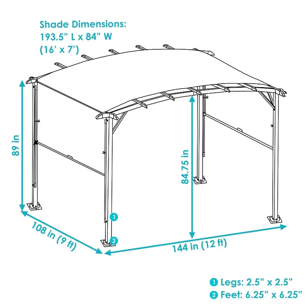 Relax and enjoy the outdoors beneath the shade of this elegant, 9 ft x 12 ft metal arched pergola with an attached canopy. This beautiful pergola with a retractable canopy provides shelter from the sun and is a beautiful addition to any garden or deck. This retractable pergola features durable construction with a durable 1.75 mm thick steel frame and a tough, polyester fabric shade canopy. Both the frame and the polyester material provide durability against harsh and mild weather conditions without sacrificing style. This arched pergola with retractable canopy provides plenty of space of for patio furniture and makes a great shelter for outdoor gatherings like picnics, barbecues, and parties. It also features a stylish modern design that will complement any outdoor space. Need some extra shade for your outdoor event? This pergola provides a great amount of shade and mobility for your guests and is a wonderful addition to any large gatherings, events, and reunions!• SPACIOUS MODERN PERGOLA: This elegant pergola measures 108" wide x 144" long x 89" tall. It has a clearance height of 84.75" and weighs 116.8 lbs. The retractable shade measures 193.5" long x 84" wide x .75 mm thick and provides 112 square feet of shade. The feet measure 6.25" square and the tubular legs measure 2.5" square. The arched pergola features a unique design that will add a touch of style to any outdoor space.• STURDY CONSTRUCTION: This metal pergola is made from high-quality materials. It features a durable 1.75 mm thick steel frame and a 200 g PA polyester canopy to resist the outdoor elements.• INCLUDES ALL HARDWARE: This freestanding pergola with canopy includes 4 legs, 4 feet, 5 rafters, a canopy, 16 stakes, and a hardware kit. All of the necessary hardware is included. Two people are required for assembly (step ladder not included).• ENJOY REFRESHING SHADE: This covered pergola provides cool shade from the sun. It's perfect for over a patio dining table or lounge chairs.• WORRY-FREE PURCHASING: Sunnydaze Decor backs its products with a 1-year manufacturer's warranty.