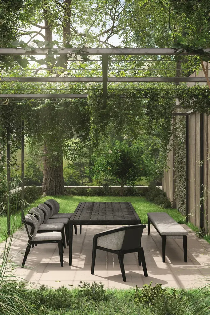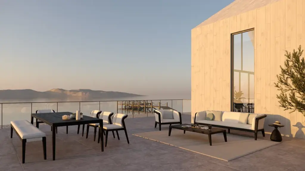Sunrise is a rectangular teak table.Clean lines and strong curves give SUNRISE an undeniably compelling posture, while the warmth of its materials and openness of its frame form an irresistible invitation for endless moments of outdoor enjoyment. Available in warm brushed teak and bold teak, SUNRISE includes a complete range of both lounge and dining furniture. Dark teak details and a backrest upholstered in fabric or batyline® complete the design of this robust yet elegant teak collection by Matthew Townsend. From countryside residence to avant-garde hotel or even a futuristic yacht, SUNRISE’s versatility makes it a captivating addition to any environment.