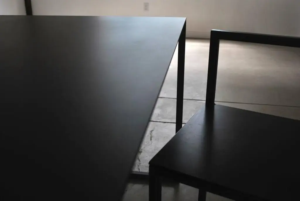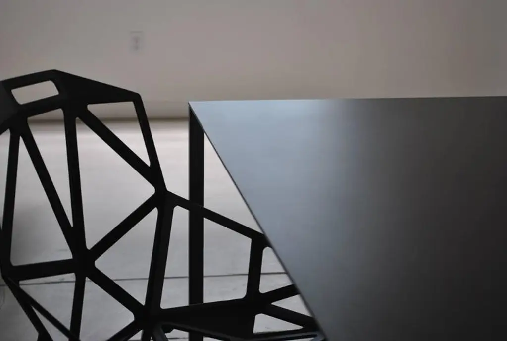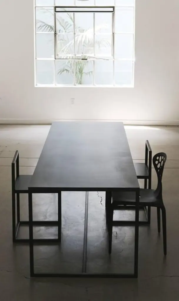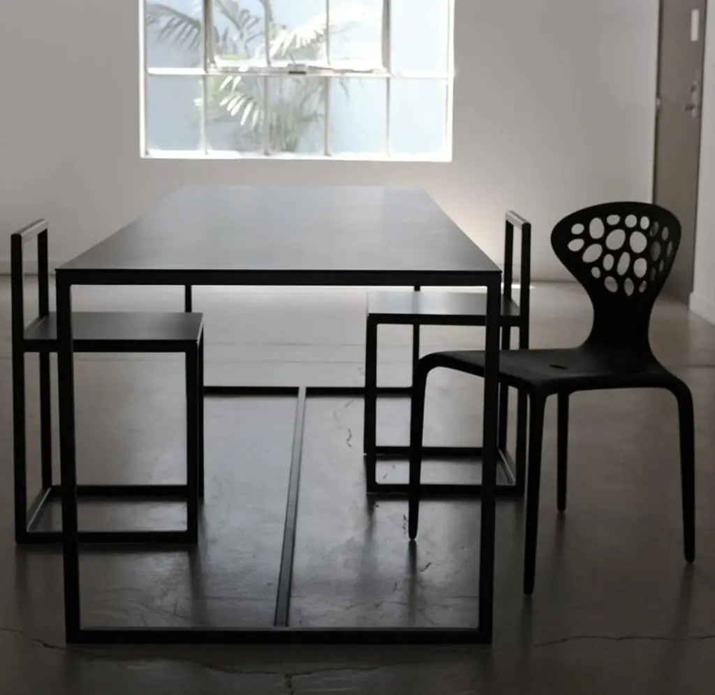 The supermetal table, taking its name by the solely use of metal, is inspired by the lightness of energy infrastructures.The table features a thin, single-sheet powder coated metal top, whose minimal thickness is expressed by recessing its supports on the long sides.The structure comprises a thin, yet robust, squared section metal legs, flush to the table top on the short sides.The table is a simple, minimal and timeless dining room centerpiece.It comes in a black, matte powder coated finish. Supermetal_Dining table indoor/outdoorpowder coated matt metal blackAvailable in these sizes:Available in these sizes: 3000x900xh720 mm $3,5202800x900xh720 mm $3,4652600x900xh720 mm $3,4102400x900xh720 mm $3,4652200x900xh720 mm $3,3002000x900xh720 mm $3,245