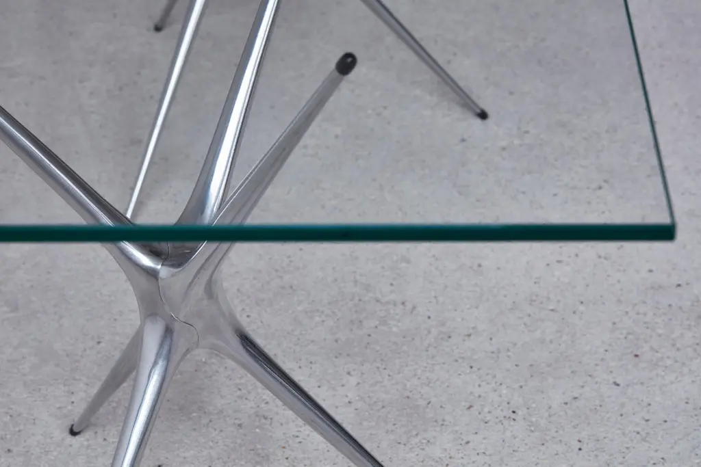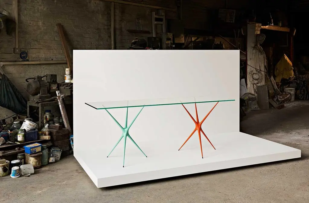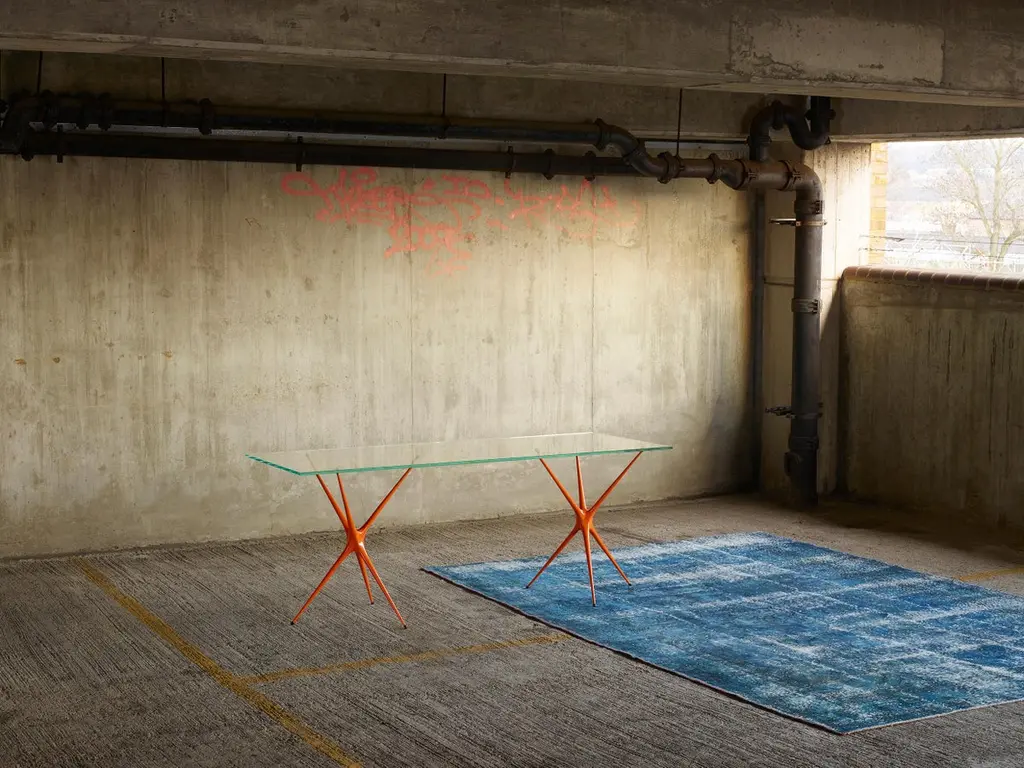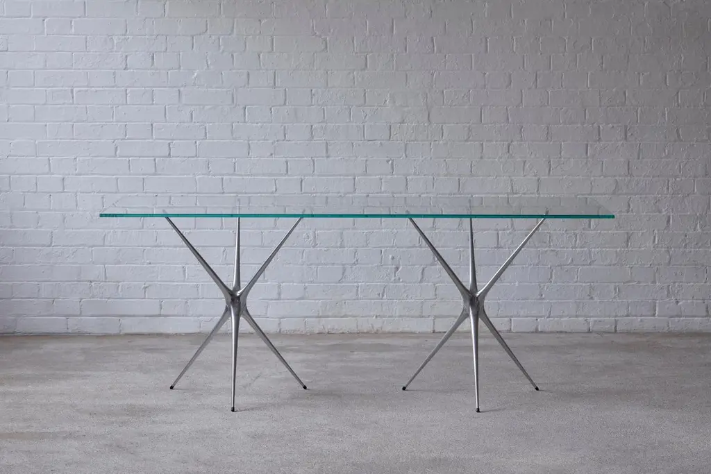 The contemporary supernova is a dynamic, self-levelling trestle cast entirely from entirely recycled aluminium in a fully sustainable closed-loop factory. Simple and versatile to orientate, the star shaped structure can be positioned vertically for a high desk or dining table or horizontally for a low coffee table. The number of trestles can vary according to glass size and are available in sea green, bright orange, charcoal black, pure white or raw aluminium.