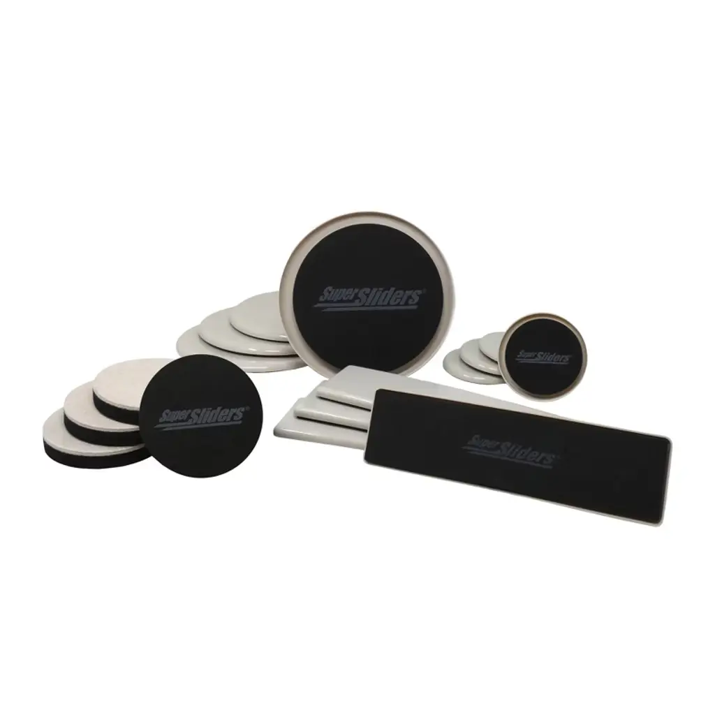 Make moving furniture around the house simple with the Super Sliders 16-Pack Assorted Furniture Sliders. This convenient kit includes both felt sliders for hard floors and plastic sliders for carpet, so you can glide heavy furniture across any surface without damaging your floors.Whether you're rearranging the living room, shifting a dining table to host a gathering, moving furniture for a deep cleaning day, or prepping for a big move, these sliders make moving heavy furniture easy while protecting against scuffs and scratches. The EVA foam tops conform to the shape of your furniture legs for a secure grip—no adhesive needed. Just place and slide.With both round and rectangular options, this versatile set is ready for quick room refreshes, seasonal updates, or full-home move prep.