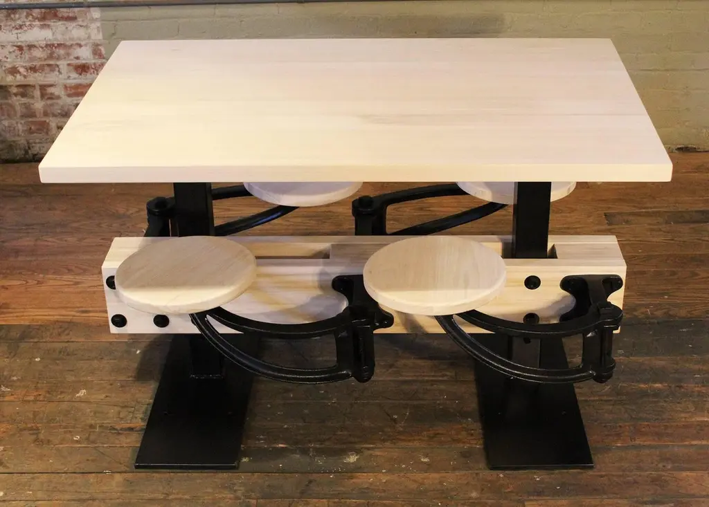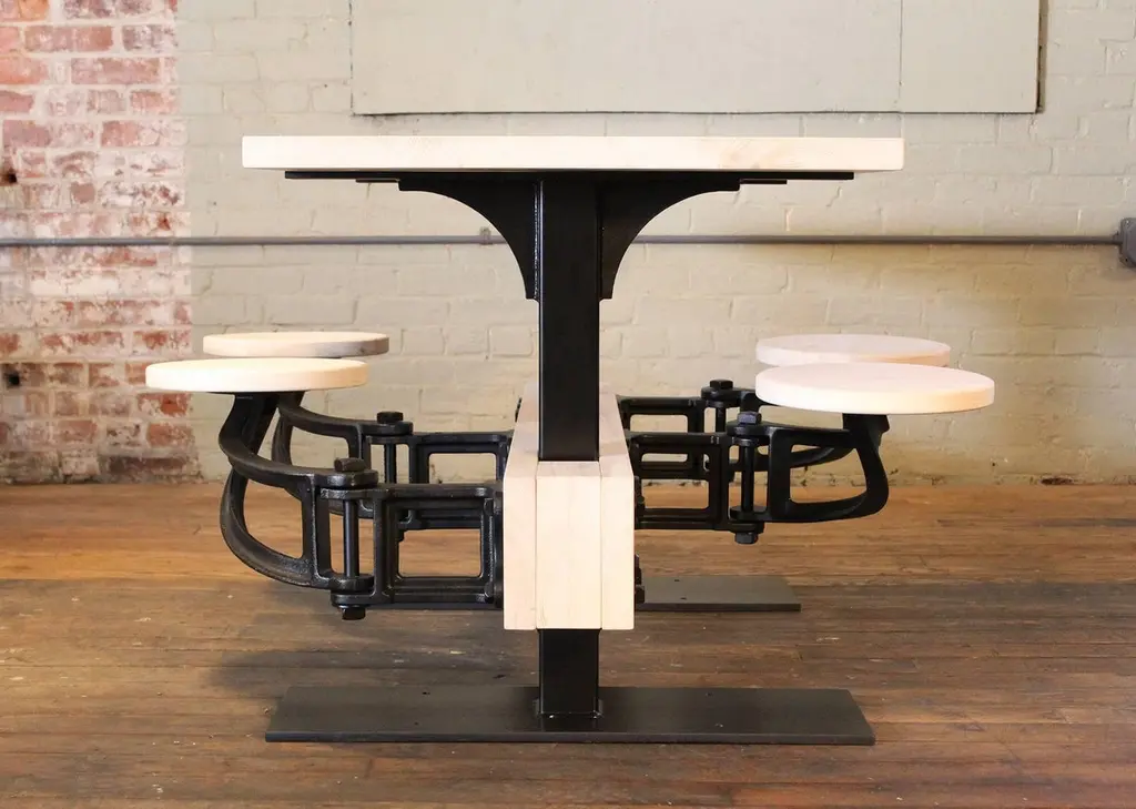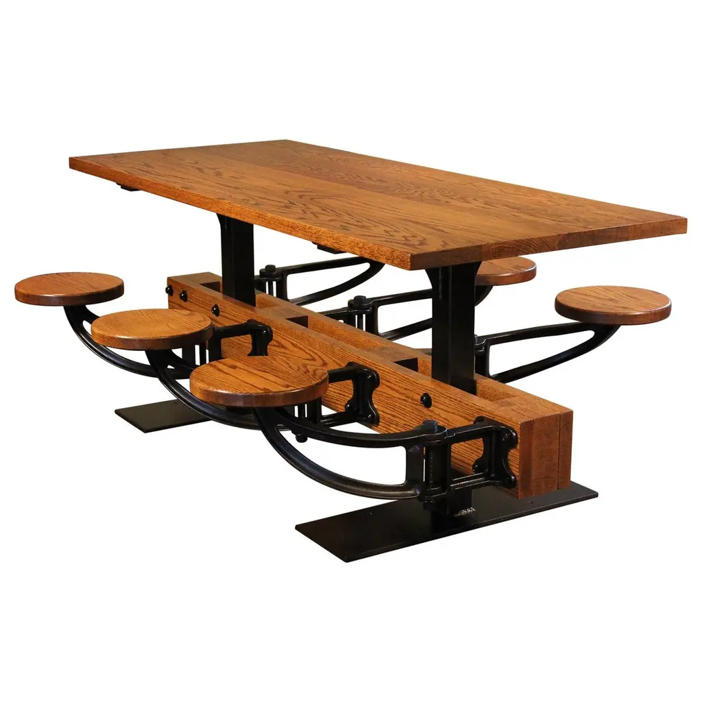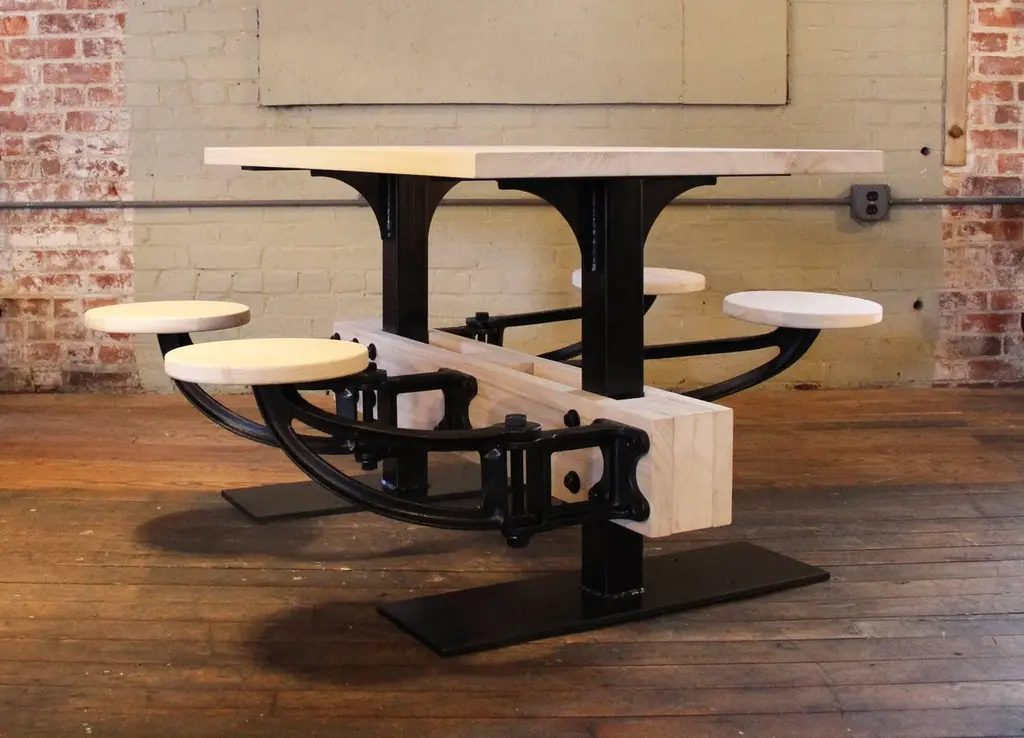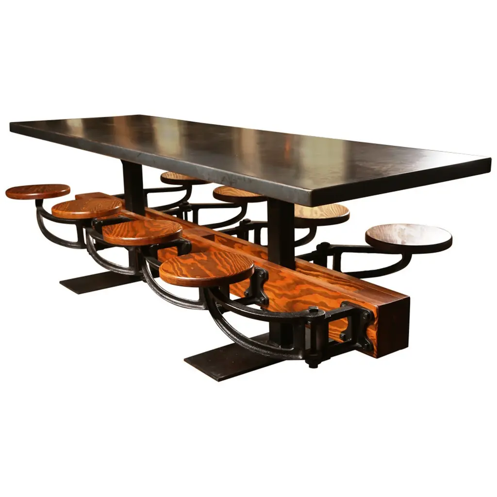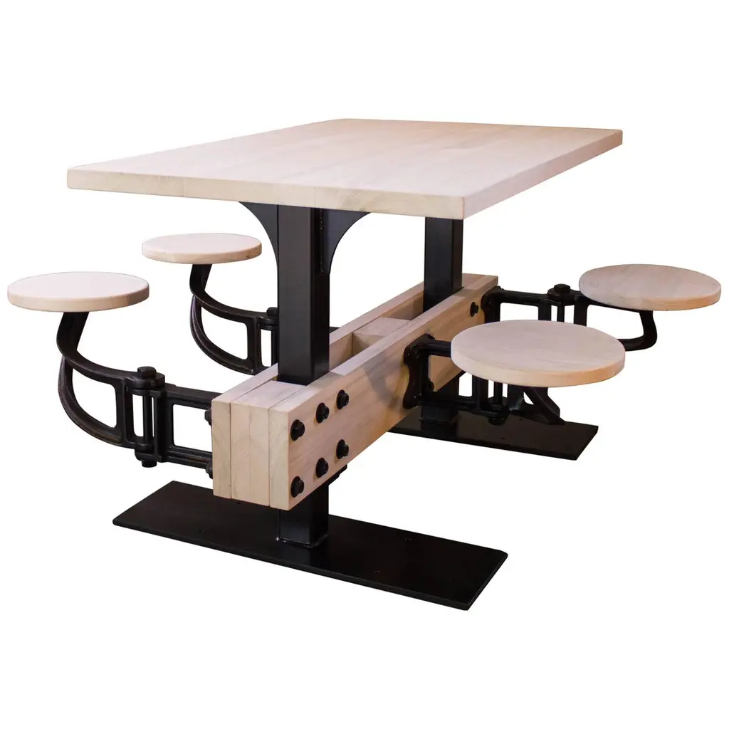 Vintage industrial cast iron, steel and wood swing out seat cafeteria style dining kitchen table. Shown in raw poplar wood. Can be made with oak, mahogany, walnut, etc. Cast iron swing out seat tops also come raw so they can be stained to match your decor. Top measures 1 1/4" thick, overall dimensions measure 30" in height, 30" in width, and 48" in length. Sizes can be customized, and metal and glass top are also available.