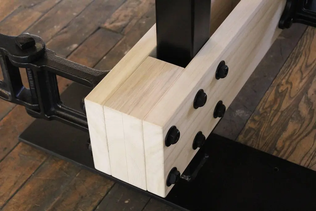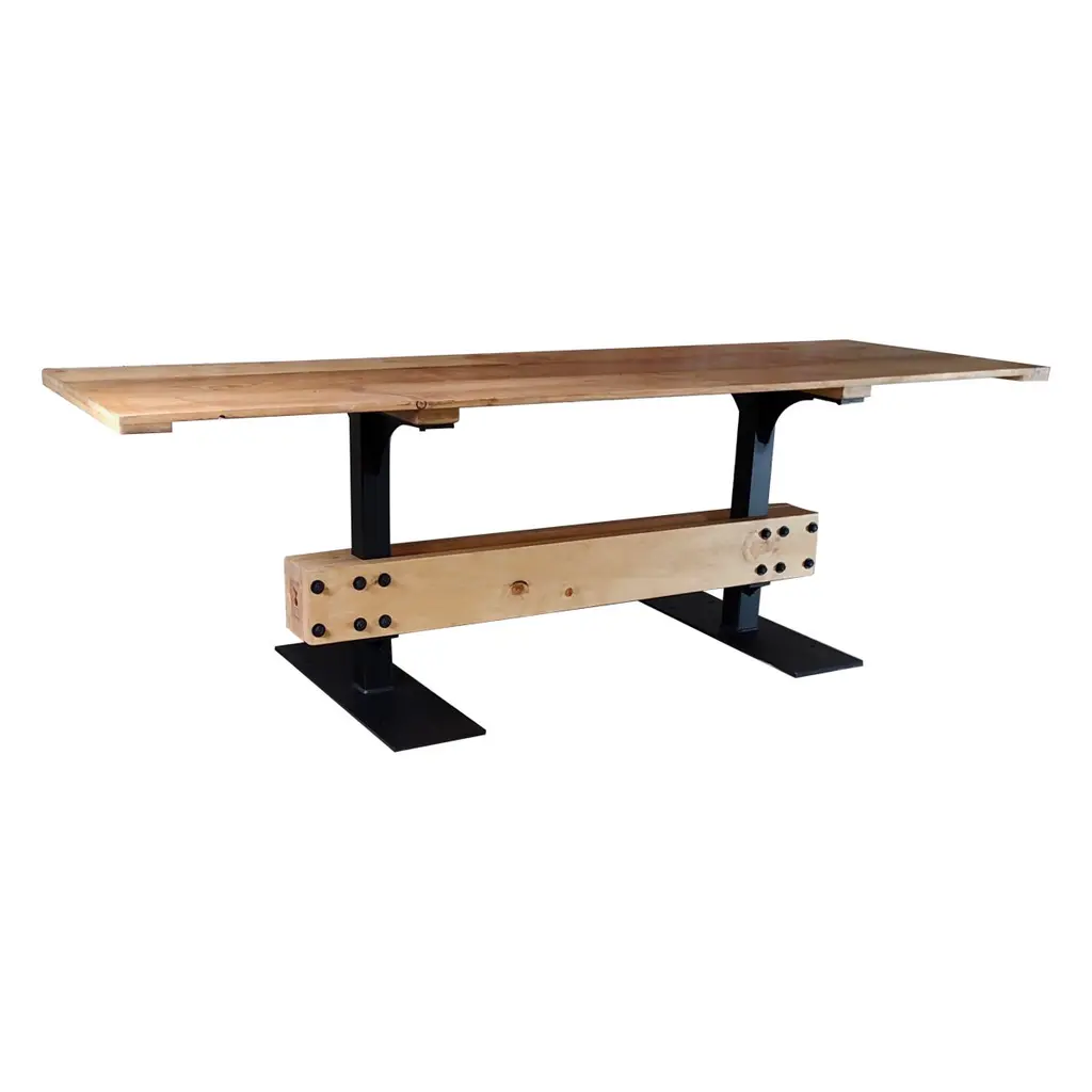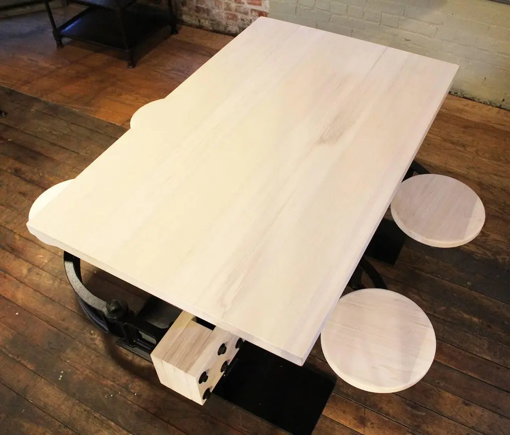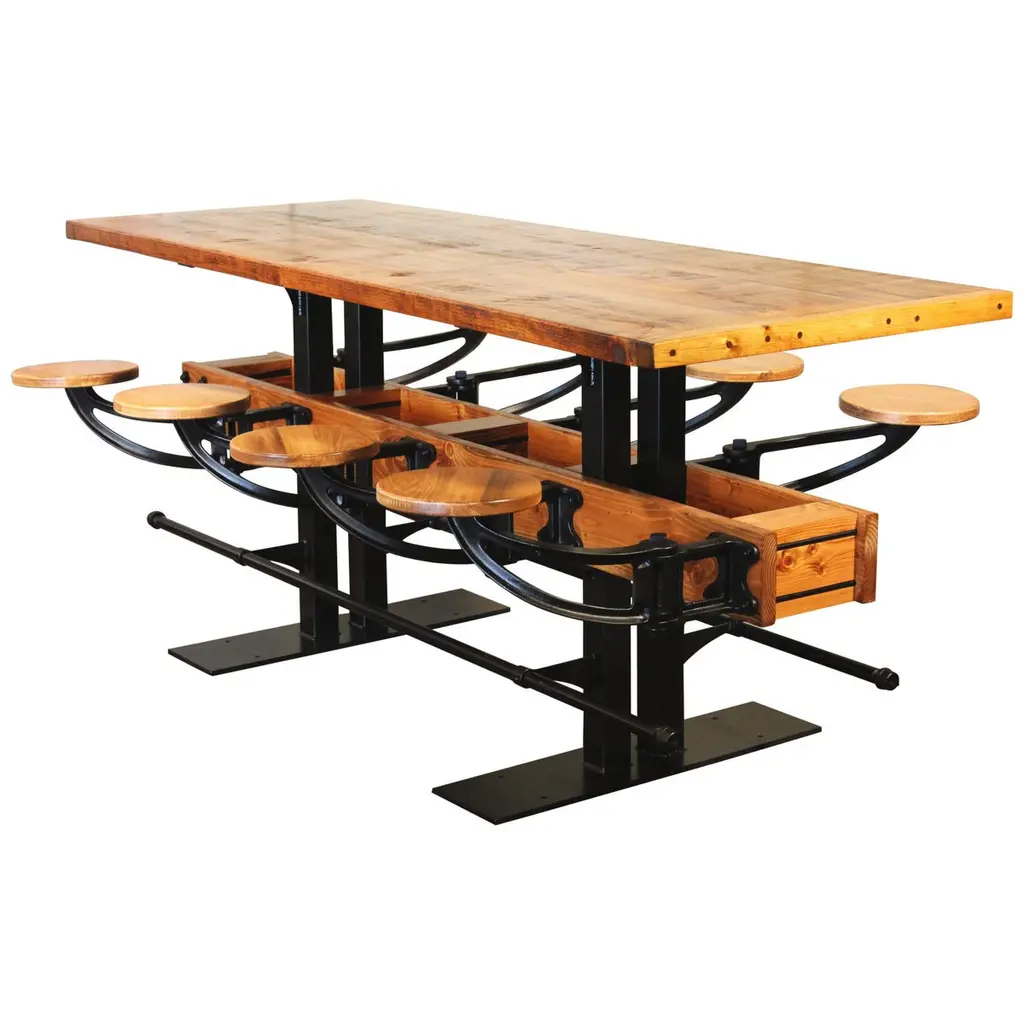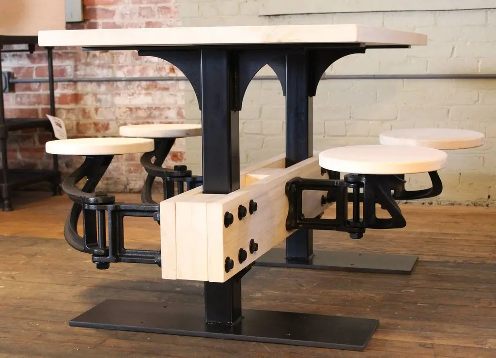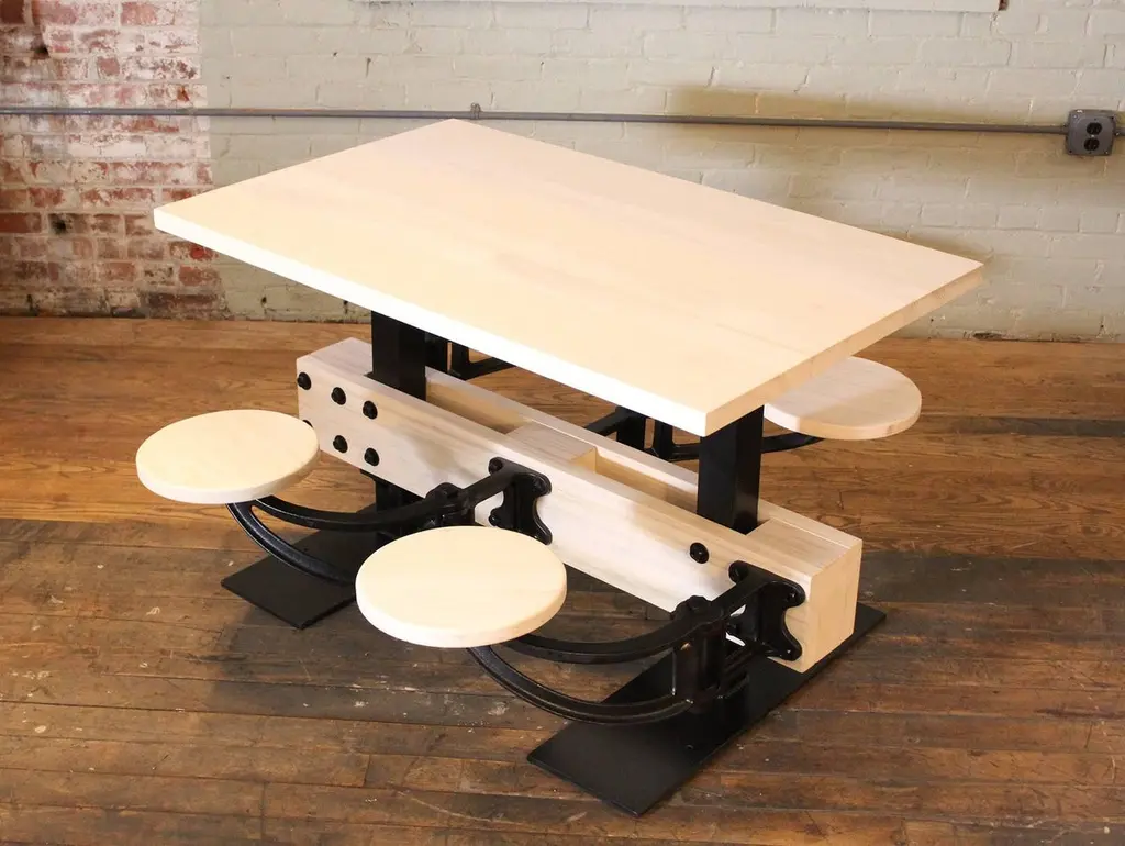 Vintage industrial cast iron, steel and wood swing out seat cafeteria style dining kitchen table. Shown in raw poplar wood. Can be made with oak, mahogany, walnut, etc. Cast iron swing out seat tops also come raw so they can be stained to match your decor. Top measures 1 1/4" thick, overall dimensions measure 30" in height, 30" in width, and 48" in length. Sizes can be customized, and metal and glass top are also available.