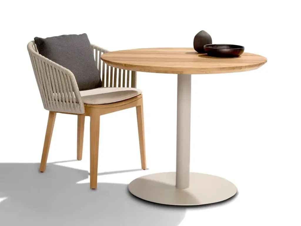 A slender, powdercoated tube supports the floating top of this elegant dining table, which is available in a round, oval and square version. The table top comes in three luxurious finishes: firstly, three shades of hand-glazed, 400-year old lava stone from Vesuvius, which mirrors the sky and is reminiscent of rippling water. For a contrasting look, smooth, solid, sustainably harvested teak. Lastly, there are five subtle, natural shades of ceramic. The stainless-steel frame is powder-coated in three subtle colours and the table is available in different lengths and heights.A slender, powdercoated tube supports the floating top of this elegant table, which is available in a round, oval and square version.