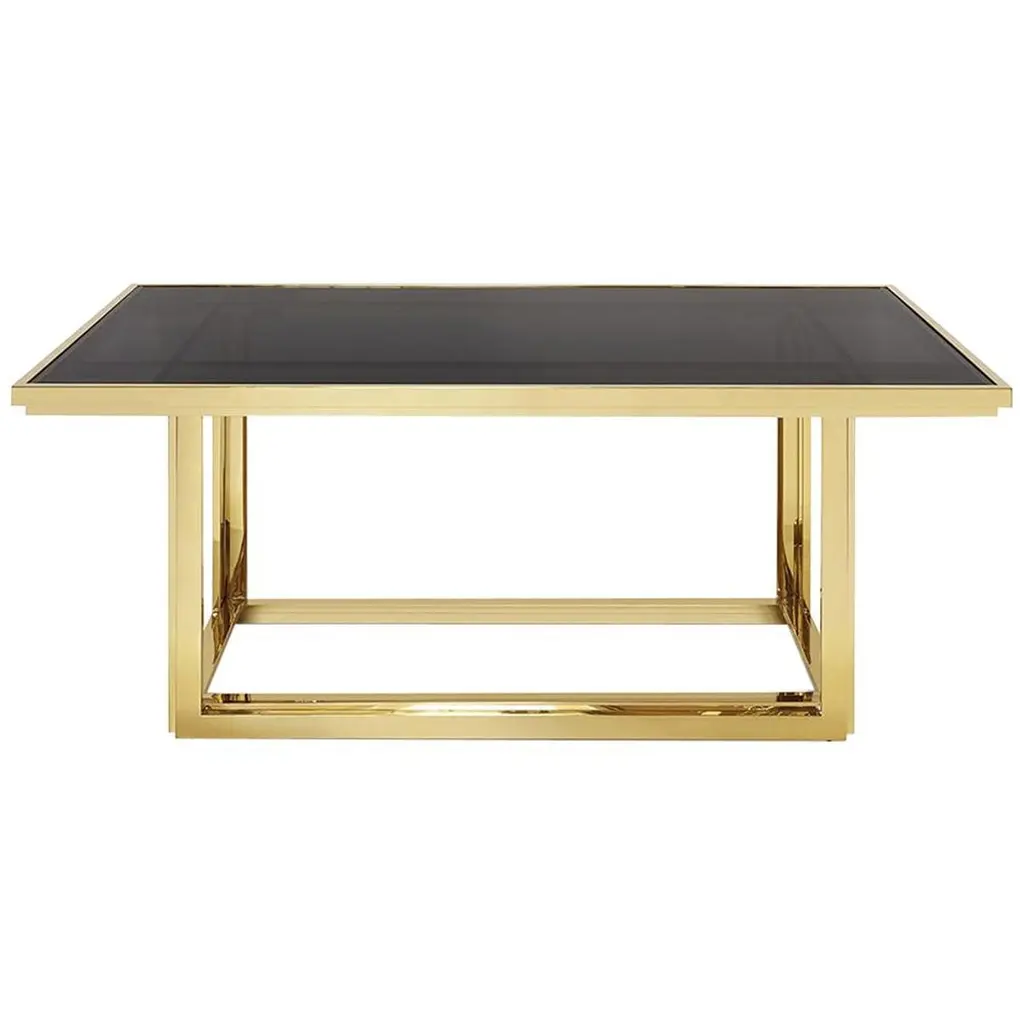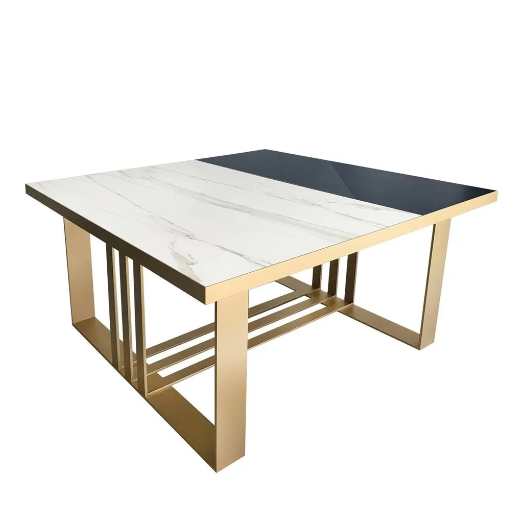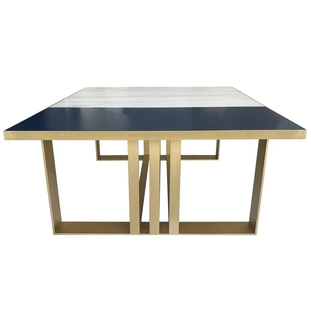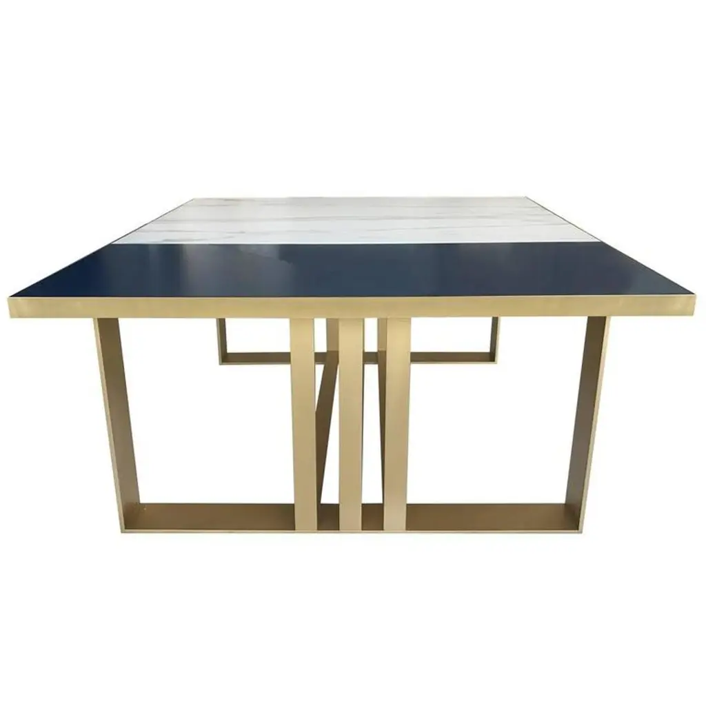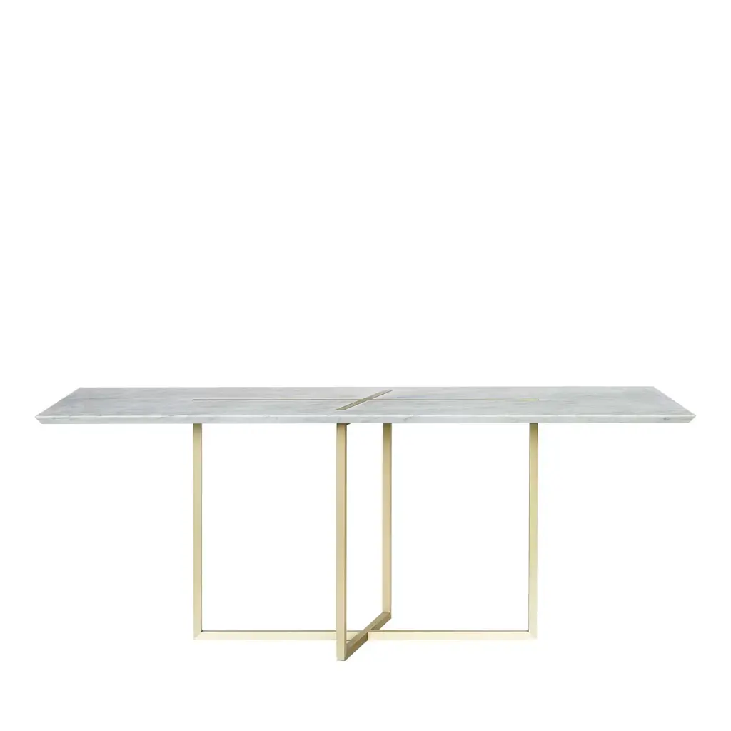 Sophisticated and timeless, this dining table will make a statement in any decor. It was made by expert artisans using a precious top in gold Calcatta marble that, with its light background and the signature golden veins, will add a luxurious touch to a dining room. Next to the marble, there are two elements colored in a peacock blue varnish, one polish and one opaque, that adds vivid hue and complements the brushed brass of the structure, with its geometric lines and open volumes.
