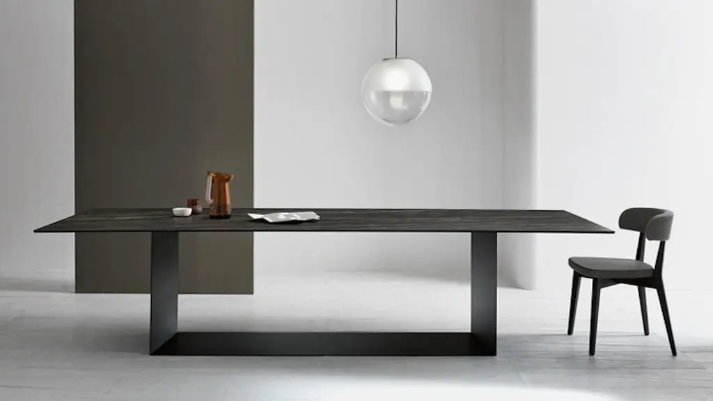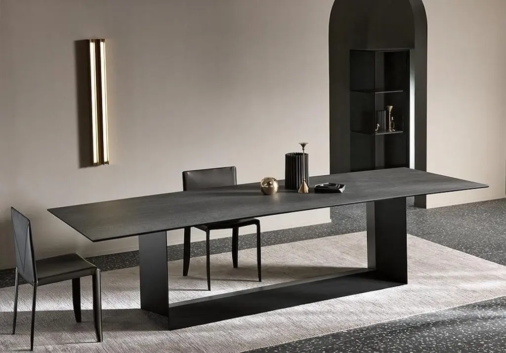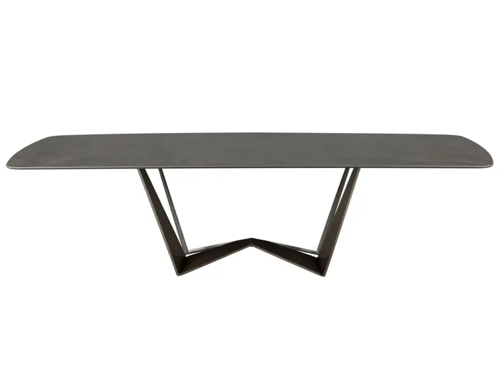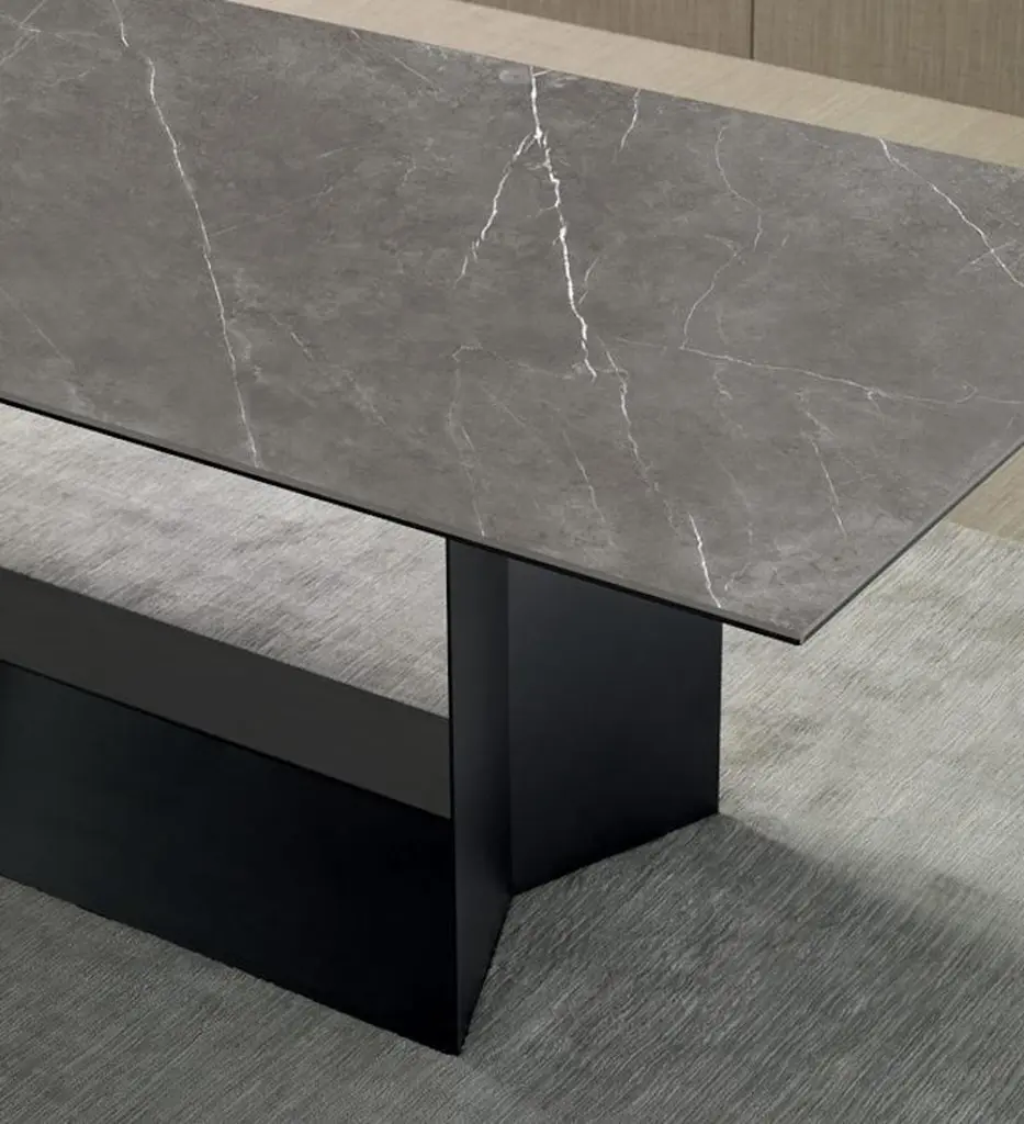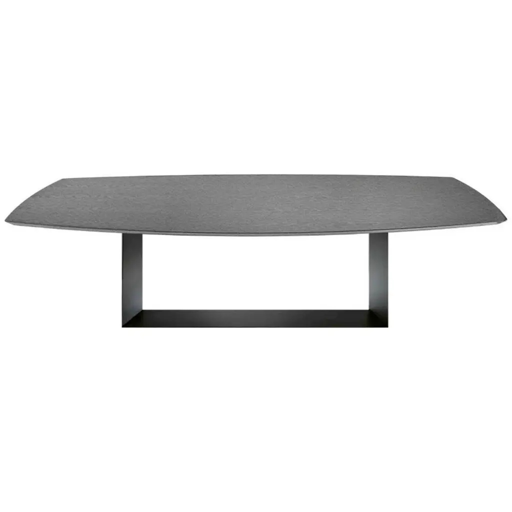 T5 Grey Dining table with anthracite ceramic matte top and lacquered Metal base in graphite black.Designed by Giulio ManciniThe hight table, suitable for studios, dining rooms and living areas, was conceived by designer Giulio Mancini. It is a dining table made of glass, fused glass or stratified ceramic on metal base. The stratified ceramic tops can be chosen among a range of matt or polished finishes, rectangular or shaped. The bases are available in brushed bronze graphite black, brushed Titanio, matalized champagne or matt white finish.