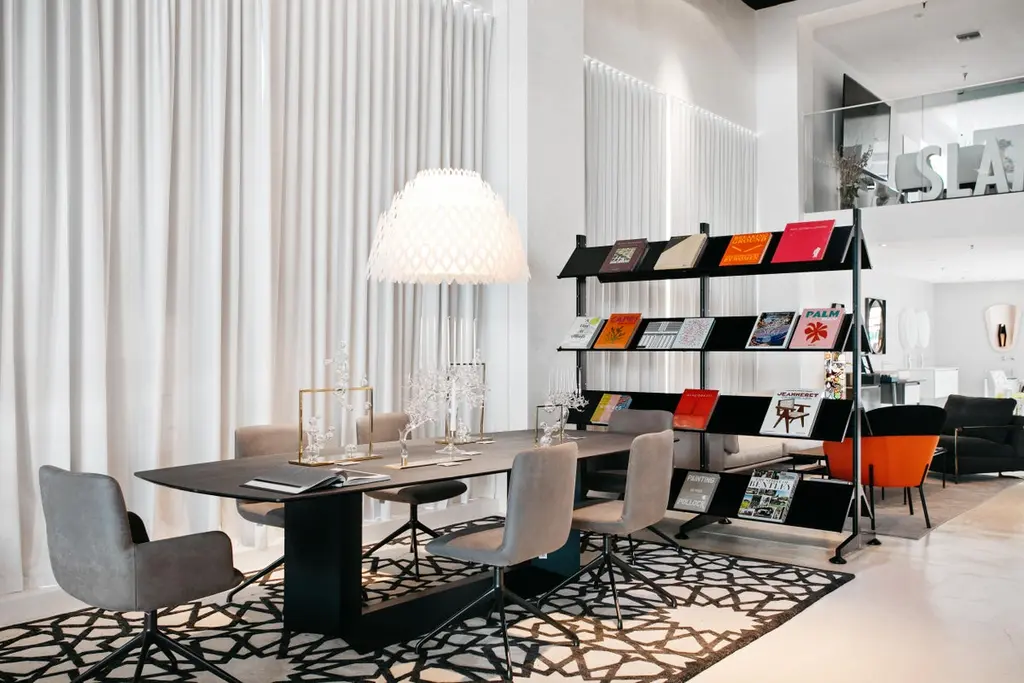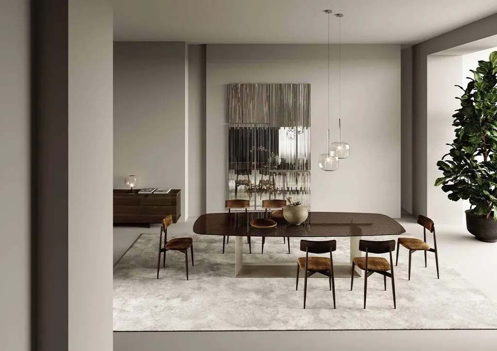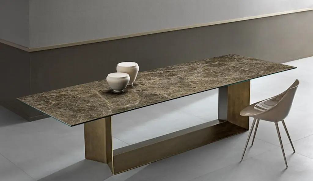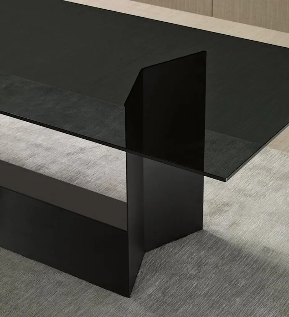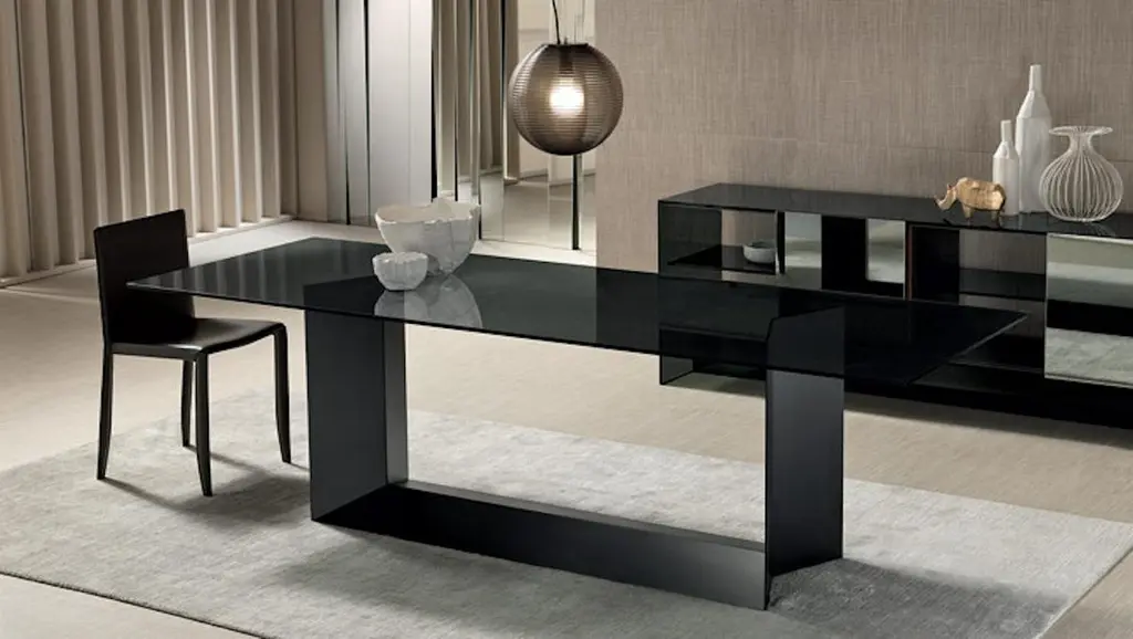 T5 Grey Dining table with anthracite ceramic matte top and lacquered Metal base in graphite black.Designed by Giulio ManciniThe hight table, suitable for studios, dining rooms and living areas, was conceived by designer Giulio Mancini. It is a dining table made of glass, fused glass or stratified ceramic on metal base. The stratified ceramic tops can be chosen among a range of matt or polished finishes, rectangular or shaped. The bases are available in brushed bronze graphite black, brushed Titanio, matalized champagne or matt white finish.