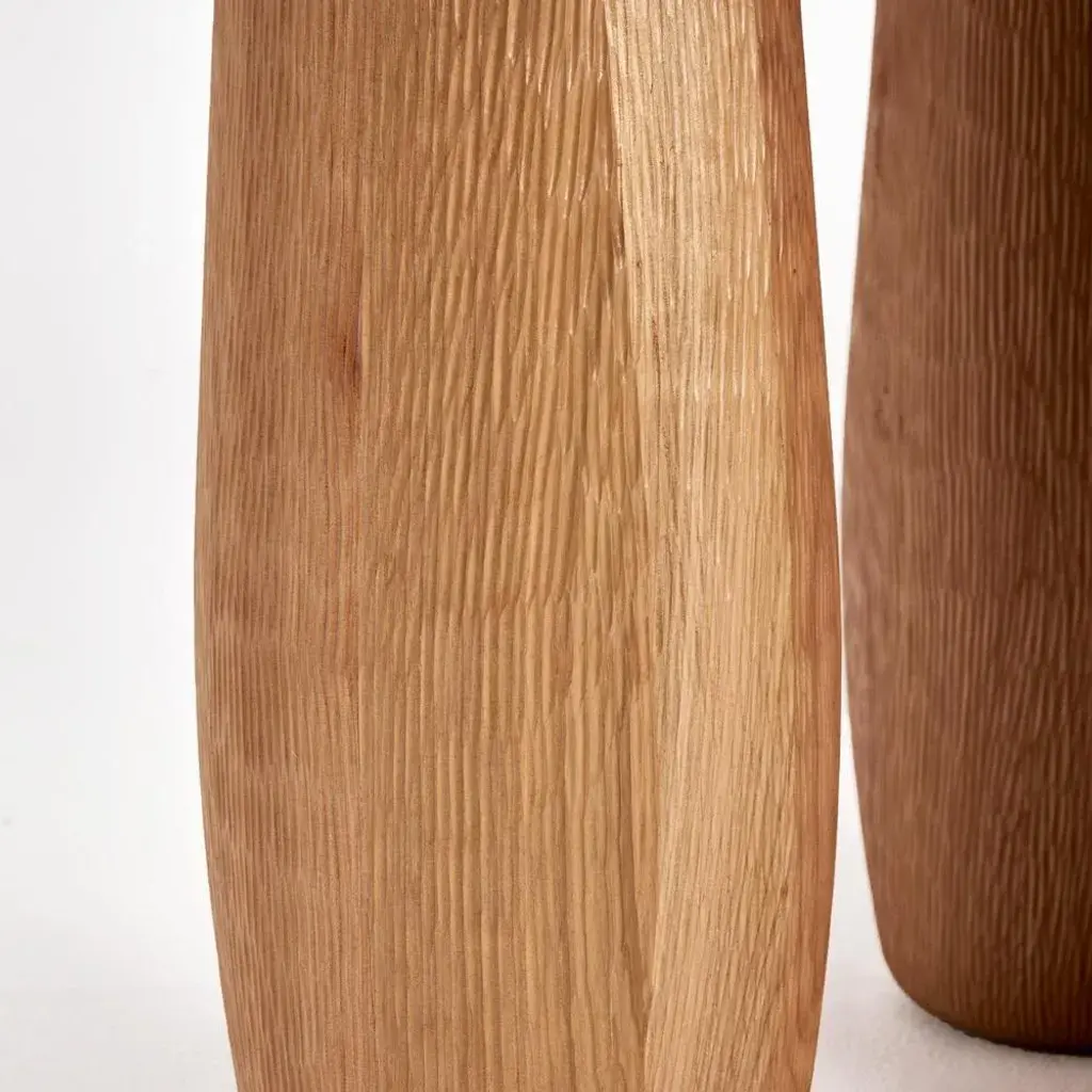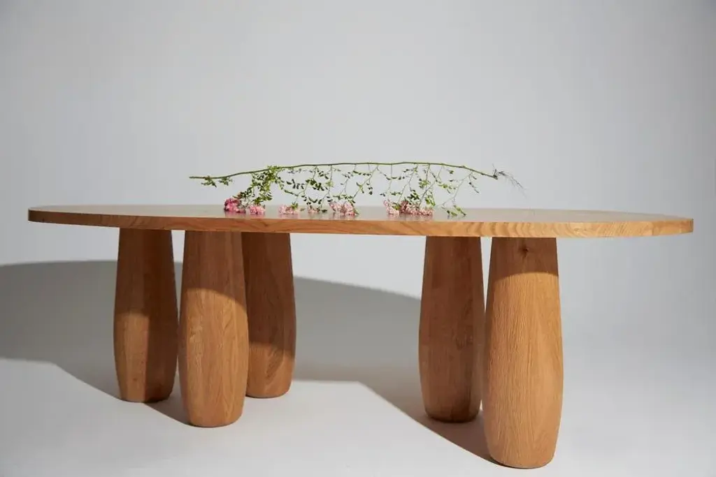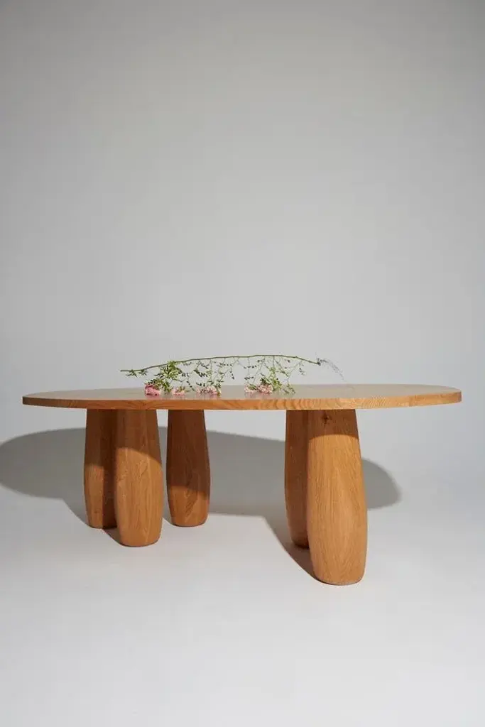 A table dining table by project 213a dimensions: d 117 x w 214.5 x h 76.5 cm materials: cherry wood. An asymmetric table top standing on five oval legs. Each segment carved from an individual piece of cherry wood to showcase the natural flow and texture of the wood with hand carved detailing. The table top features delicate jointing details along the edges and the legs. Project 213a is a european design house founded in 2020 as an idea by four friends linked by a common design philosophy. This project became reality with the launch in september 2021. The brand’s goal is to create modern as well as unique furniture and home accessories that are timeless with a commitment to work towards a more sustainable future. The name of the brand “project 213a” refers to a london based address where all four founders each have lived in - at different times throughout their studies. The building is featured prominently within the logo where their home stood, above a launderette. Each product is responsibly manufactured in selected portuguese factories and family run workshops to provide a considerate way of production while minimising wasteful practices.