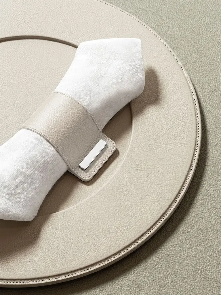 The napkin holder, designed by Giobagnara for Poltrona Frau, is a sophisticated yet understated flat strip of Pelle Frau® leather, enclosed by a linear steel element. Available in various colors, it adds a modern touch of elegance to the everyday dining table.The Tableware Collection, created in cobranding with Giobagnara, is a family of coordinated dining table accessories, designed to add a sophisticated and precious touch to even the simplest dinner party. The collection offers a wide range of elegant and practical elements to enrich the social gathering, all upholstered in Pelle Frau® leather and meticulously handcrafted down to the finest of details. The Tableware Collection accessories evoke a warm and inviting atmosphere and a spirit of hospitality, reflecting thoughtfulness and consideration for others, enhancing the pleasure of every dining experience.