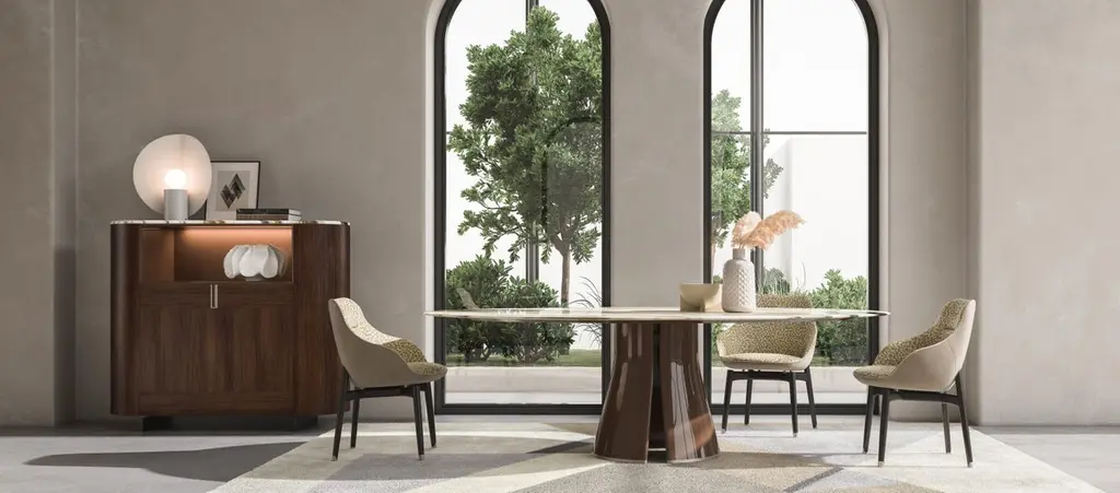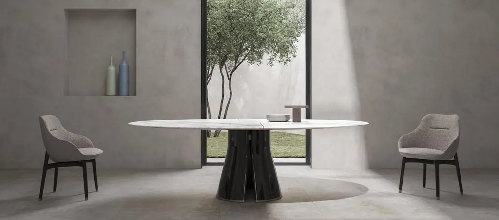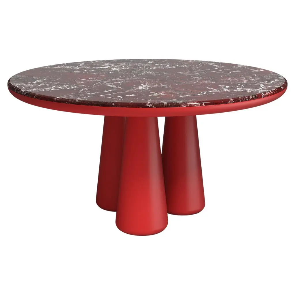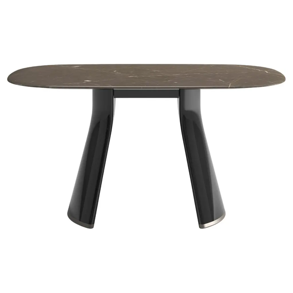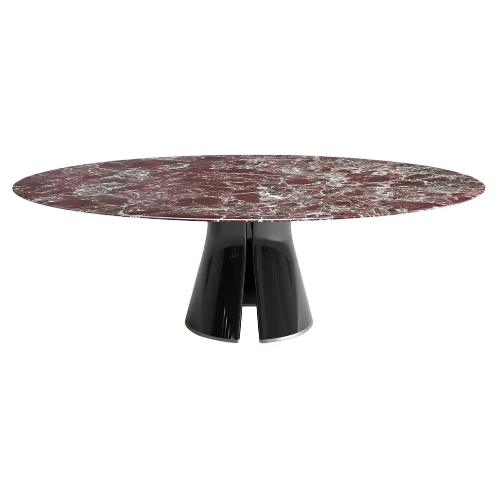 A round lounge table featuring a marble top and lacquered legs combines elegance with modern design. The smooth, polished marble surface showcases unique veining patterns, adding a touch of luxury to any space. The lacquered legs, available in various finishes, provide a sleek and durable support, enhancing the table's contemporary appeal.