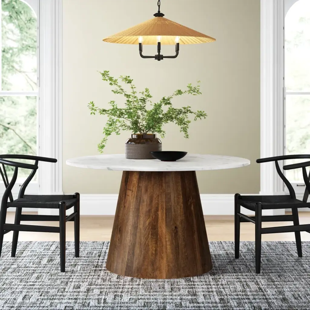 Modern design and rustic charm unite with this solid wood and genuine marble dining table. Handcrafted for timeless quality, the white marble top contrasts with the natural tones of the mango wood pedestal base to create a stunning accent piece ideal for a variety of décor styles. Measuring 48" in diameter this dining table is the perfect balance of simplicity and bold design. Pair with our matching Tamia coffee table to make it a complete set.