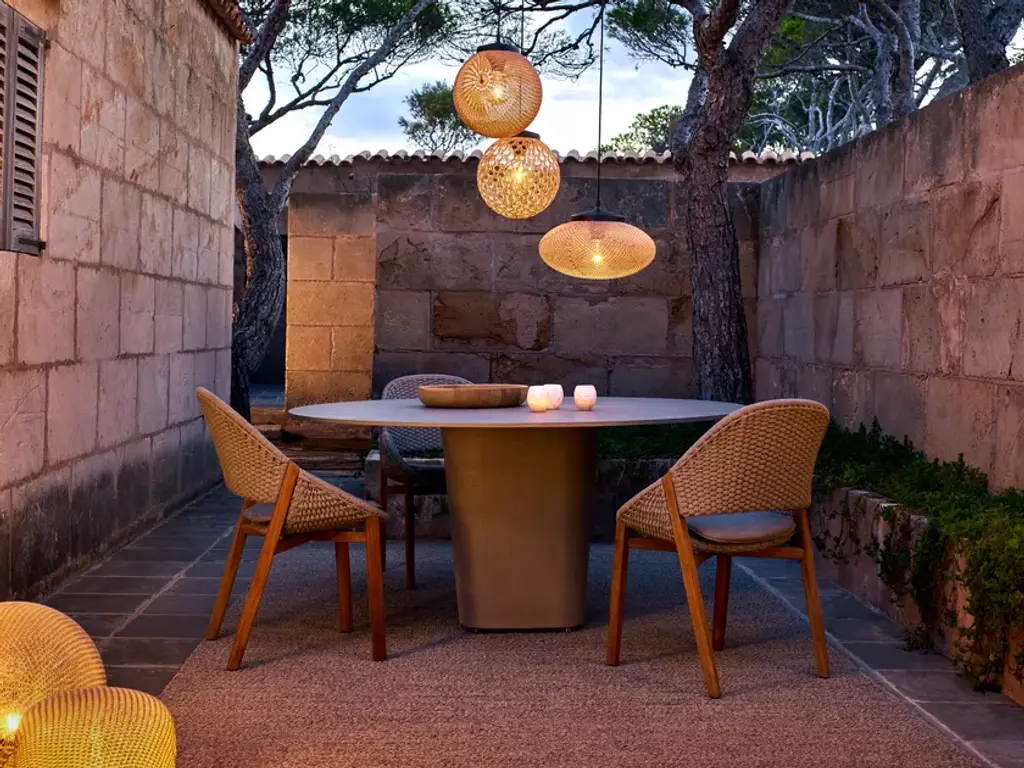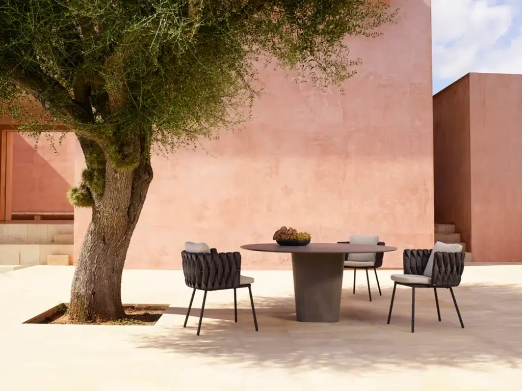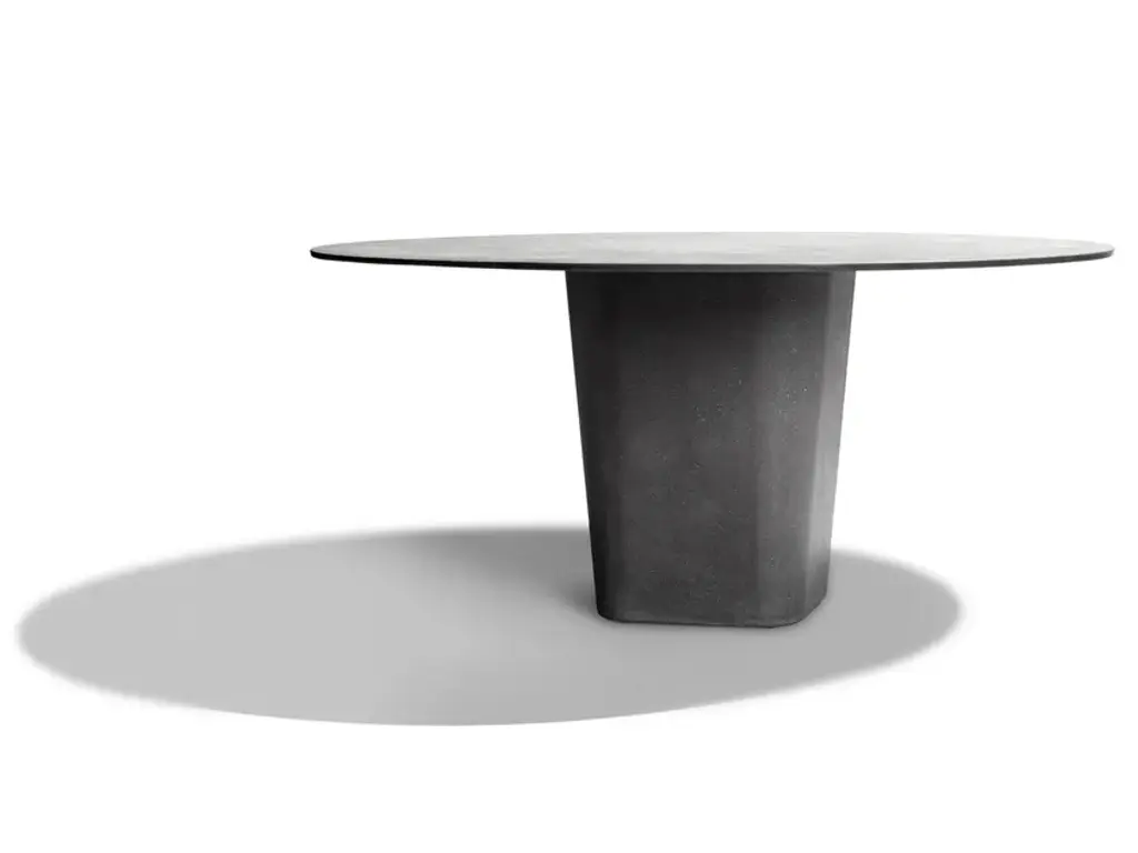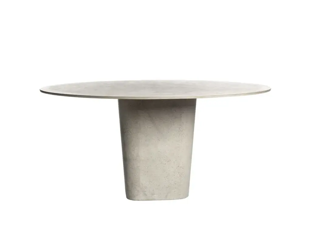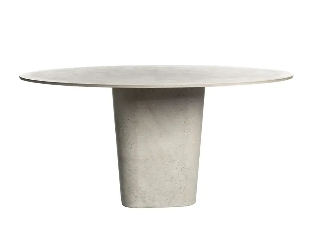 The dining table has a central pedestal, which supports a finely milled round table top. The dining table is available in concrete linen and concrete wengé.https://www.tribu.com/en/collections/tao/dining-table/The elegant Tao table collection is a lesson in perfectly balanced contrasts – bold sculptural pedestals and slim table tops that are pleasing to the touch. Designer Monica Armani has used refined lightened concrete to give a look of elegant solidity.