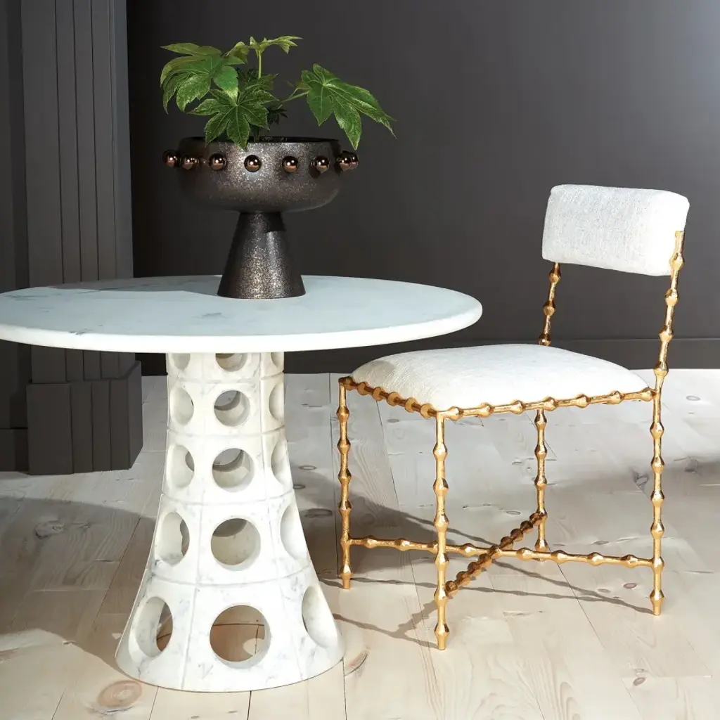 Solid marble, this tapered shape dining table is a modern update for any interior. From a fashion forward perspective, Global Views offers accessories, furniture, statement lighting, and an assortment of rugs and mirrors to add beauty and joy to your home.