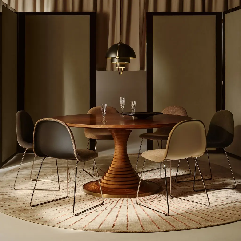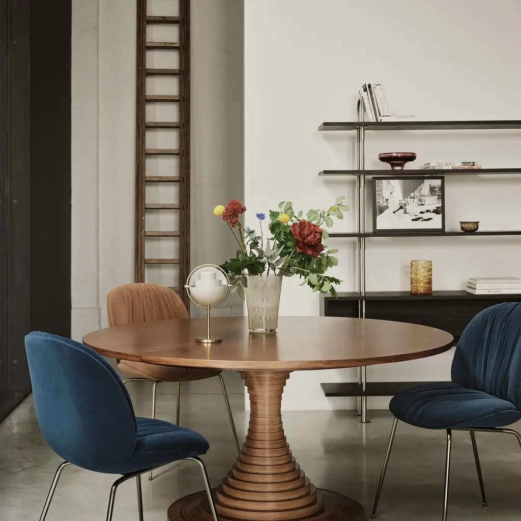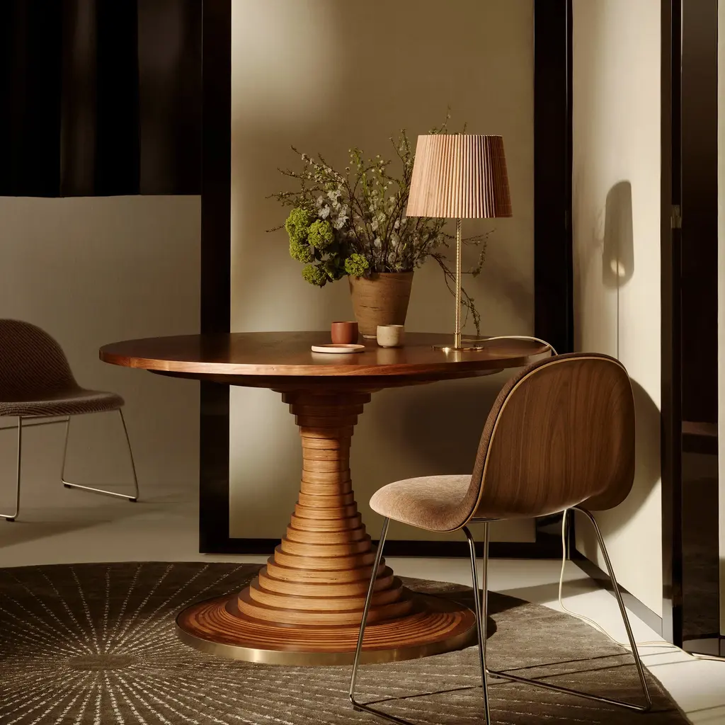 The Tavolo a Dischi Dining Table from Gubi, is a masterpiece by Italian architect Carlo De Carli, blending innovative design with timeless elegance. The designer response to the iconic Saarinen Pedestal Table, its structure features layered FSC-certified birch plywood discs around a hidden metal core, creating a graceful curved form topped with a walnut veneer surface. The burnished brass-toned steel band at the base offers refined contrast and added durability. Available in two sizes, this versatile round table is ideal for dining, meetings, or gatherings, making it a distinguished centerpiece in any sophisticated setting. Highlights