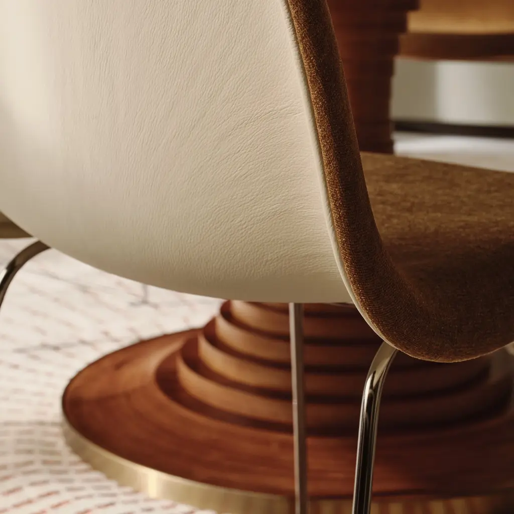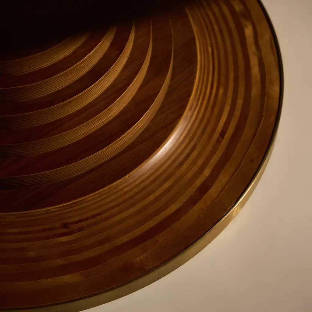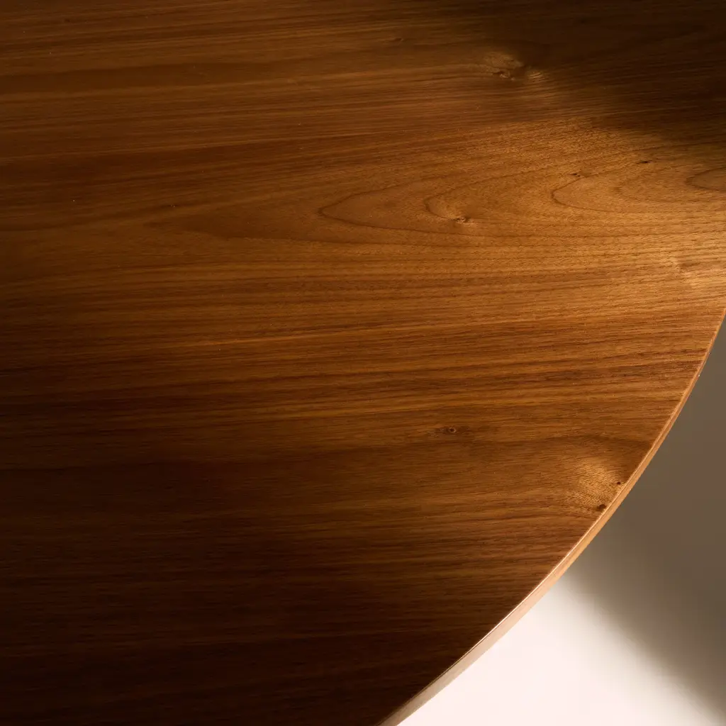 The Tavolo a Dischi Dining Table from Gubi, is a masterpiece by Italian architect Carlo De Carli, blending innovative design with timeless elegance. The designer response to the iconic Saarinen Pedestal Table, its structure features layered FSC-certified birch plywood discs around a hidden metal core, creating a graceful curved form topped with a walnut veneer surface. The burnished brass-toned steel band at the base offers refined contrast and added durability. Available in two sizes, this versatile round table is ideal for dining, meetings, or gatherings, making it a distinguished centerpiece in any sophisticated setting. Highlights