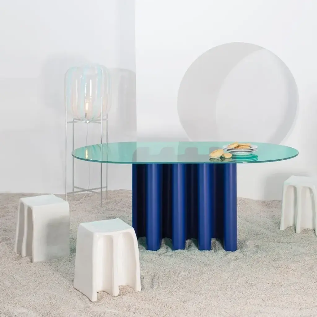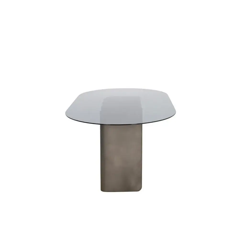Tavolo2 smoky grey dining table by Pulpo Dimensions: D180 x W100 x H75 cm Materials: glass, aluminum All color combinations available on request. Clear lines, avantgarde shape: Julia Chiaramonti’s design philosophy is inspired by the material’s distinctiveness. The base of tavolino2 side table and tavolo2 dining table is made of powder-coated or lacquered aluminum waves tamed by a glass top available in four different colors: lemon, rose, green and parsol grey. The solid base comes in beige red, fango green, ultramarine blue and smoky grey.