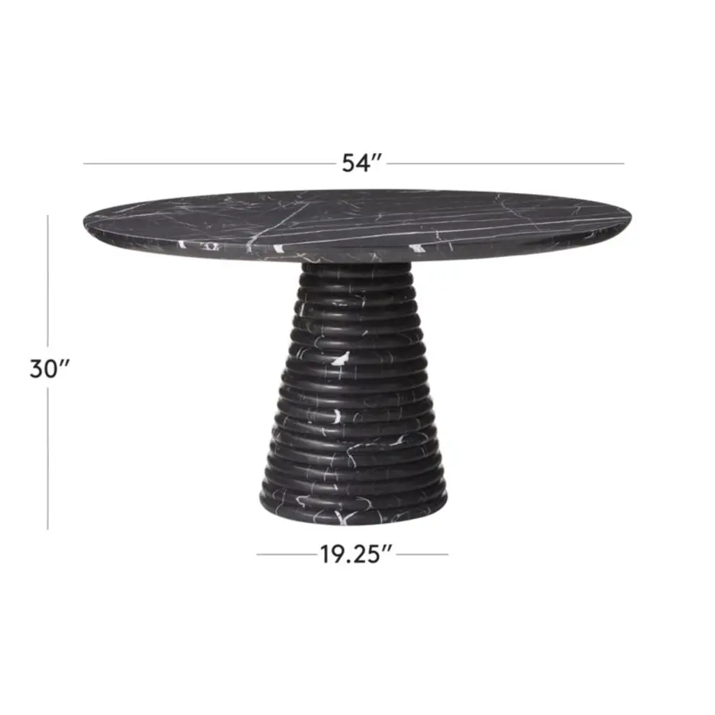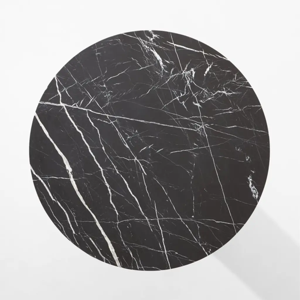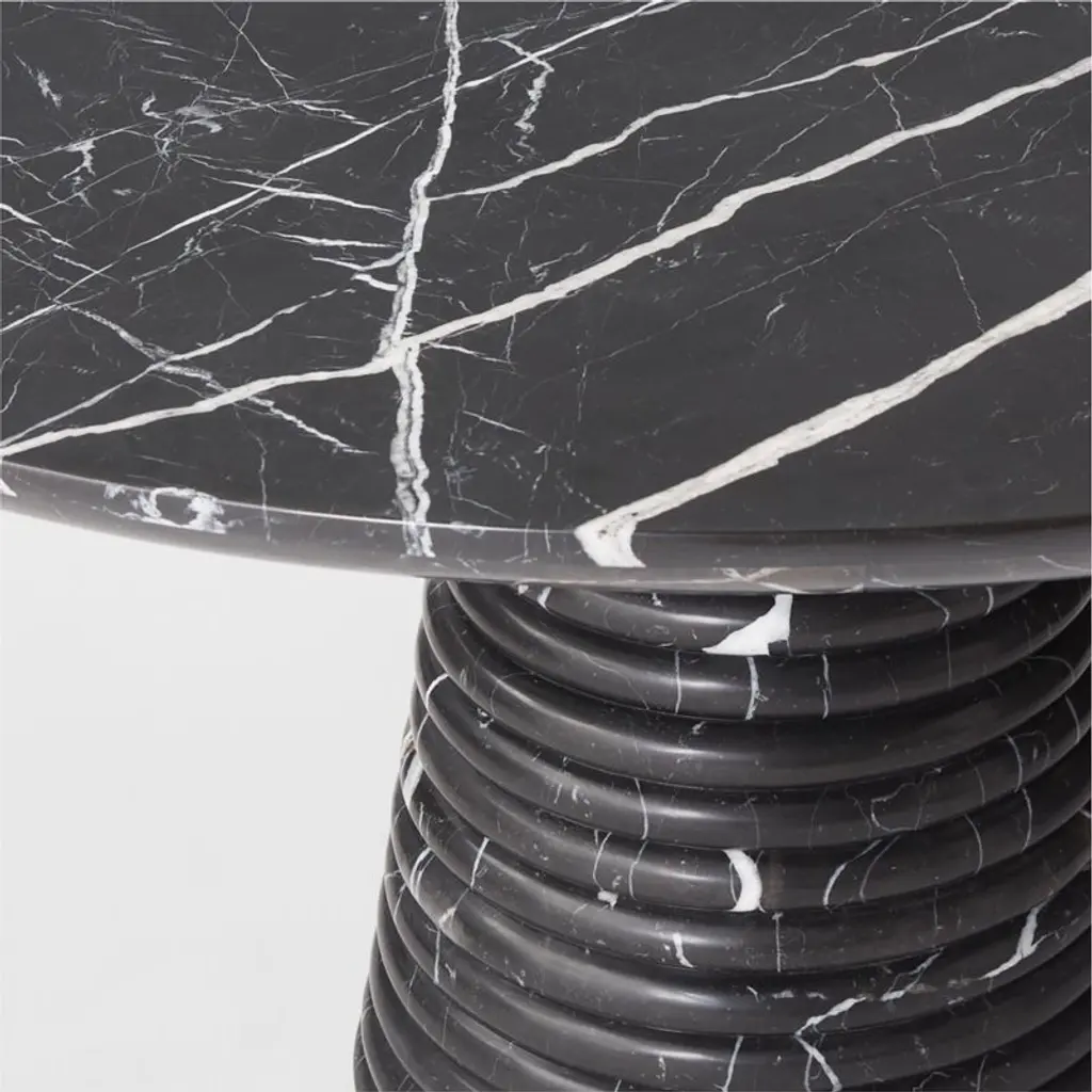 Defined by sculptural curves, round dining table from Barcelona-based Mermelada Estudio captures the bold veining of Marquina black marble. The carved pedestal base gradually tapers to the floor, serving as a rich counterpoint to the smooth marble top. Tabletop is finished with a reverse half-bullnose edge. CB2 exclusive.