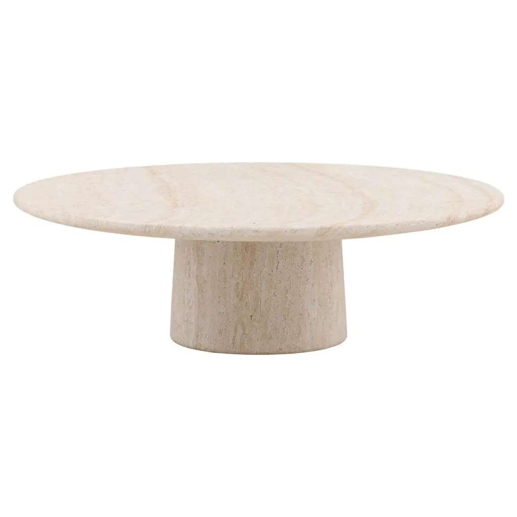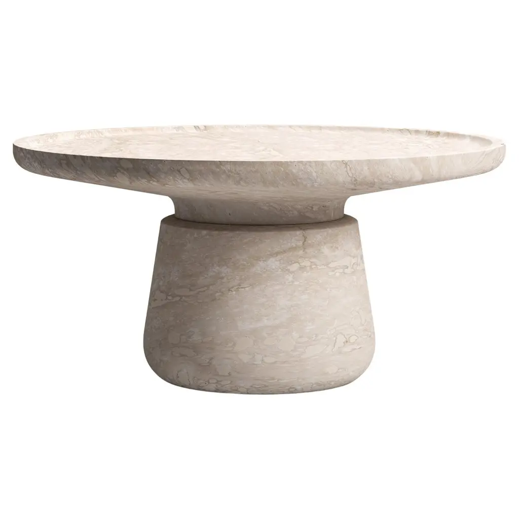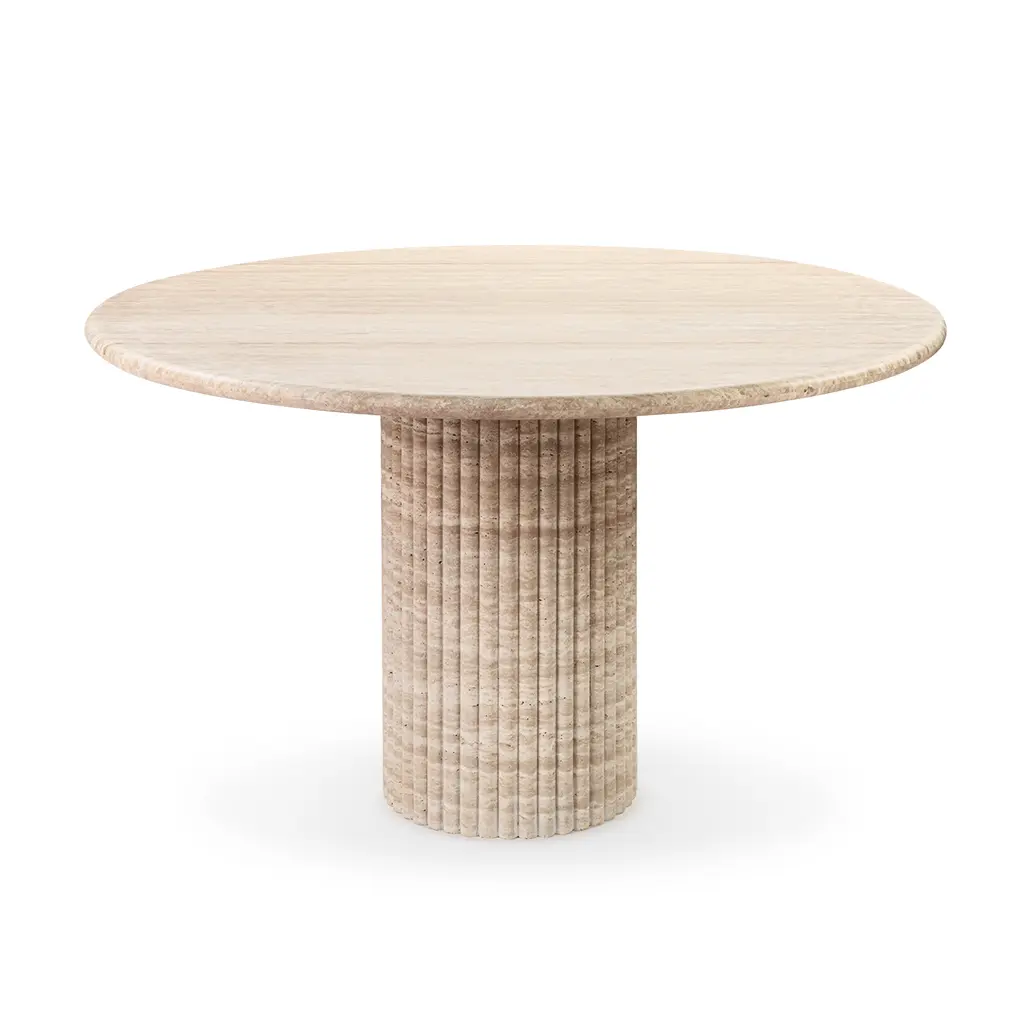Defined by sculptural curves, round dining table from Barcelona-based Mermelada Estudio captures the warm striations and natural pitting of Turkish travertine. Supported by a carved pedestal base that gradually tapers to the floor, the travertine top is finished with a reverse half-bullnose edge. CB2 exclusive.