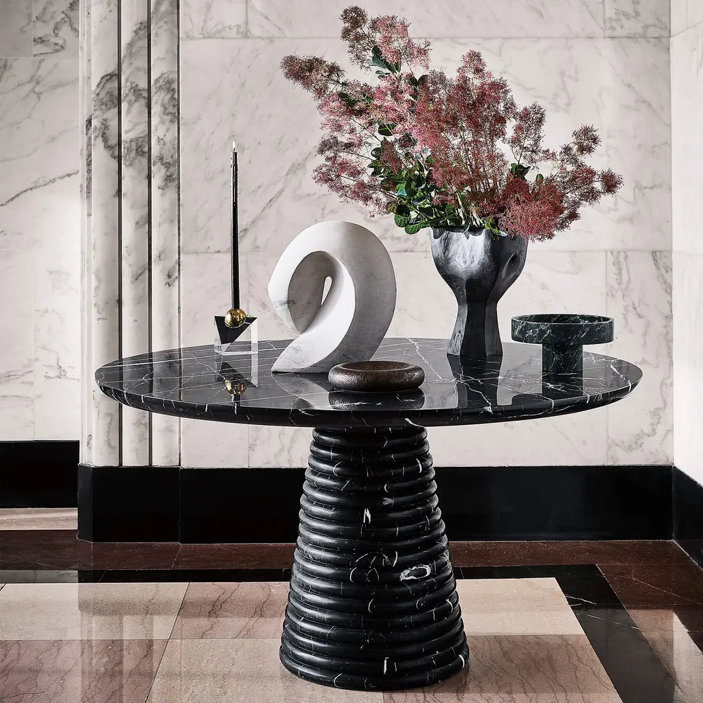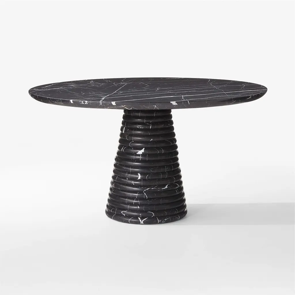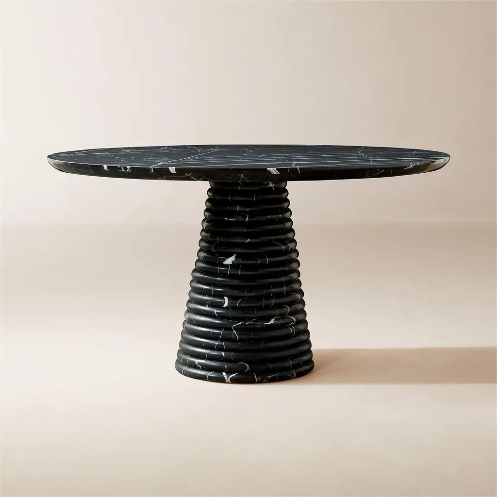 Defined by sculptural curves, round dining table from Barcelona-based Mermelada Estudio captures the bold veining of Marquina black marble. The carved pedestal base gradually tapers to the floor, serving as a rich counterpoint to the smooth marble top. Tabletop is finished with a reverse half-bullnose edge. CB2 exclusive.